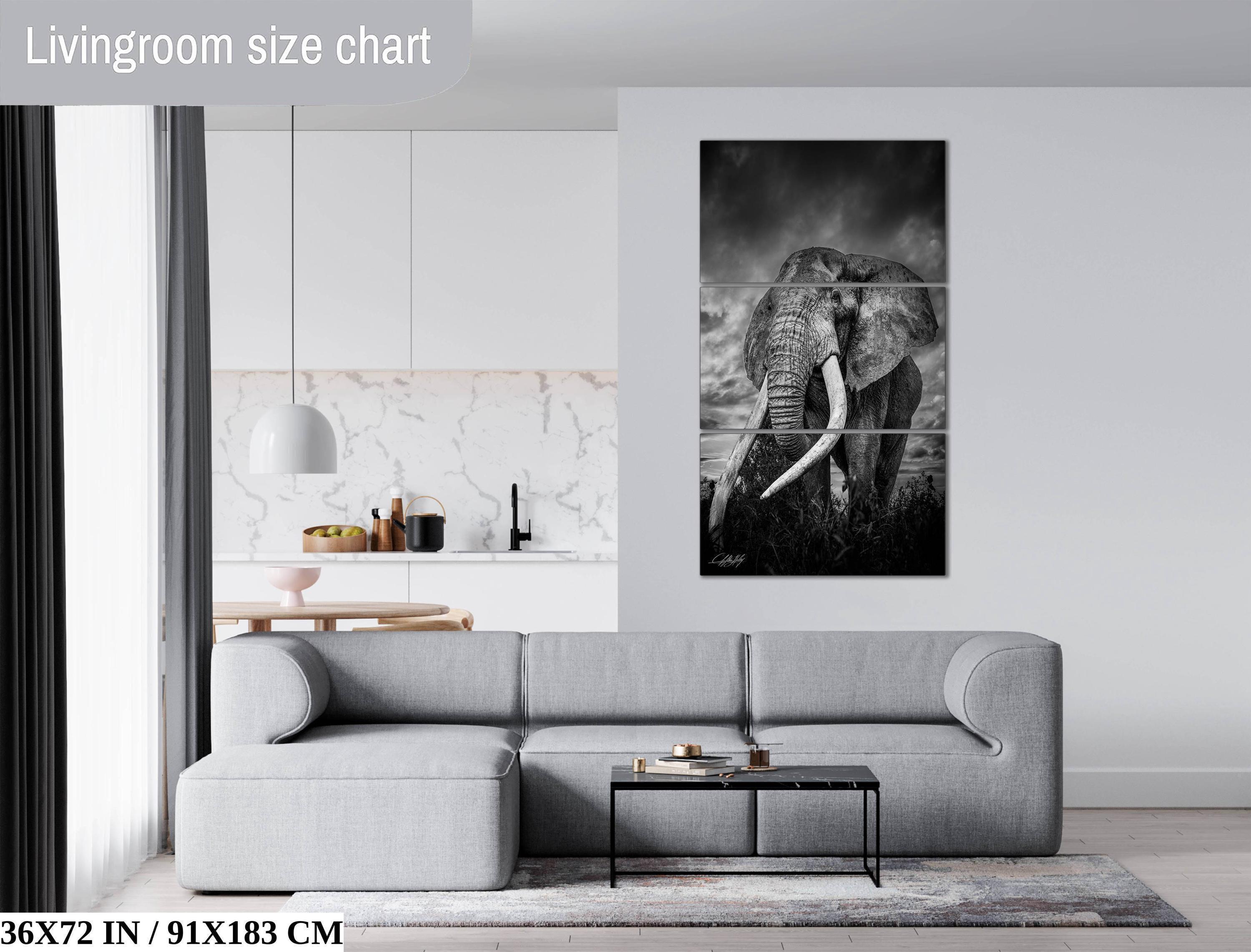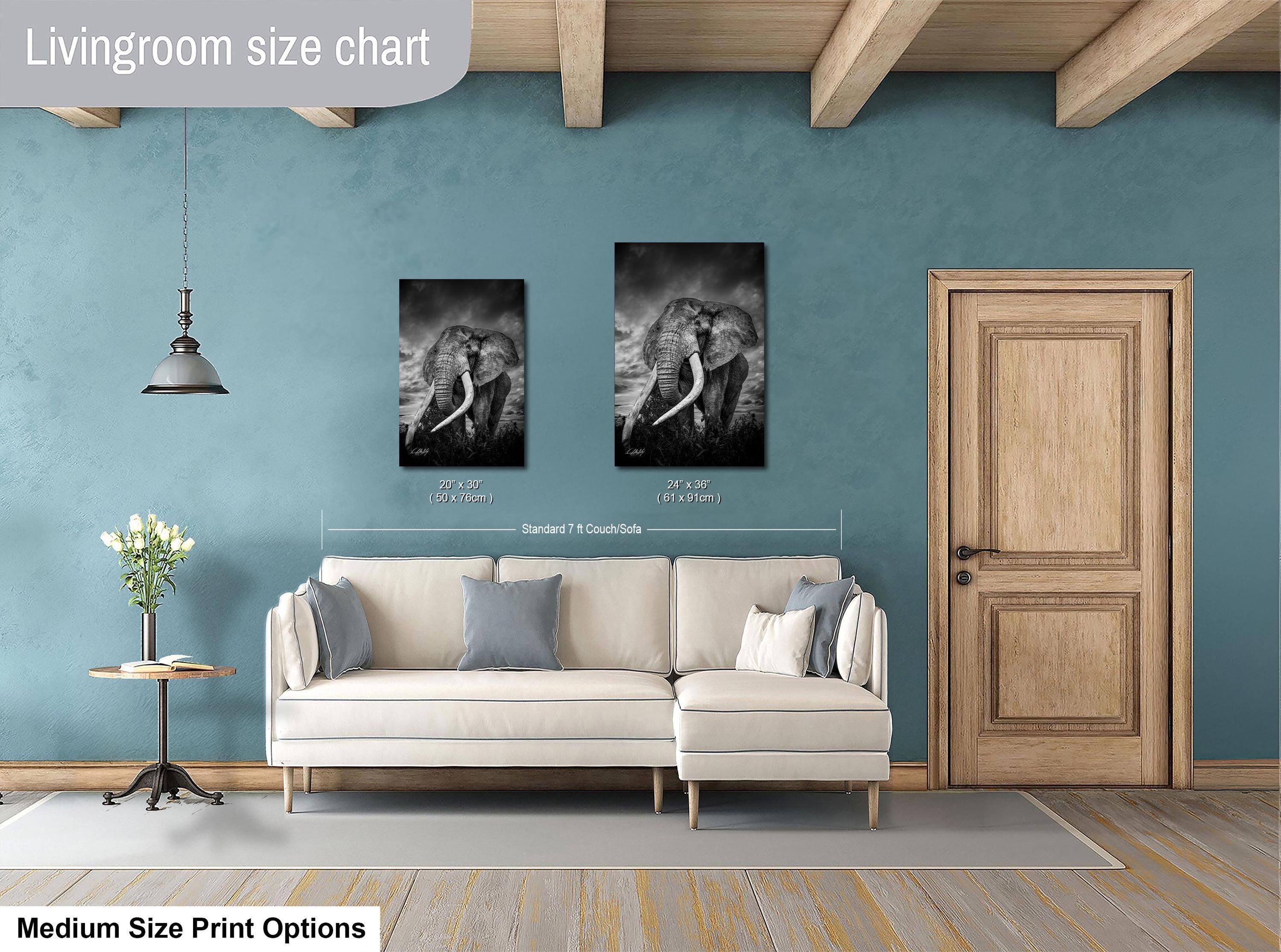 • Made to order: Each piece is custom created just for you, ensuring a unique and personal hand signed artwork. • Materials & presentation: Canvas prints are flush mounted without a mat border; framed paper, acrylic, and metal prints include a 2" white mat border for elegant display. • Size & details: Large animal canvas featuring intricate details that highlight Craig’s grandeur and the vibrant Kenyan sunset backdrop. • Authenticity guaranteed: Artist’s signature on every print adds a personal touch and certifies its originality.