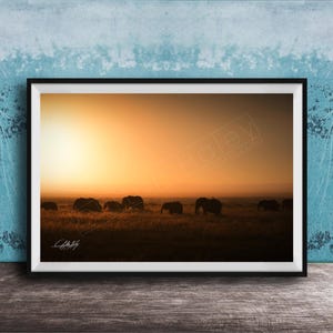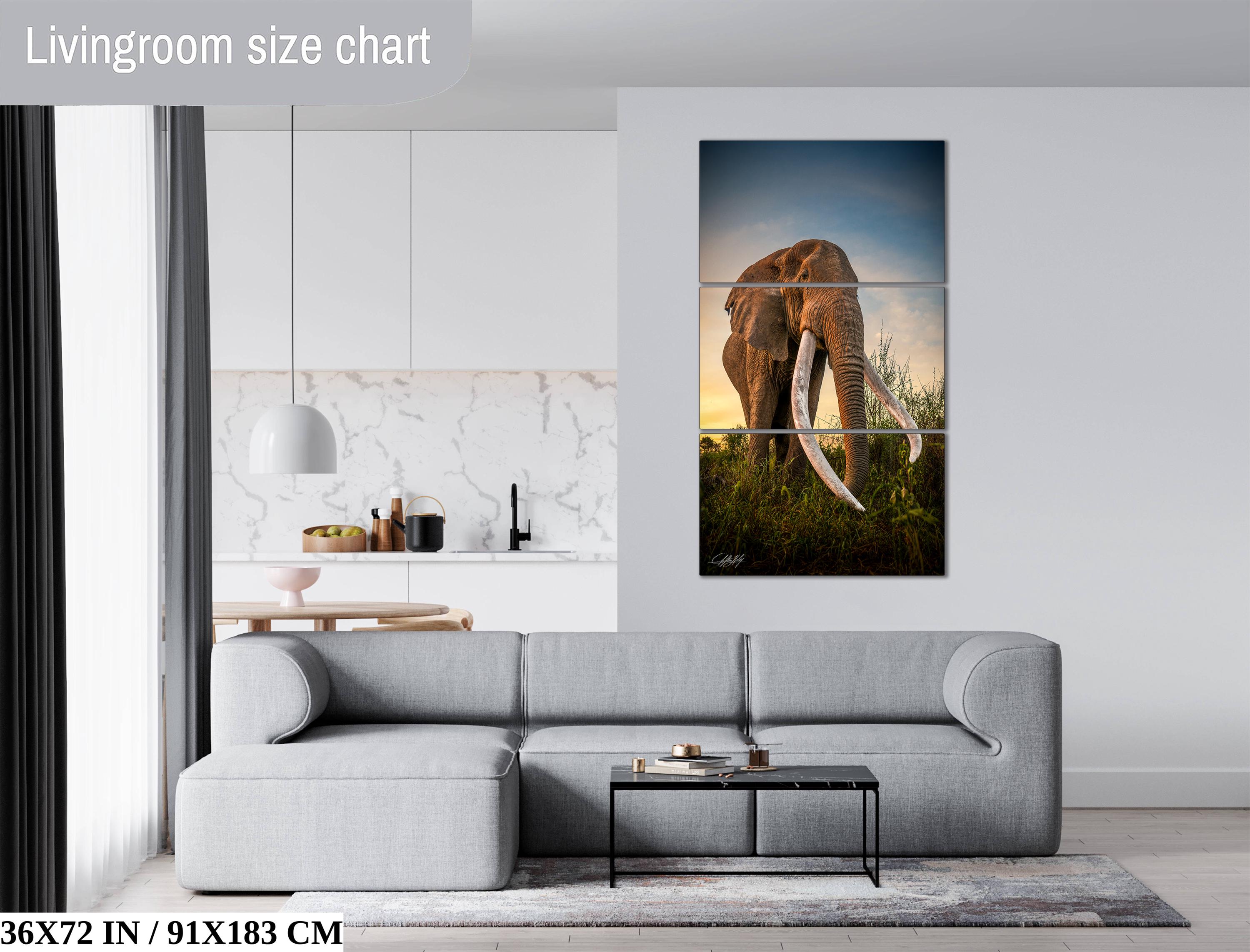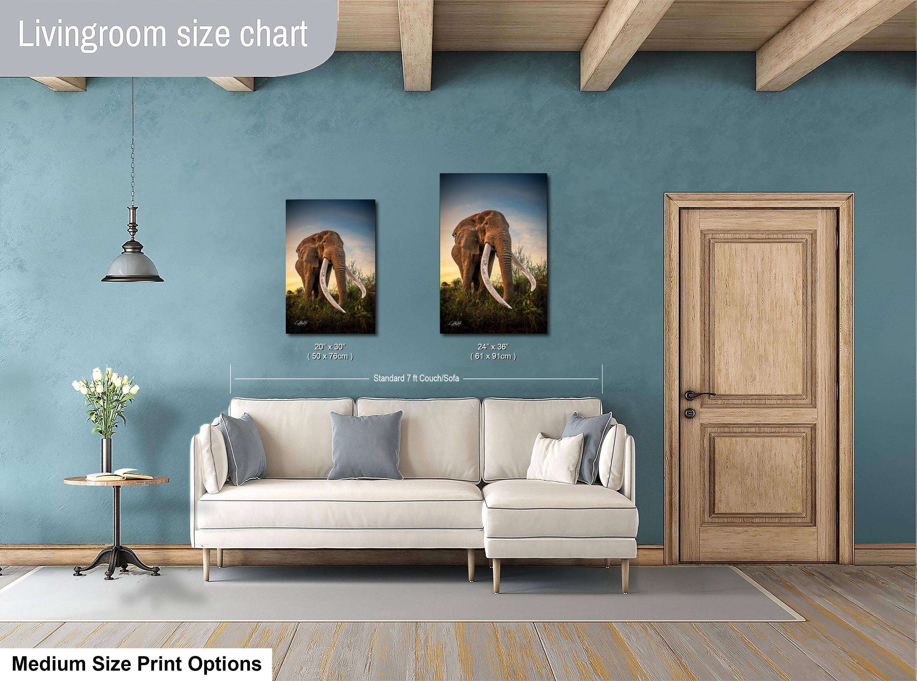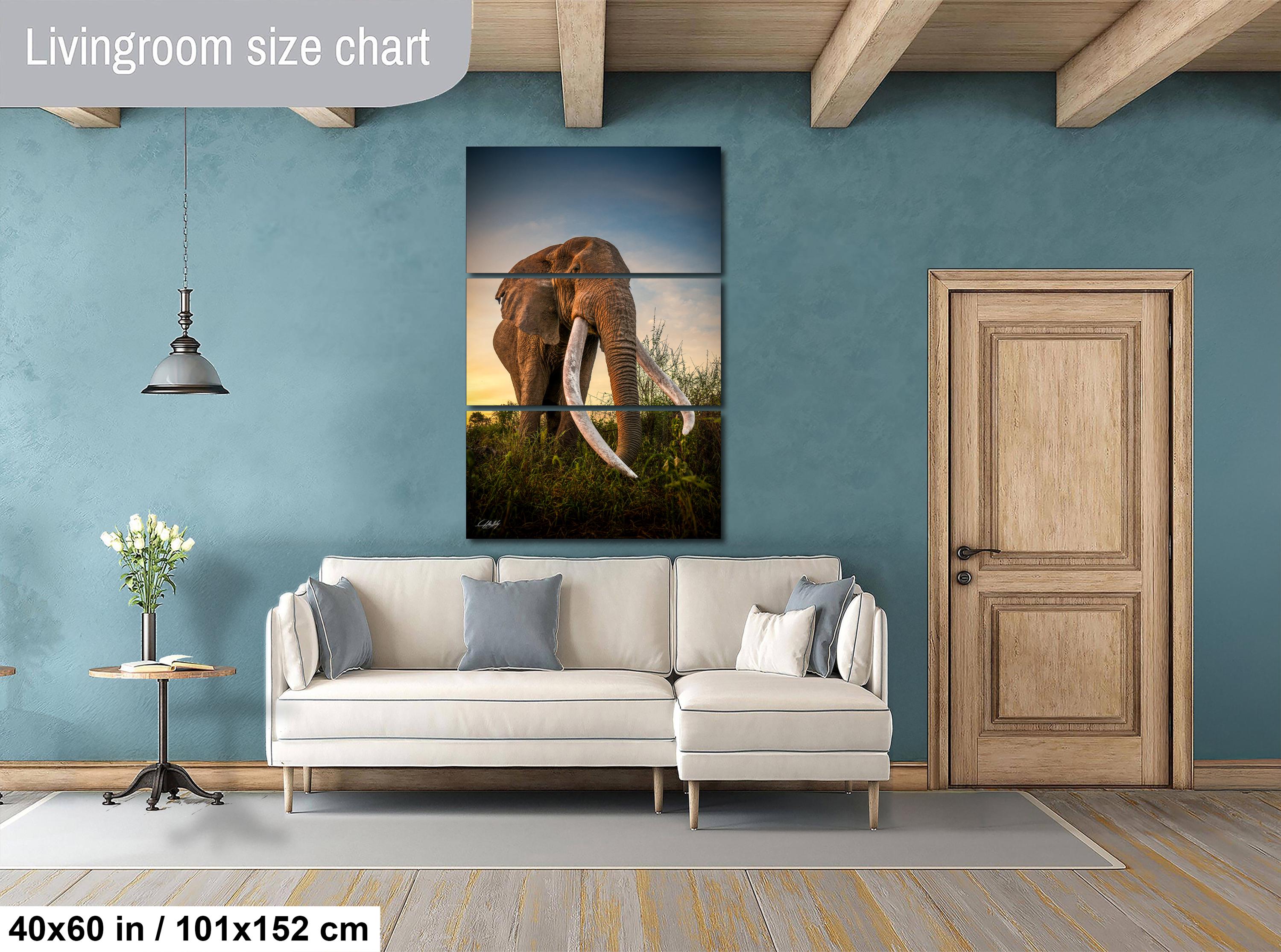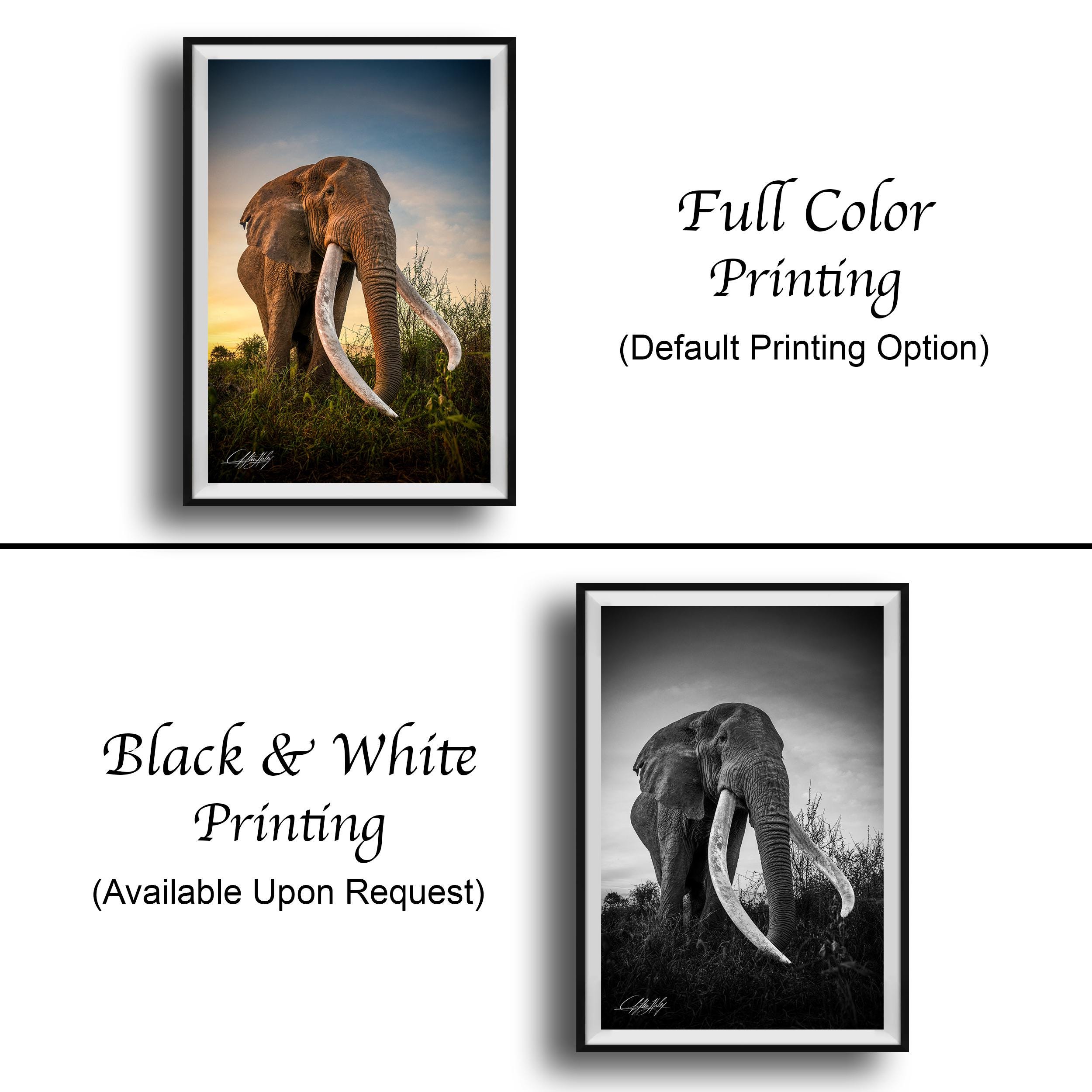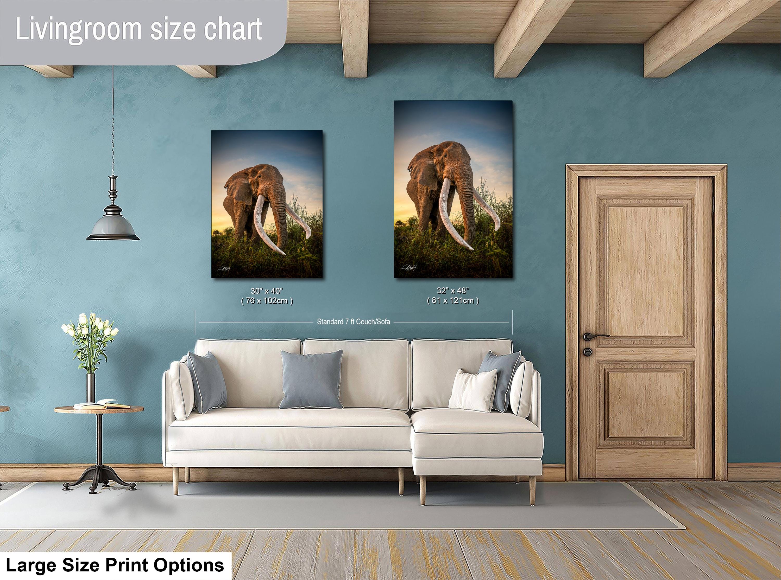 • Hand-signed artwork authenticates every print, adding value and a personal connection to the artist’s vision. • Available as framed paper prints, acrylics, aluminum/metal prints with a 2" white mat border, or canvas prints with a flush-mounted frame for a sleek finish. • Dimensions and customization options are available upon request to perfectly suit your space. • This large animal canvas portrays Craig, a rare big tusker elephant with tusks over 45 kilograms each, set against the vibrant Kenyan sunset—a tribute to Amboseli National Park’s iconic wildlife.