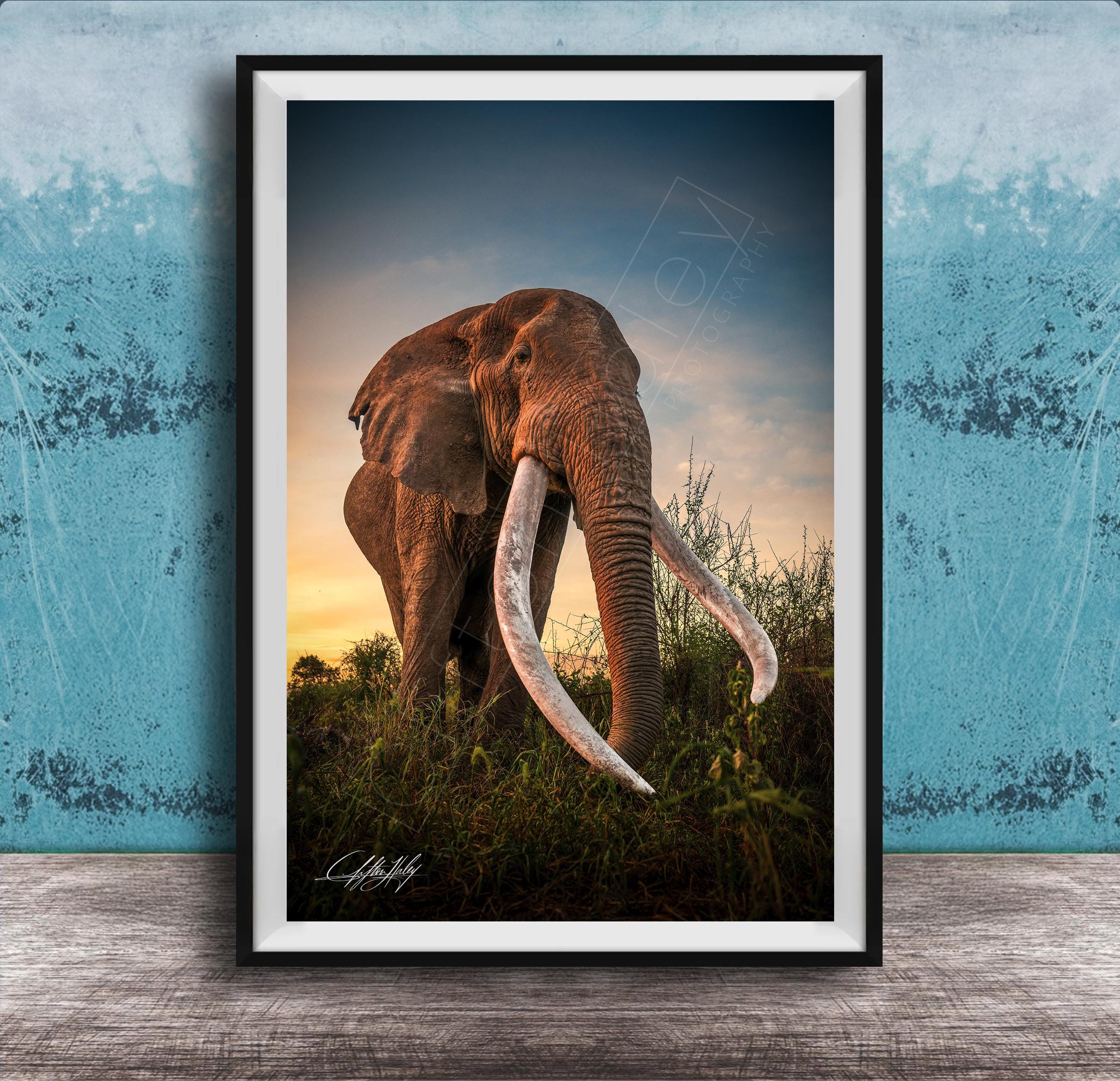Experience the majestic allure of the big tusker elephant Craig in this stunning safari decor art print, capturing the golden hue of a Kenyan sunset and Maasai culture.