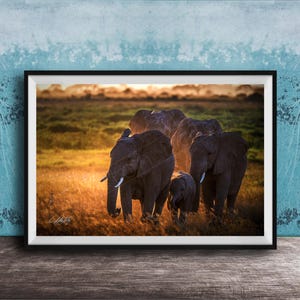 Experience the majestic allure of the big tusker elephant Craig in this stunning safari decor art print, capturing the golden hue of a Kenyan sunset and Maasai culture.