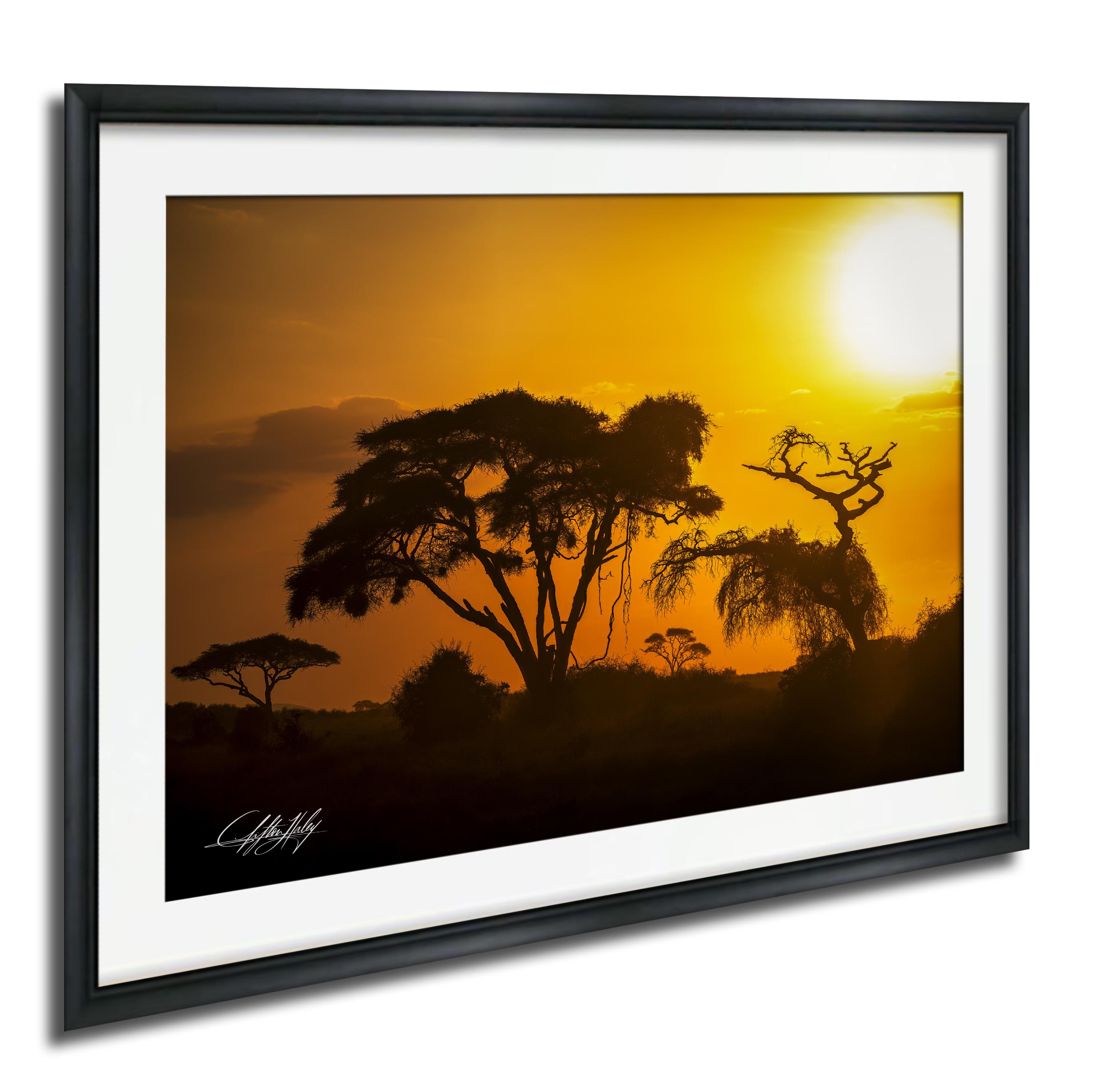 Experience the magic of the African savannah with this Acacia Tree metal print—an inspiring safari wall art capturing golden dusk and the spirit of Kenya's wildlife.
