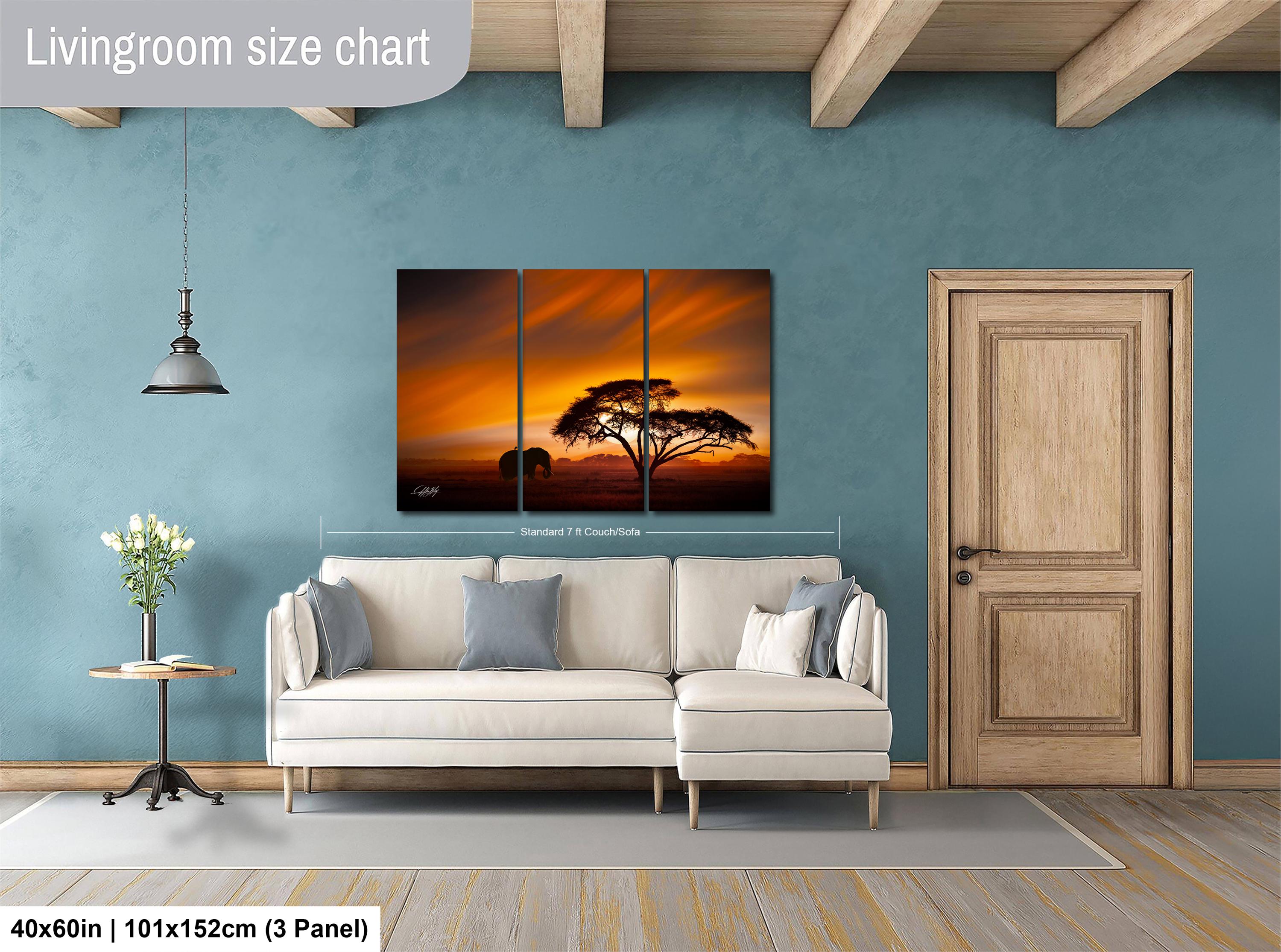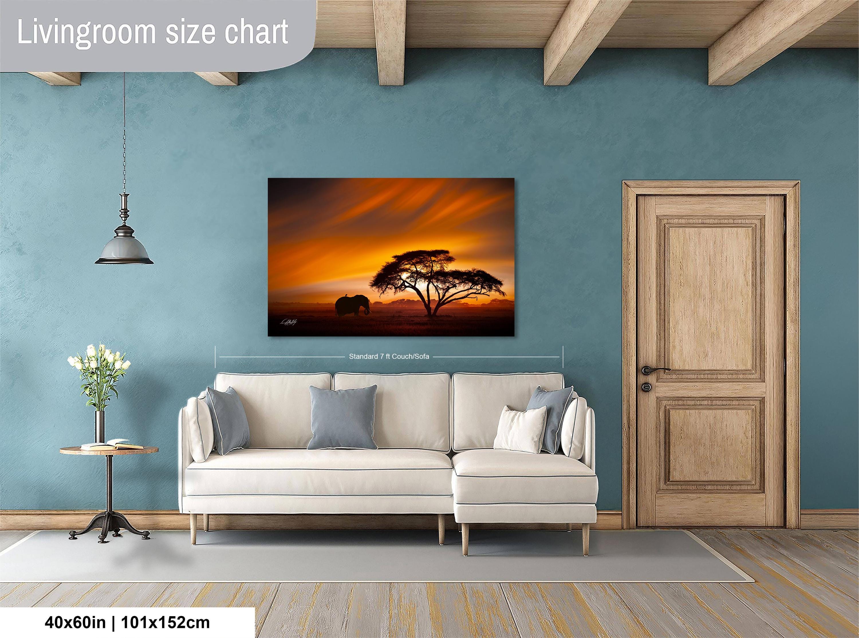 Elephant Acacia wall art brings the serene beauty of the African savannah into your living space, capturing the majestic tusker elephant beneath a glowing Kenya sunset. This boho wall art embodies the timeless grace of nature, making it a perfect safari home decor accent for any room.