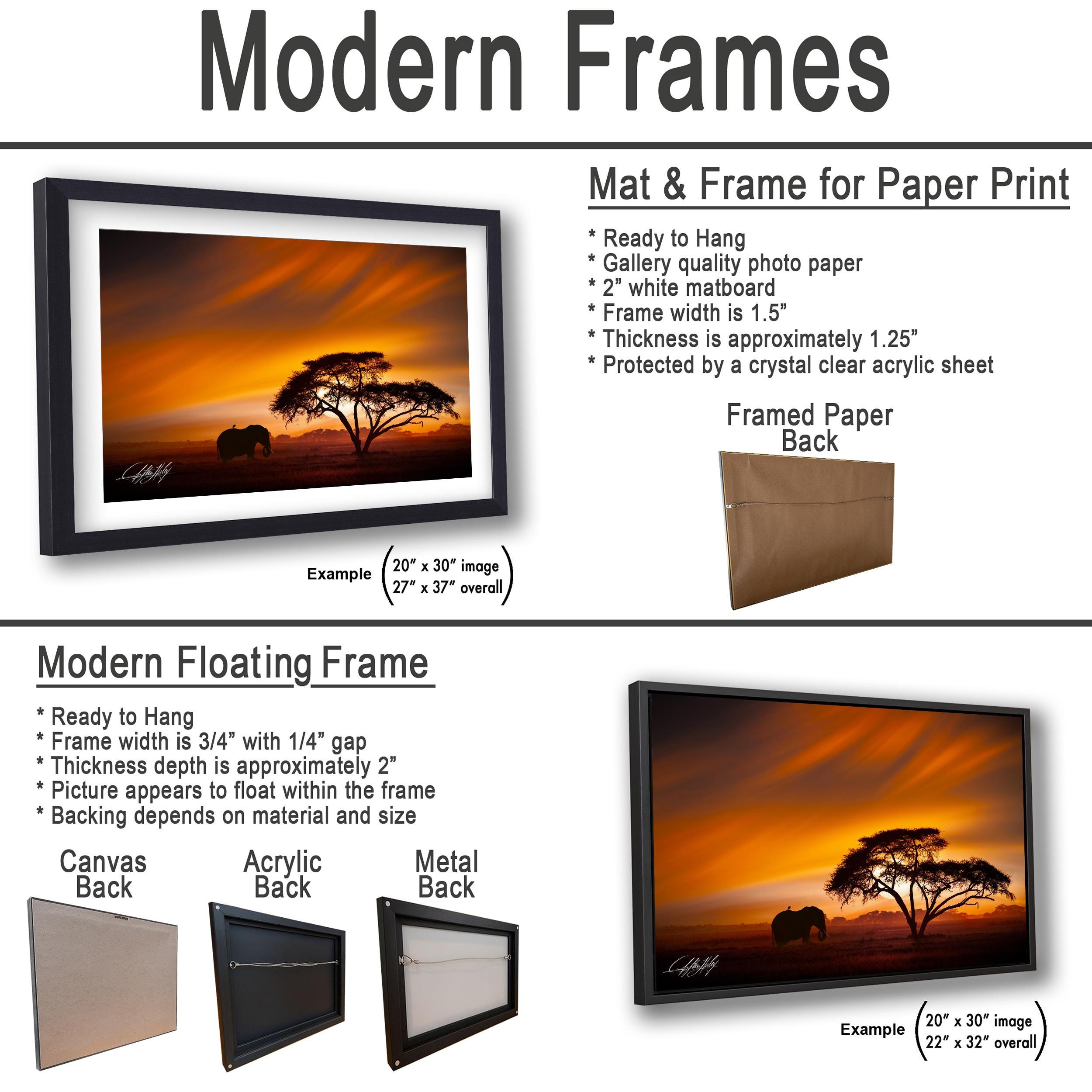 1. Made-to-order artwork means each piece is personal and unique; returns are not offered, but exchanges or replacements are available if your art arrives damaged. 2. Framed paper prints, acrylics, and aluminum/metal prints feature a 2" white mat border; canvas prints are flush mounted without a mat border. 3. Perfect for adding warmth and character to Maasai Mara decor themes or as a striking focal point in any room.