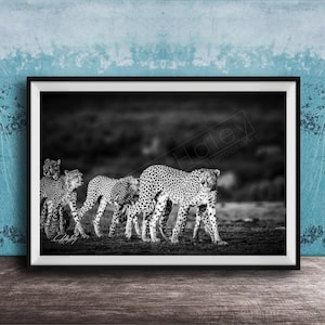 Cheetah art print captures the fierce beauty and grace of Kenya's swiftest hunter in a striking black-and-white maximalist design. This bright safari illustration adds a bold, wild animal art accent perfect for your apartment decor, whether over the bed or couch.