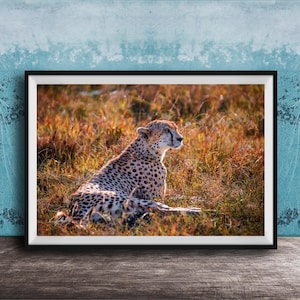 This cheetah wild animal art print brings safari art and vibrant home accent to your space, inspired by Kenya’s breathtaking wildlife scenes.