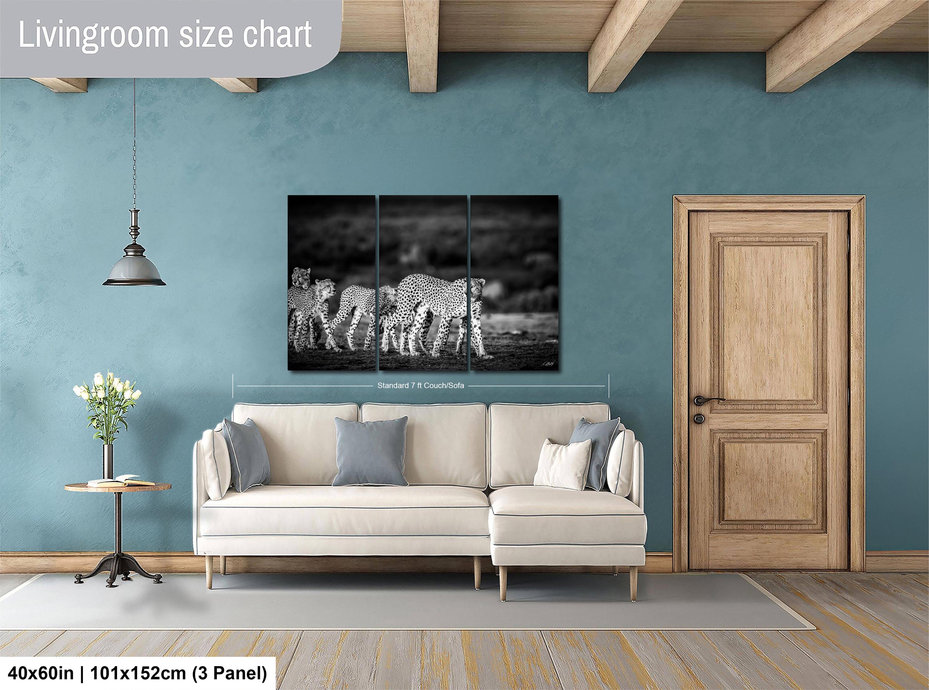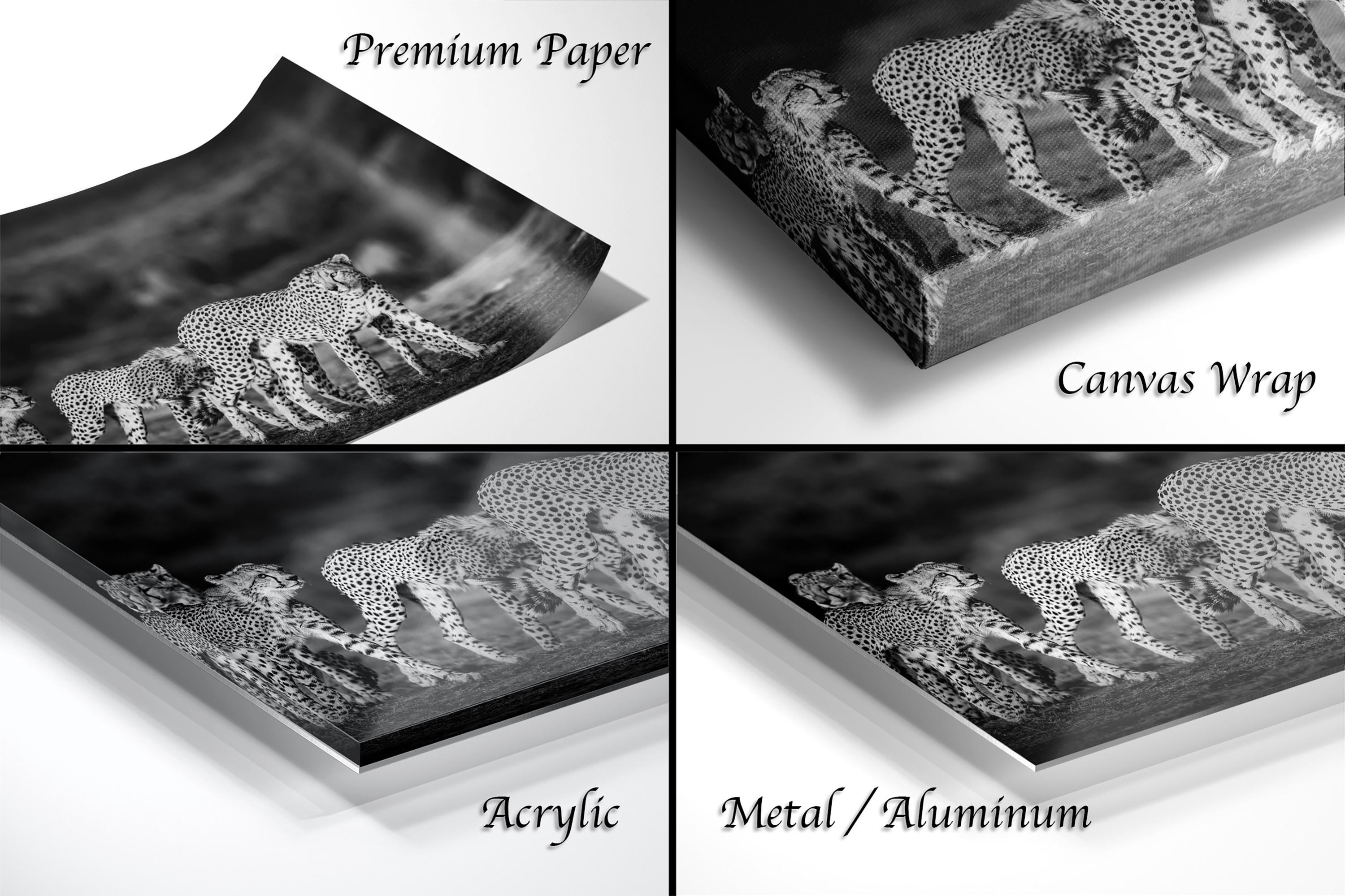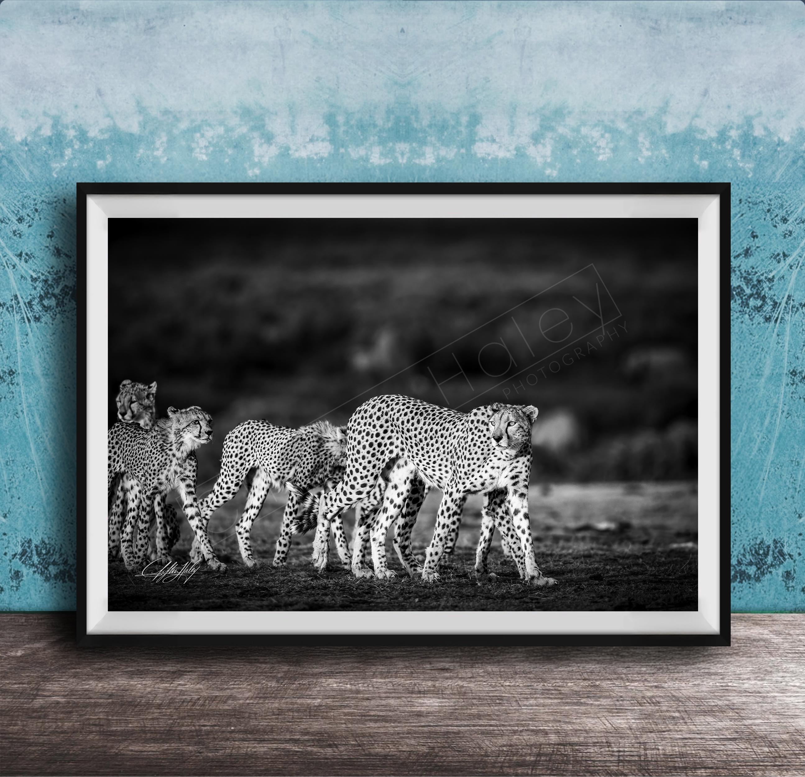 Cheetah wall art print captures the raw beauty and grace of Kenya's swiftest hunters in striking black and white. This maximalist animal decor brings a bold safari artwork vibe to your space, perfect for adding a touch of wild elegance over the bed or couch.