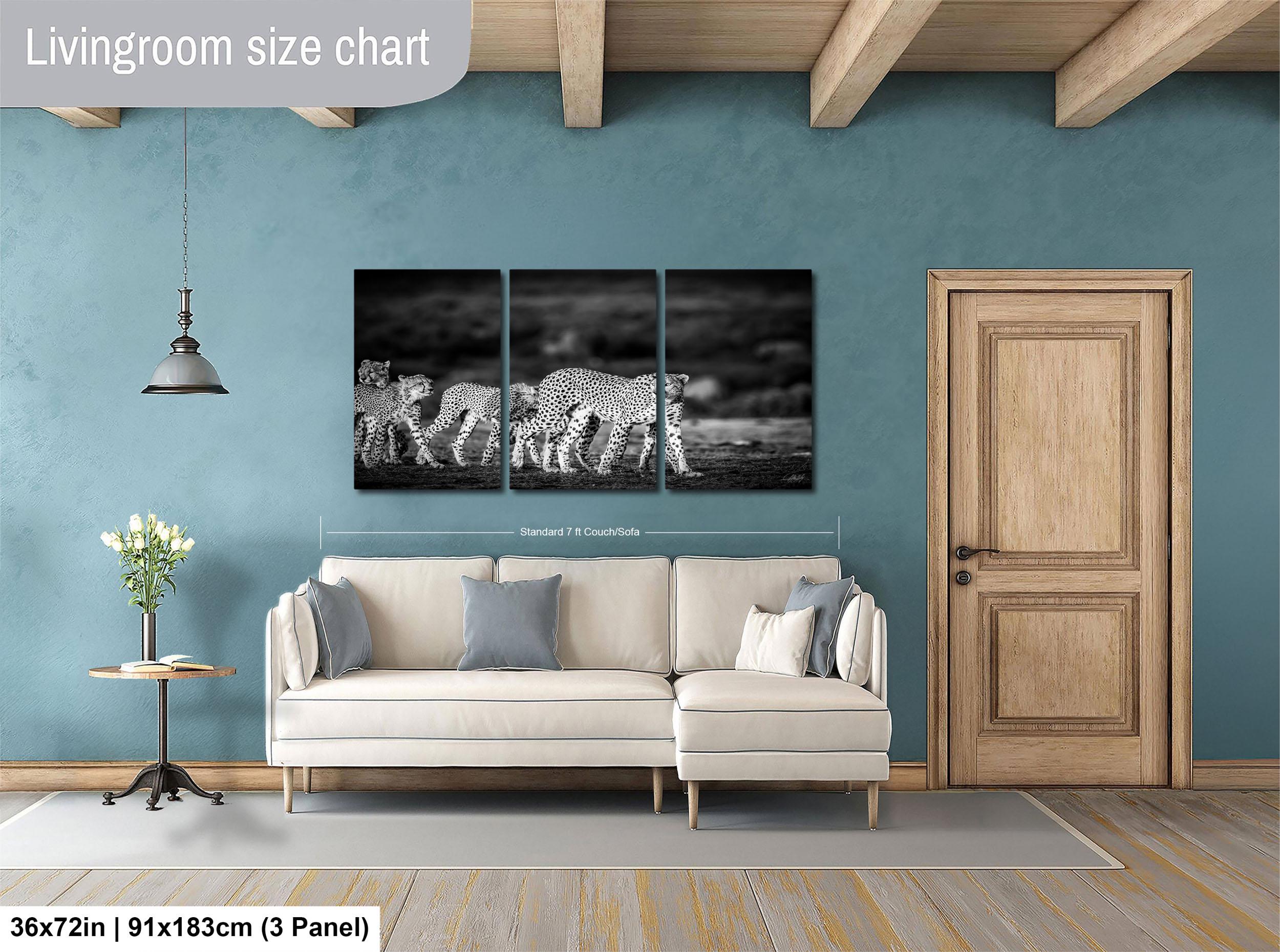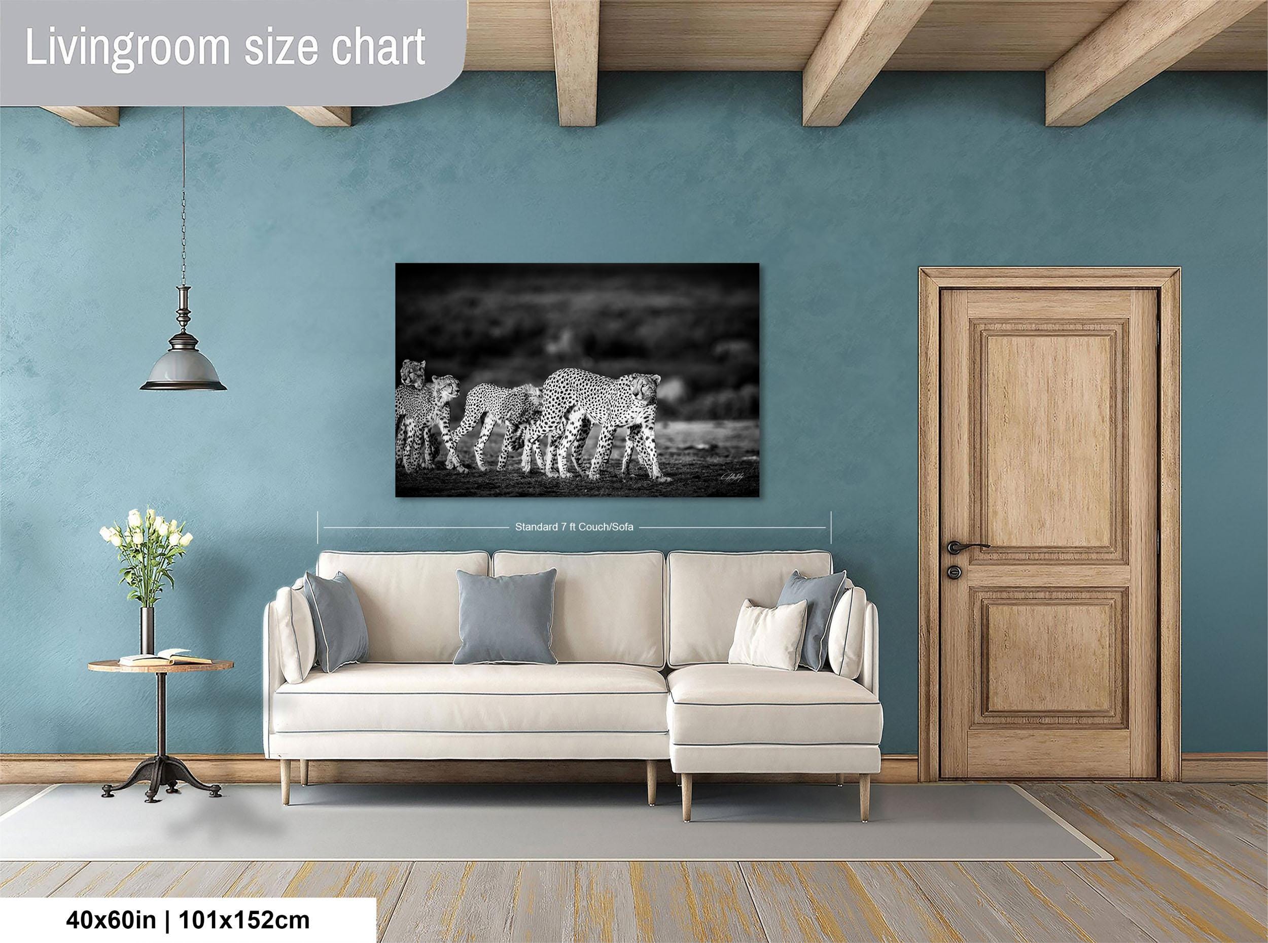 Cheetah wall art print captures the raw beauty and grace of Kenya's swiftest hunters in striking black and white. This maximalist animal decor brings a bold safari artwork vibe to your space, perfect for adding a touch of wild elegance over the bed or couch.