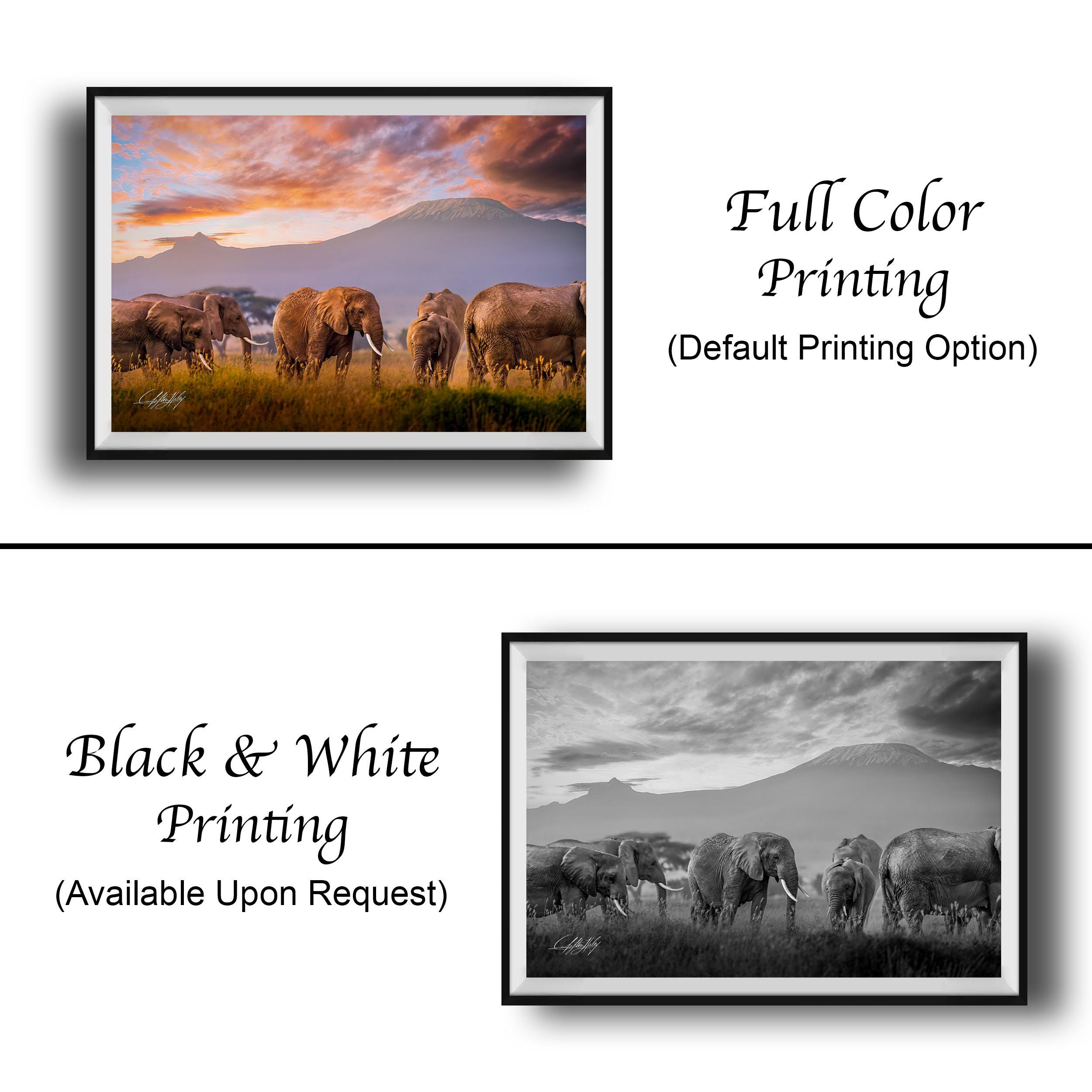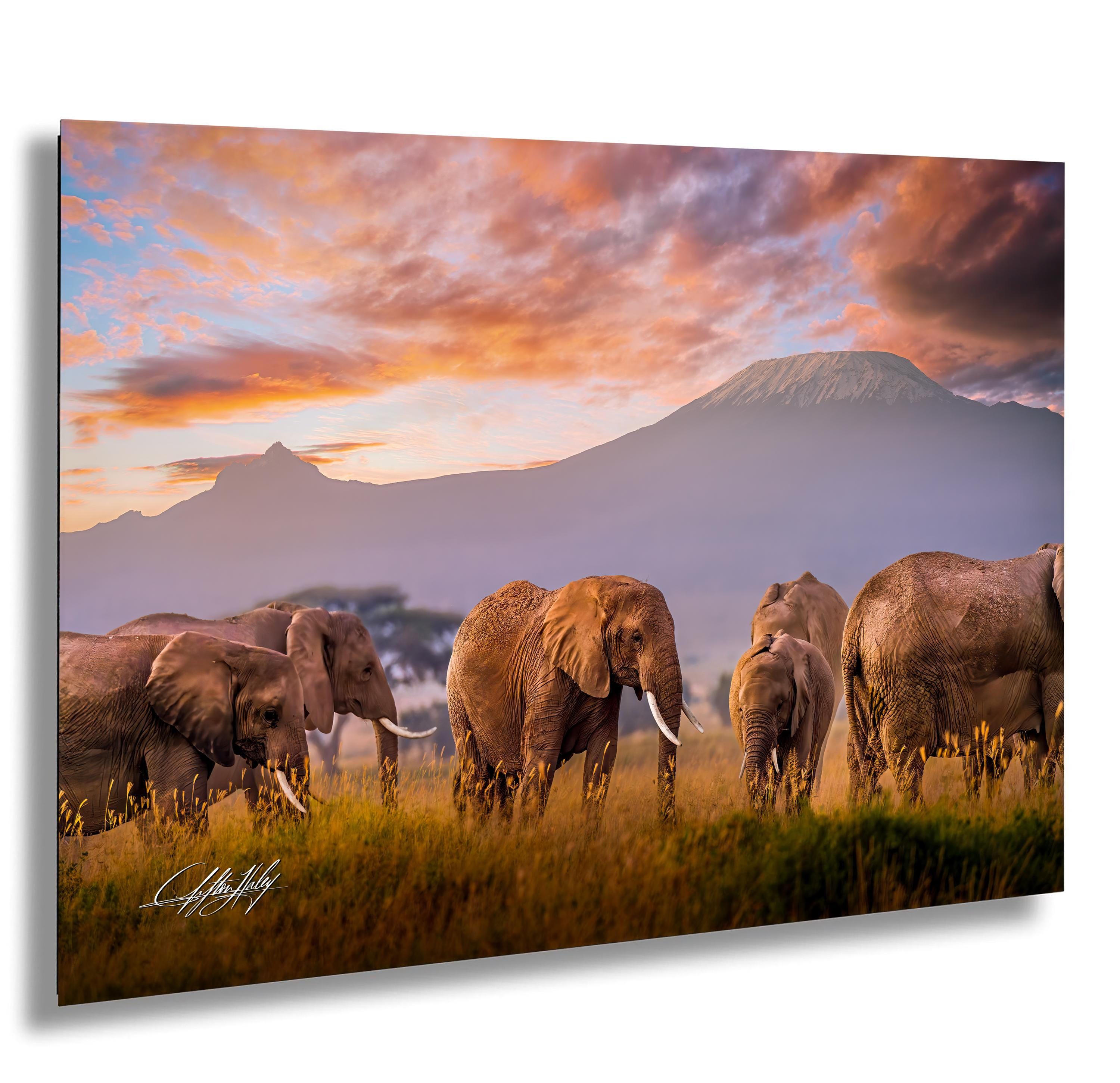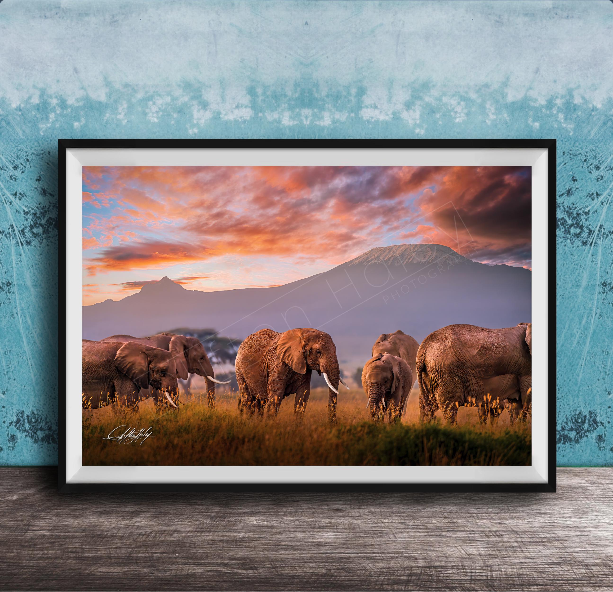 Elephant family Kilimanjaro wall art captures the majestic bond of a mother elephant and her calf against a warm amber sunset, bringing the serene beauty of Kenya wildlife into your home. This signed artist print is perfect for lovers of boho safari decor seeking unique, nature-inspired art.