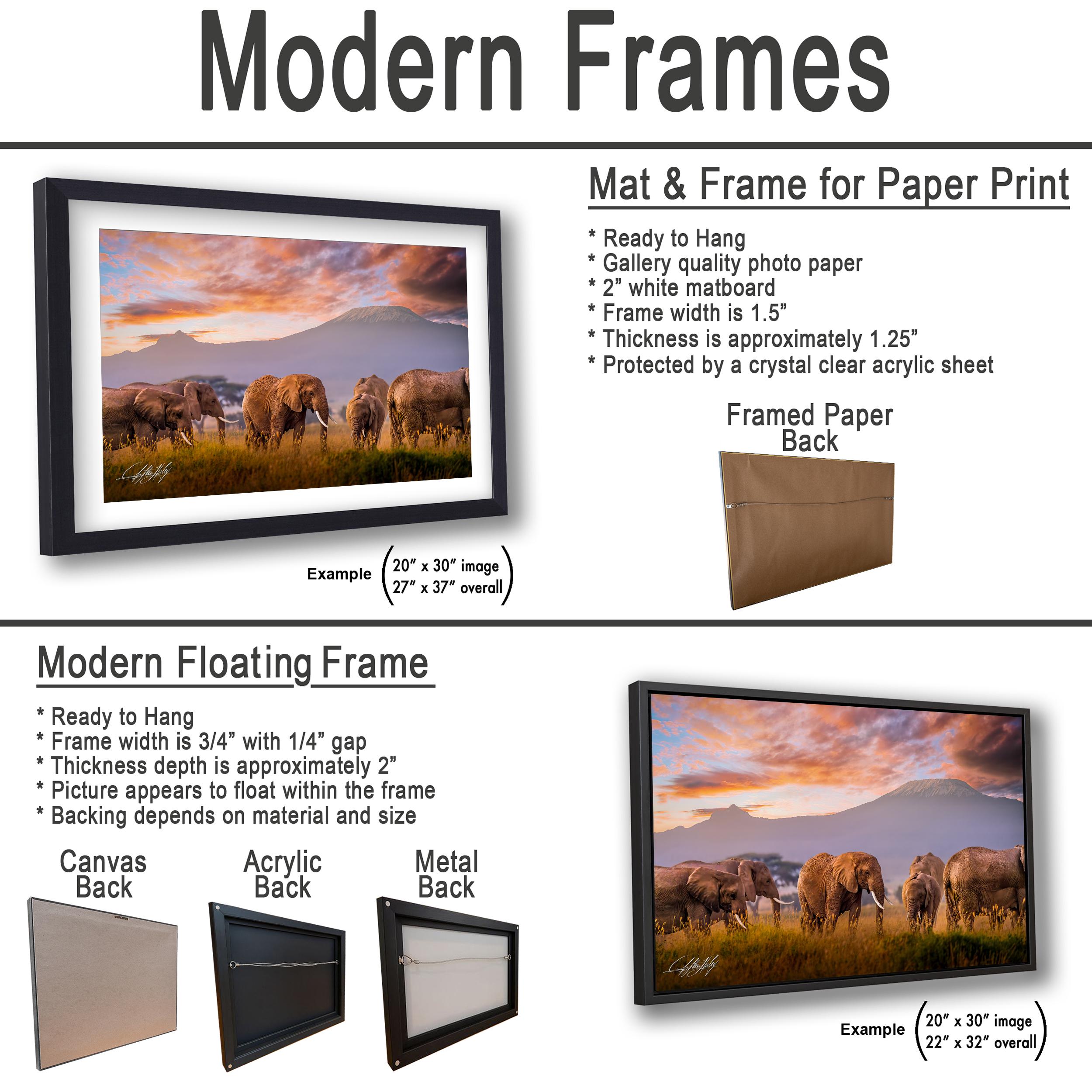 1. Custom fine art prints are created specifically for you; returns are not offered. However, if your piece arrives damaged or there’s an issue, we will gladly exchange or replace it. 2. The signature appears discreetly in the bottom corner, certifying its originality. 3. Framed paper prints, acrylics, and metal prints include a 2" white mat border; canvas prints are flush mounted without a mat border.