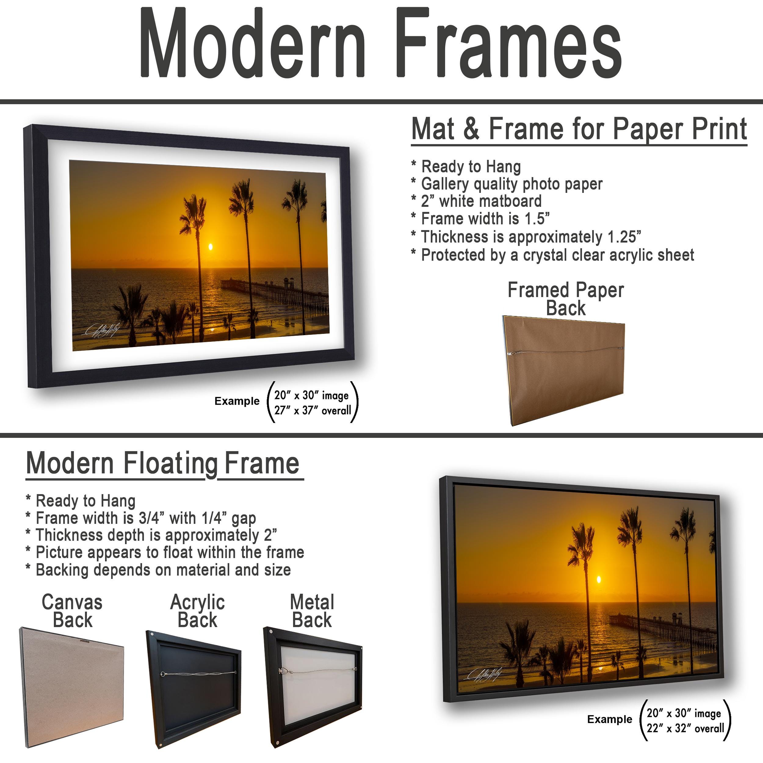 3.1) Only framed paper prints, acrylics and aluminum/metal prints will have a 2" white mat border. 3.2) Canvas prints will be a flush mounted (no mat border) to the frame.