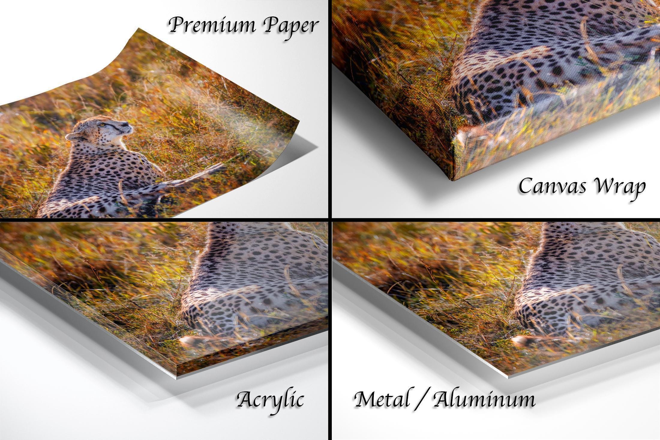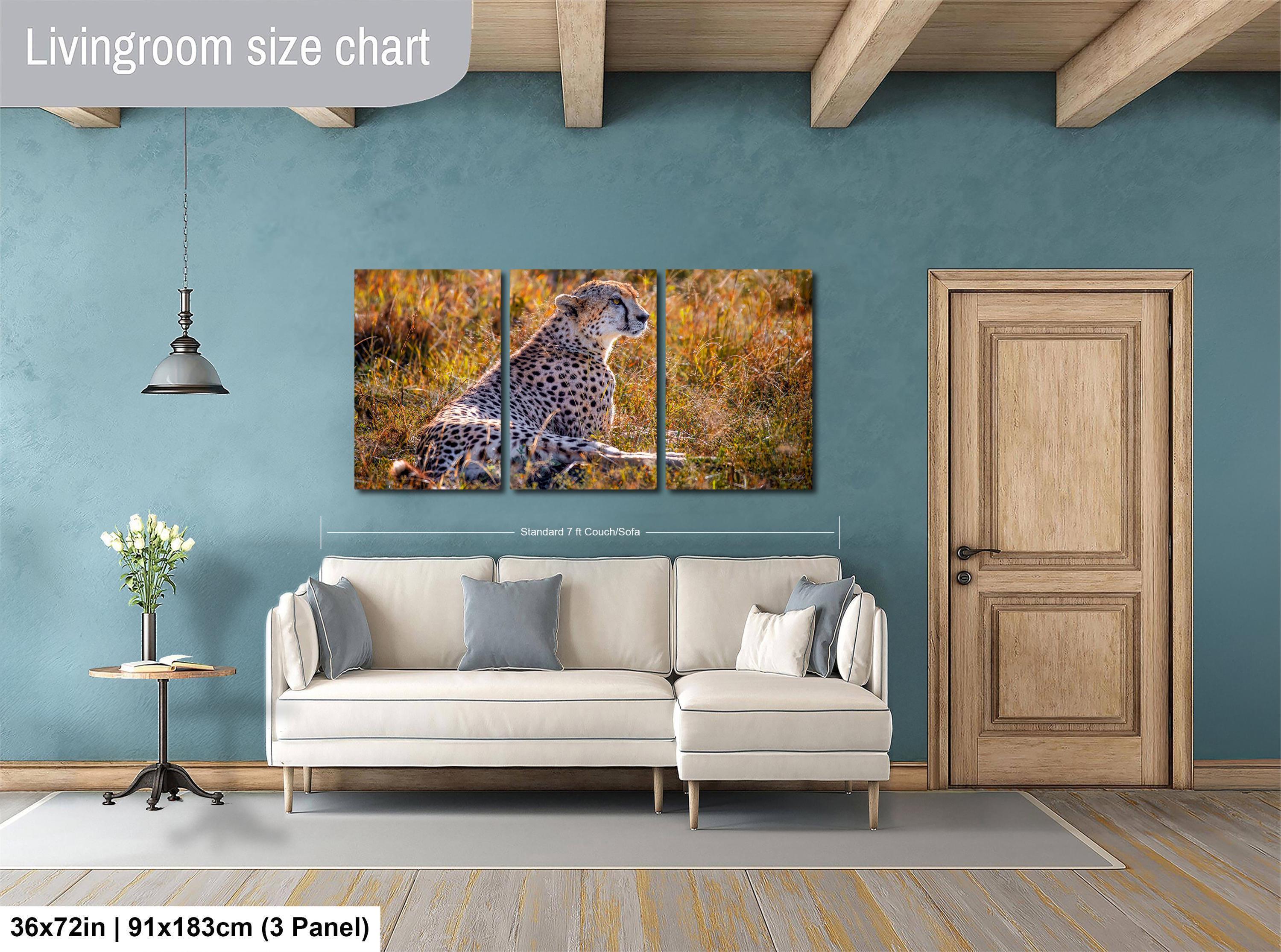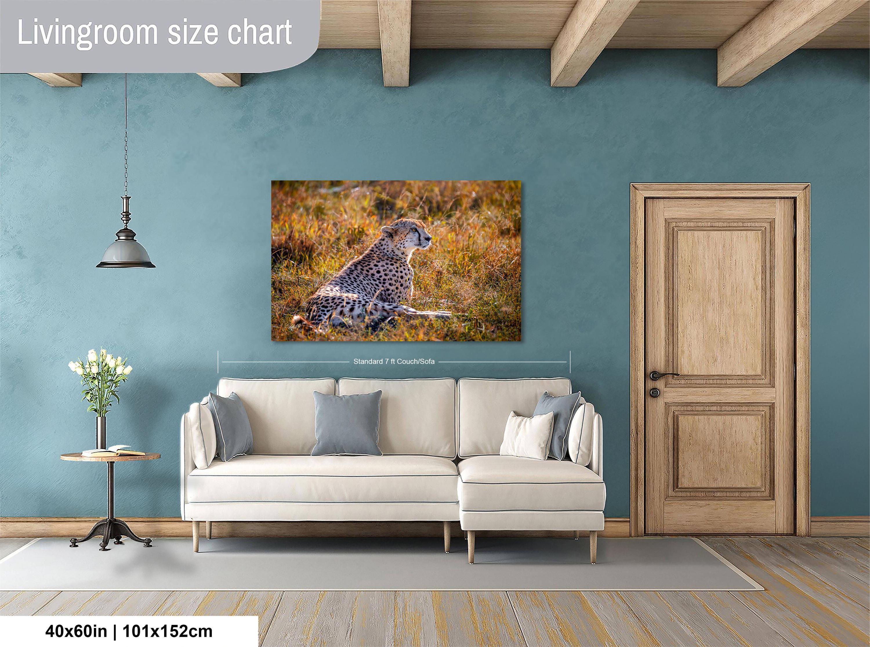 Cheetah animal print art brings the wild beauty of Kenya’s Maasai Mara right into your living space, capturing the elegance and power of this majestic creature. This bright wall art adds a vibrant safari touch to any room, perfect for maximalist wall decor lovers seeking bold, wildlife-inspired accents.
