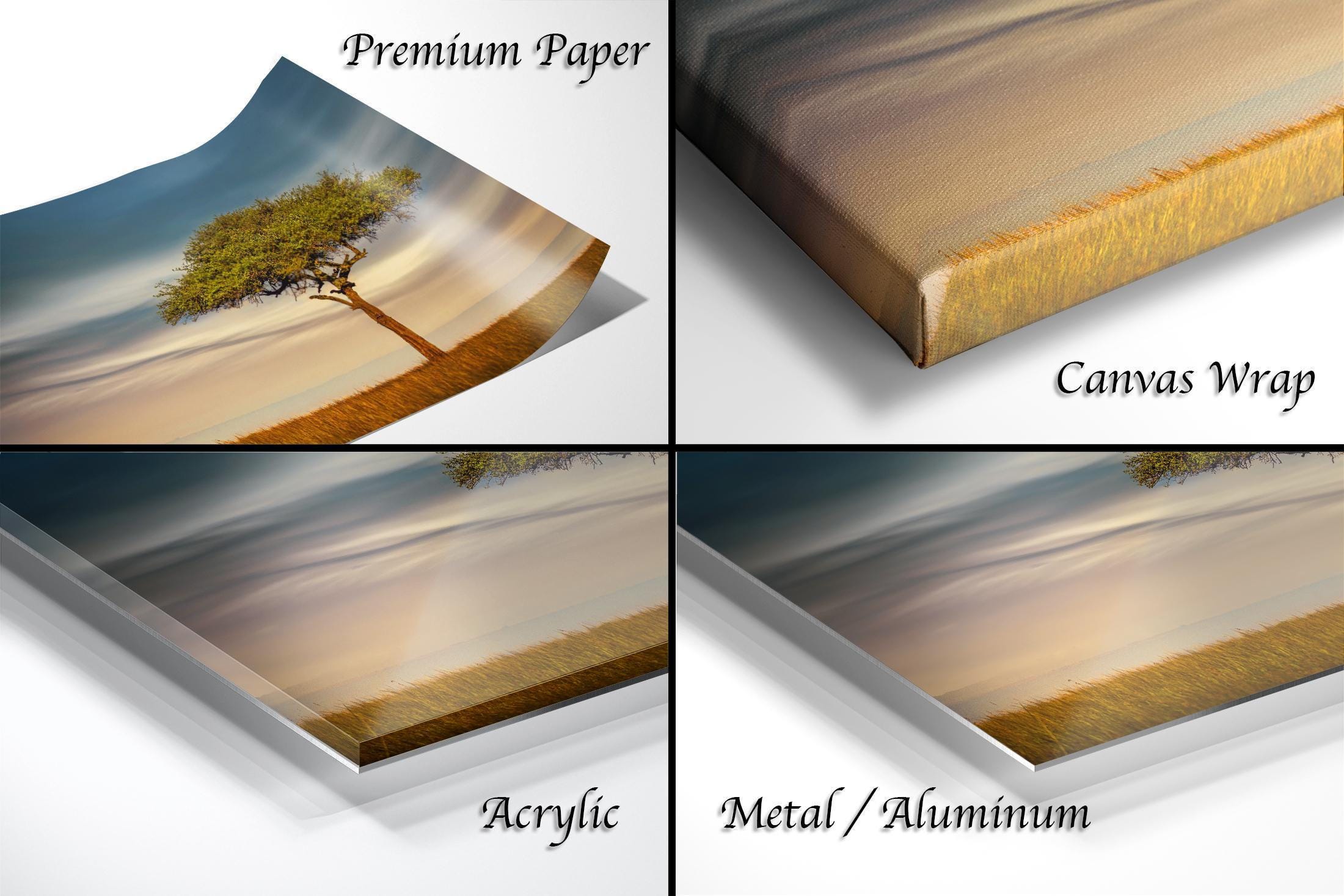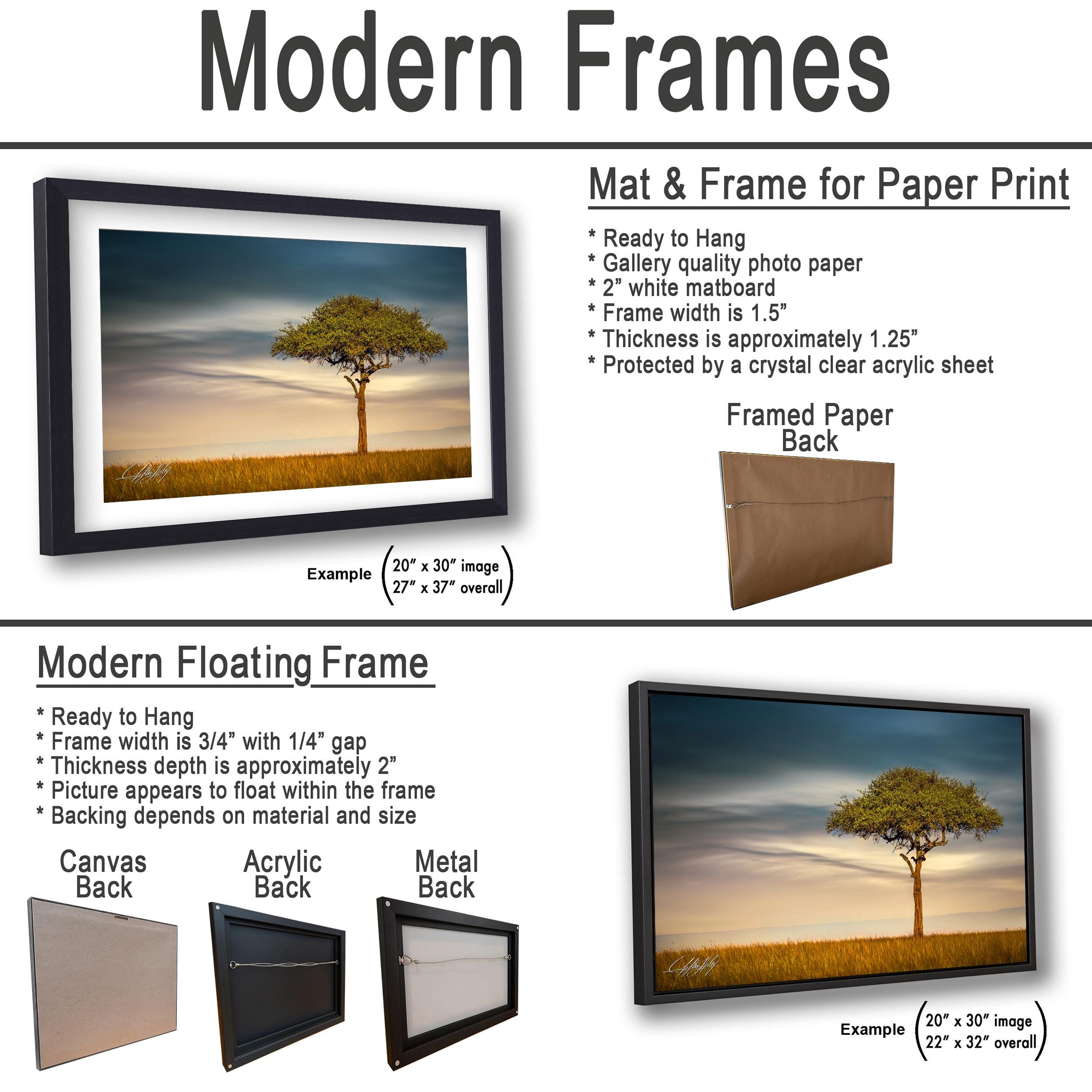 3.1) Only framed paper prints, acrylics and aluminum/metal prints will have a 2" white mat border. 3.2) Canvas prints will be a flush mounted (no mat border) to the frame.