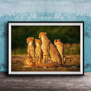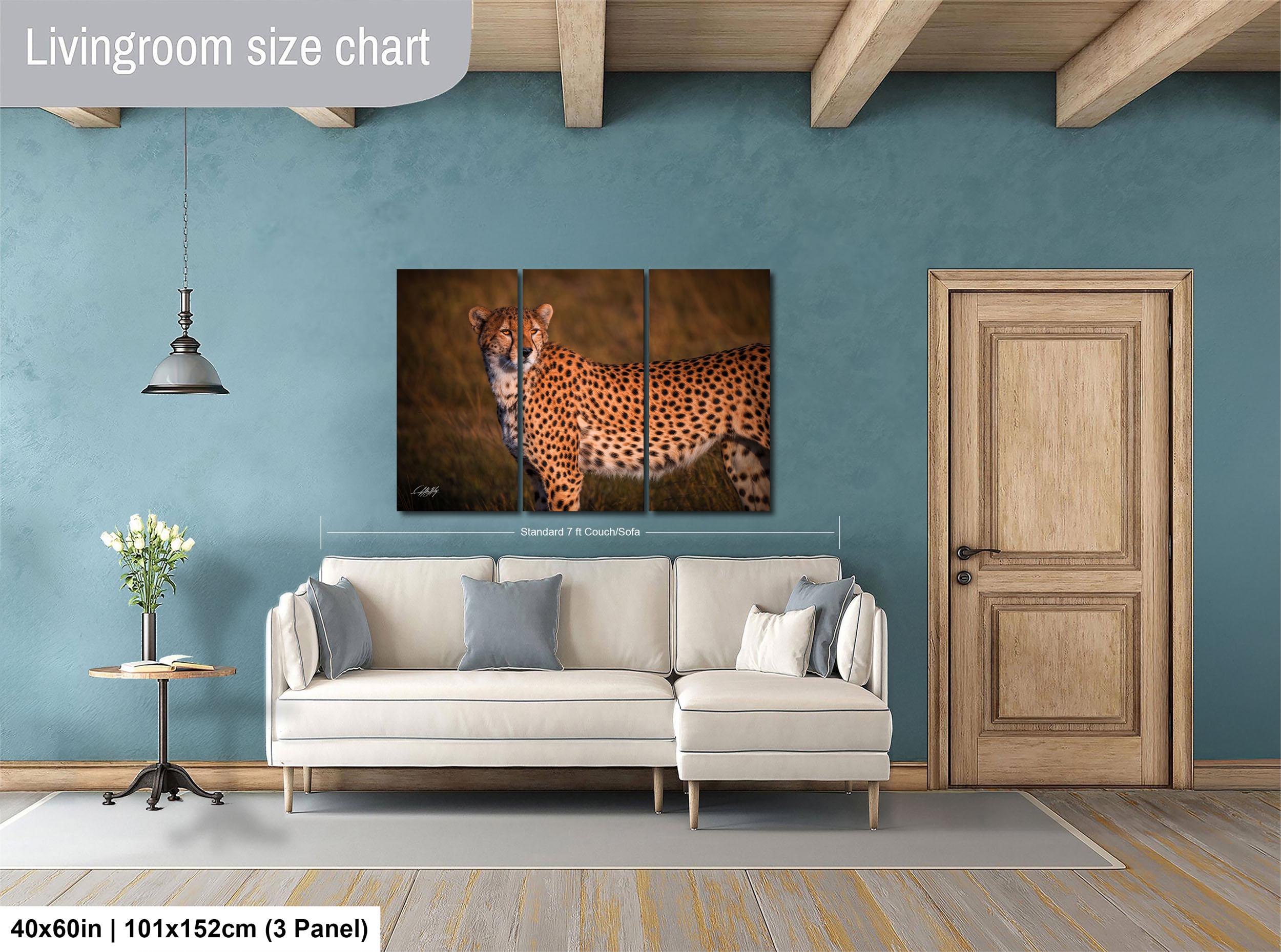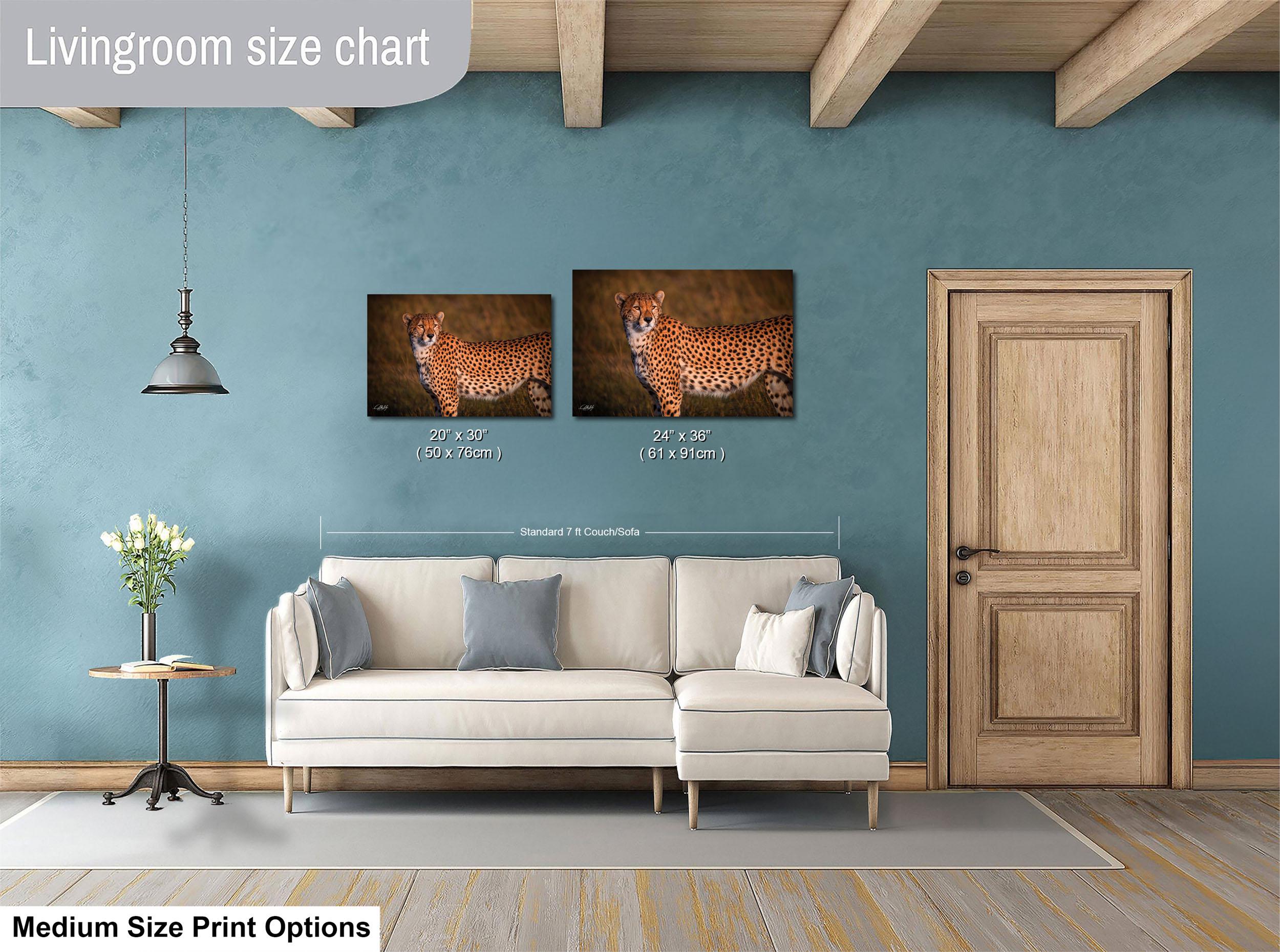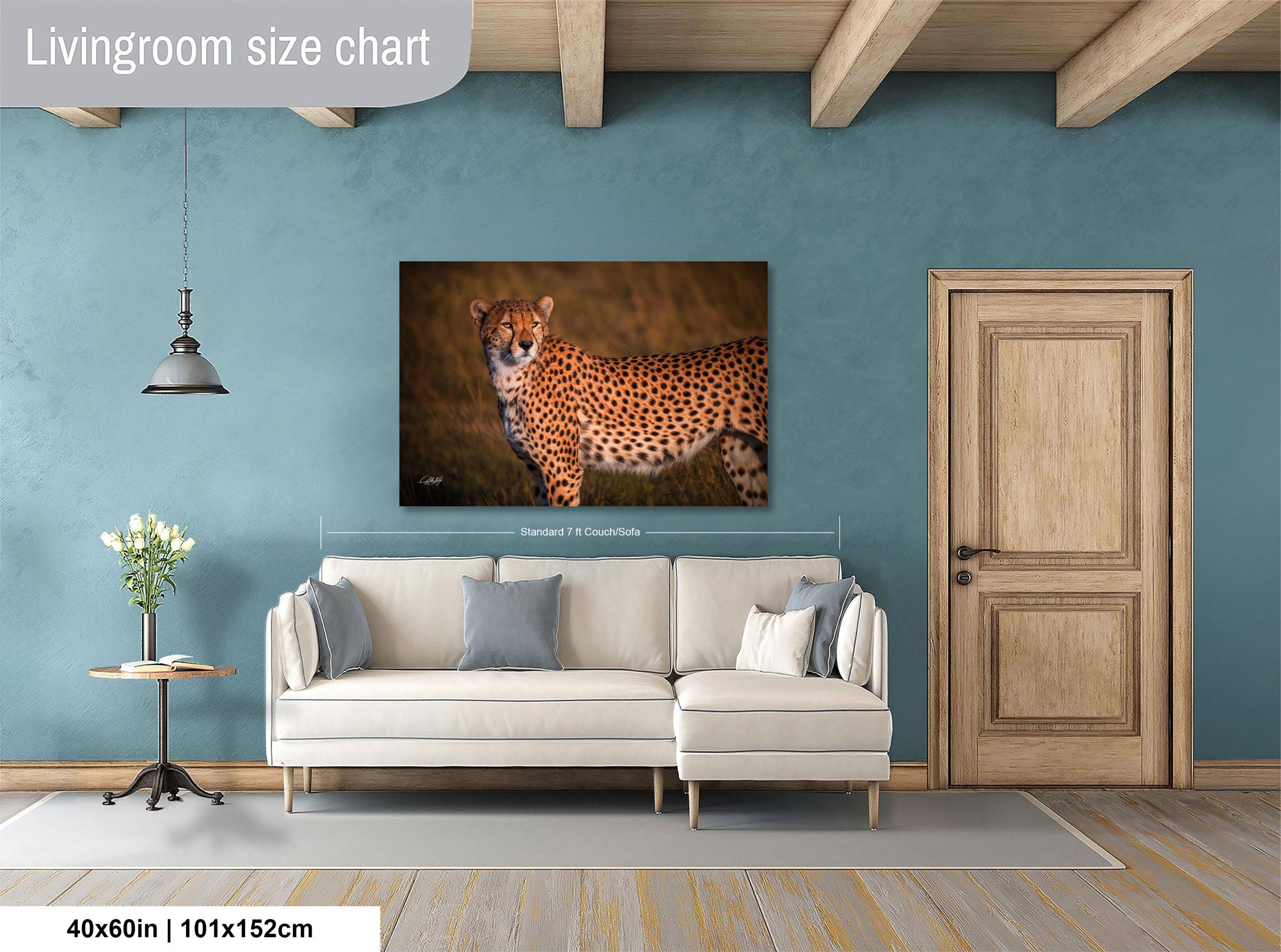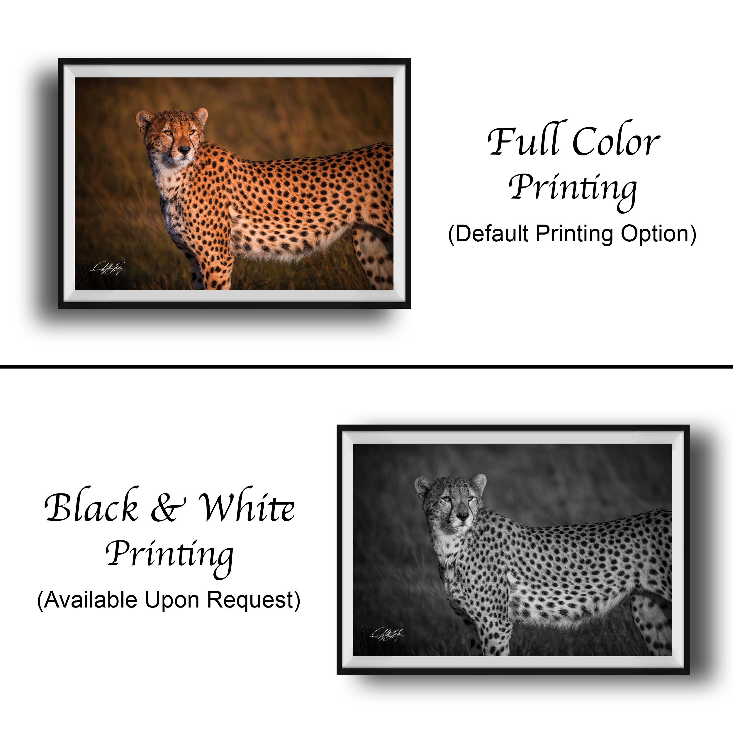 Cheetah art print captures the fierce beauty and grace of Kenya's swiftest hunter in a striking black-and-white maximalist design. This bright safari illustration adds a bold, wild animal art accent perfect for your apartment decor, whether over the bed or couch.