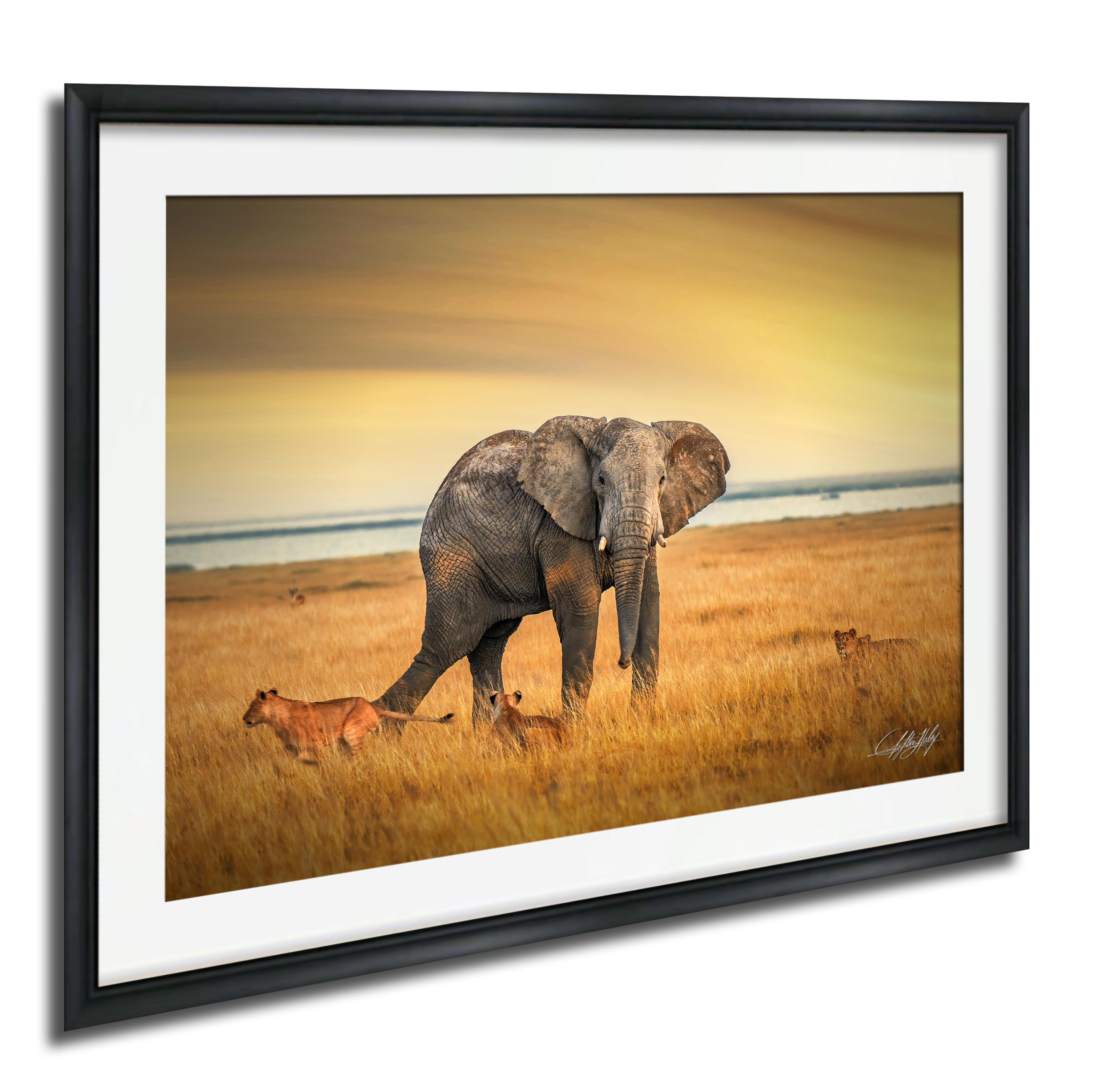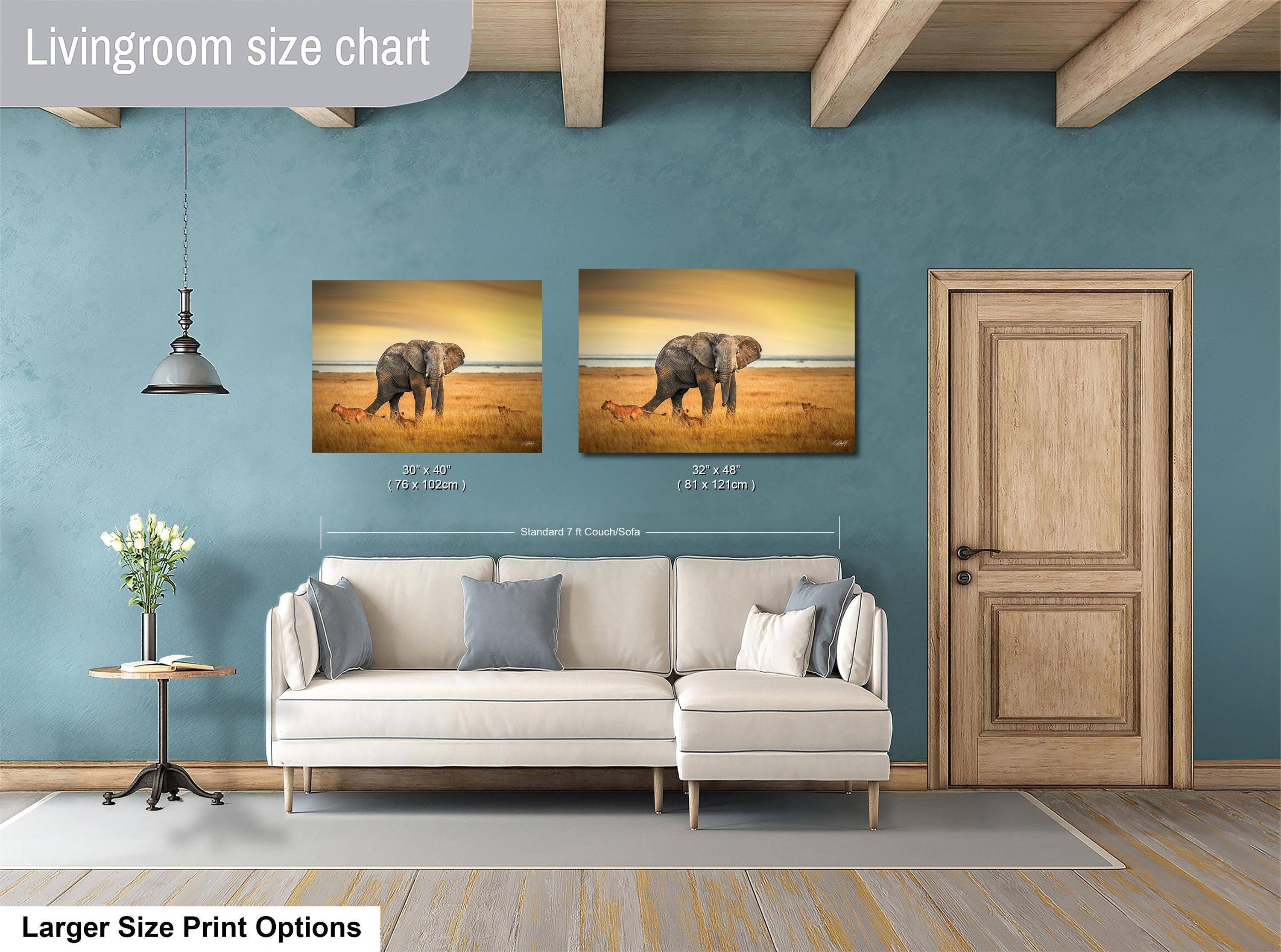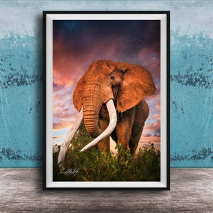 Elephant Battle Sunrise Print brings the awe-inspiring moment of a big tusker at dawn into your home, blending natural beauty with artistic elegance. This African safari decor captures the spirit of Kenya wildlife, perfect for lovers of boho wall art and authentic safari animal posters.