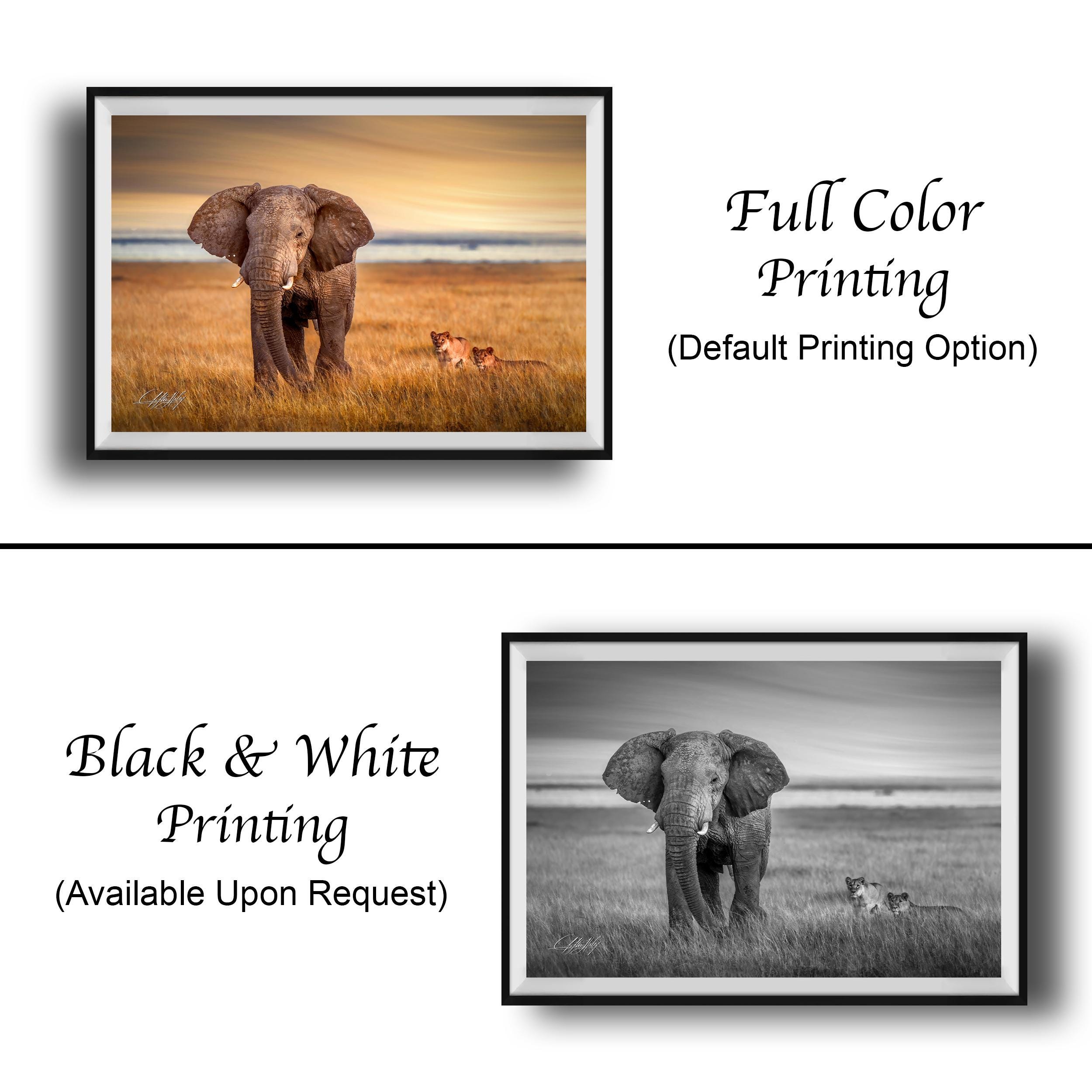 Elephant Battle Sunrise print captures a breathtaking moment of bold wildlife grace in the golden light of Amboseli. This striking piece of boho safari decor brings the spirit of Kenya's nature and maximalist home art into your space, featuring a signed Craig artist original.