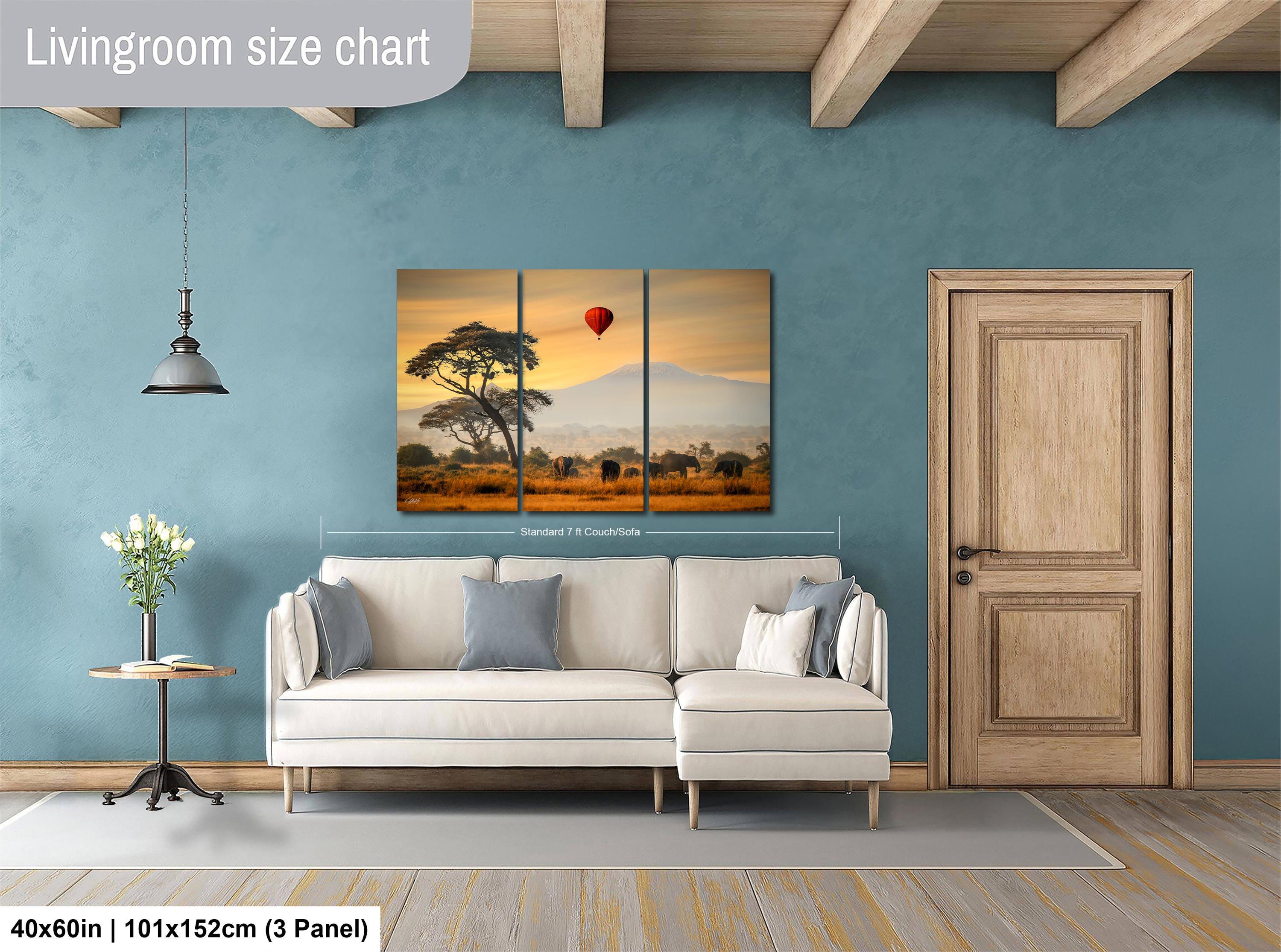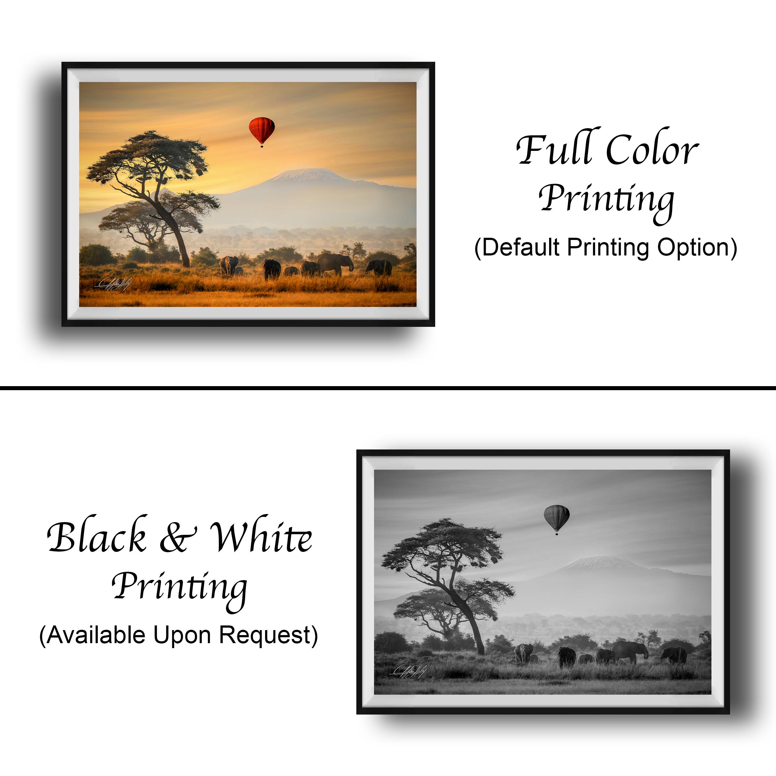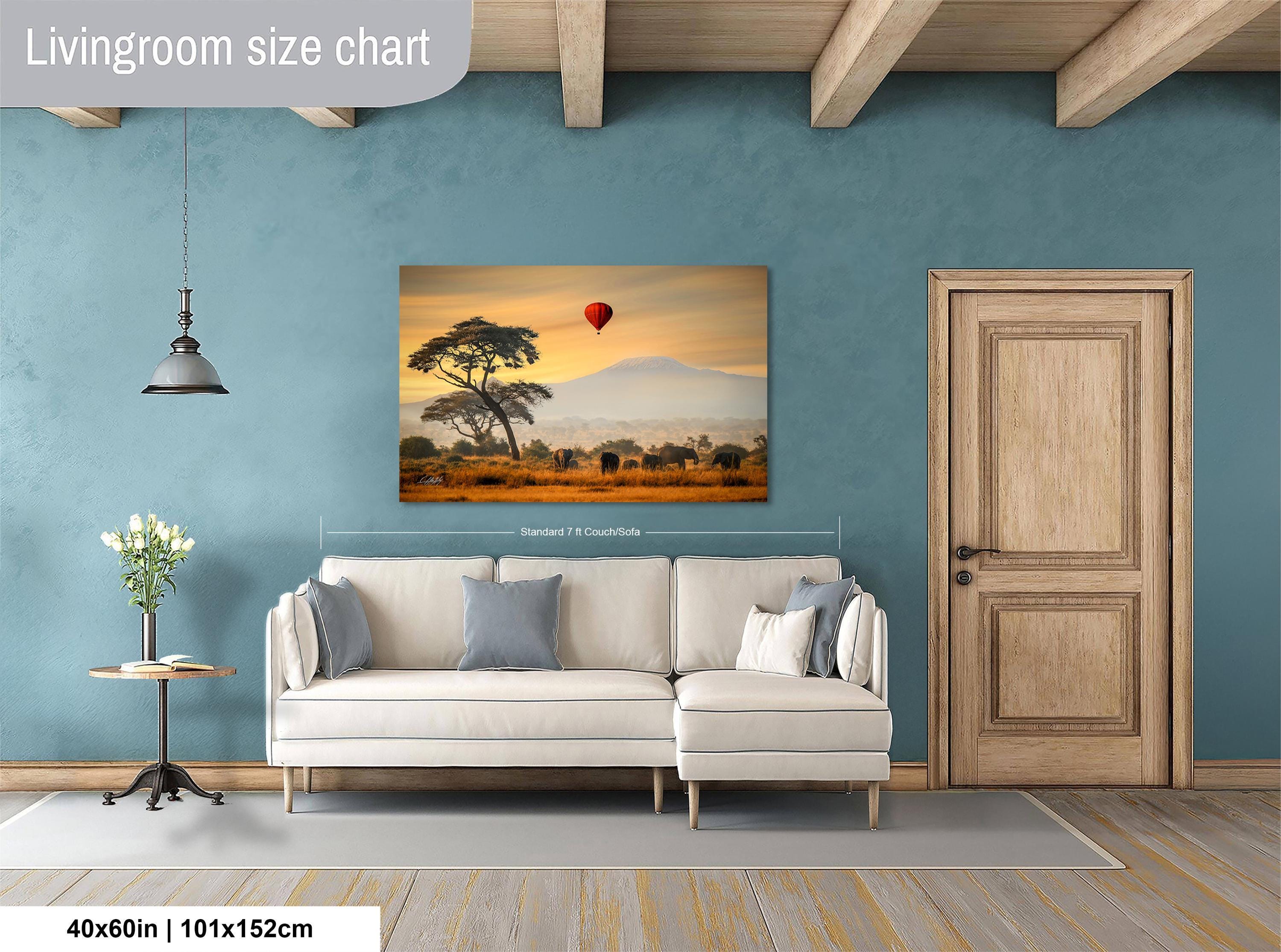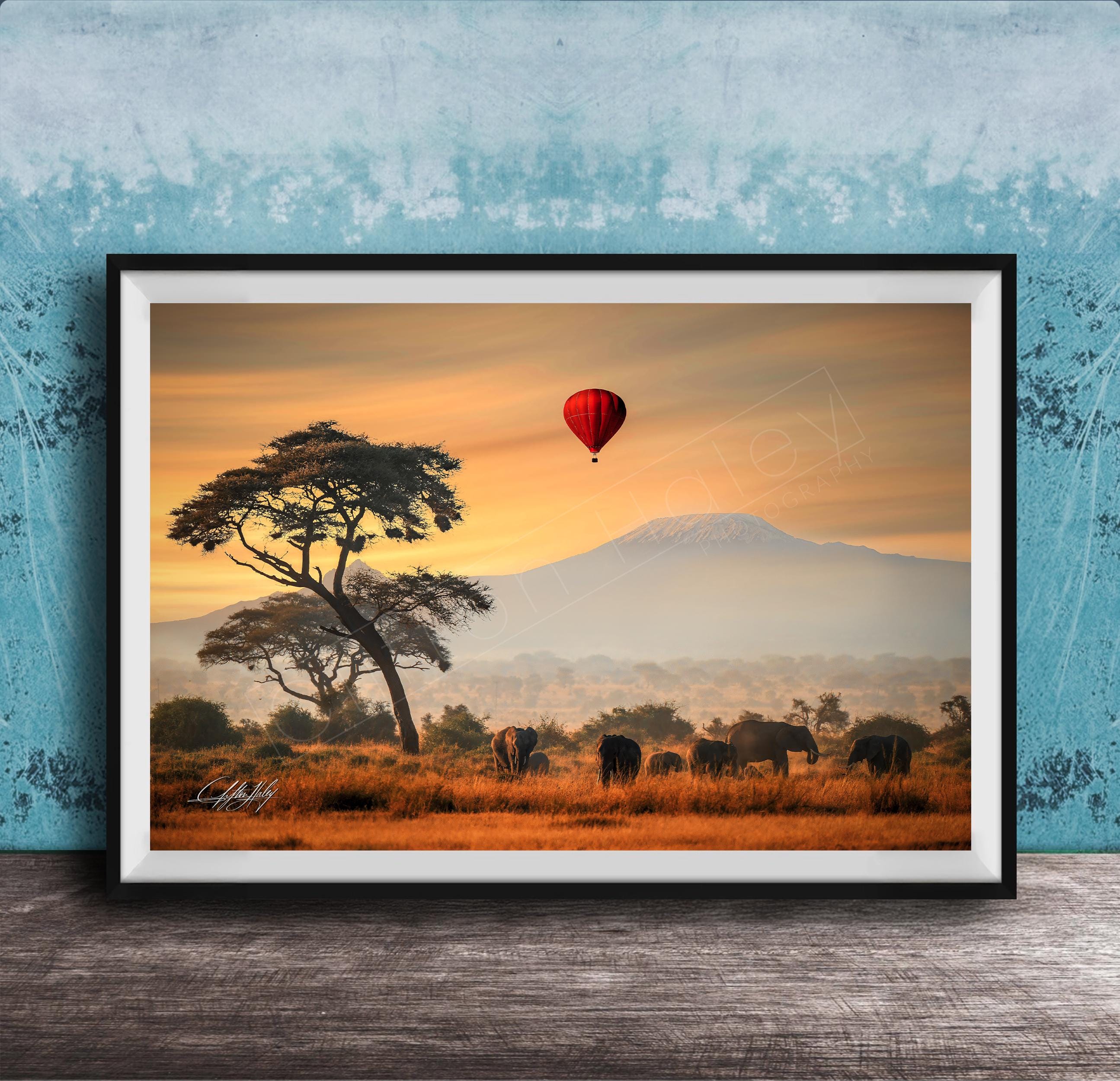 Step into the heart of the savanna with this luxury elephant artwork, where every detail celebrates the majestic wildlife and rich culture of Kenya. The image portrays a family of elephants beneath a glowing dawn sky, with Mount Kilimanjaro in the background, evoking a serene safari art ambiance.