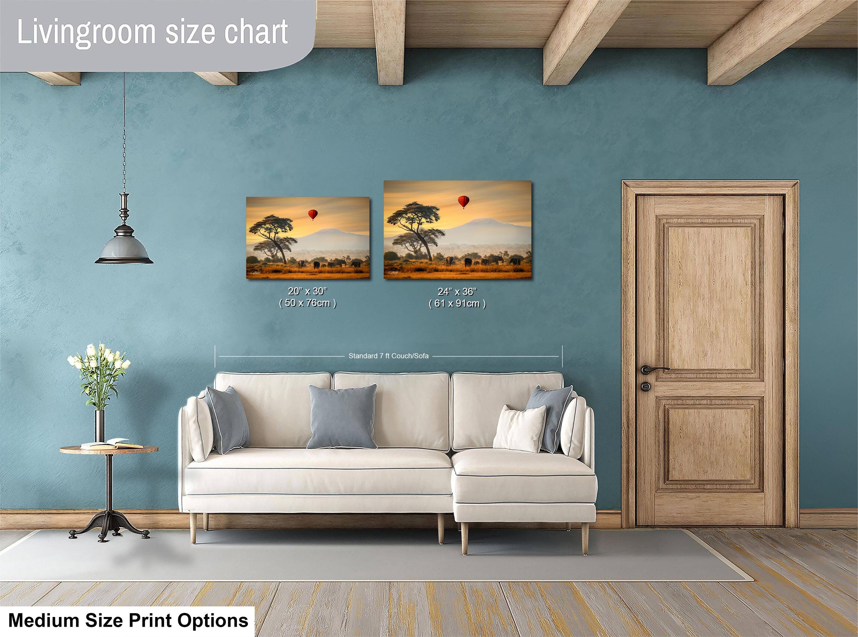 Experience the vibrant beauty of a red hot air balloon safari captured in this stunning wall art. This bright wild animal illustration brings maximalist animal prints and Kenya Maasai decor into your living space, perfect for apartment decor or over the couch.