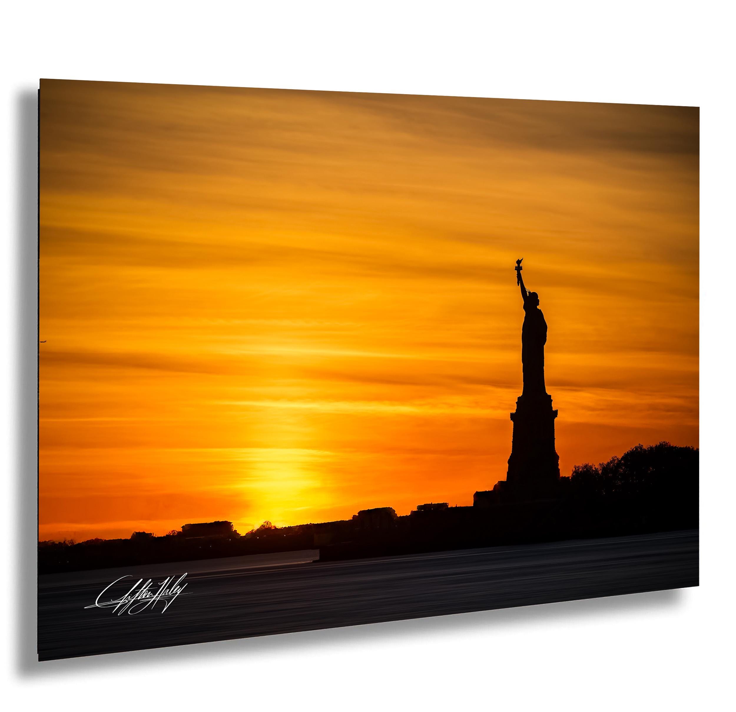 Experience the magic of New York through this modern abstract Statue of Liberty wall art, set against a radiant sunrise or sunset sky. Lady Liberty takes center stage in a bold yet minimal design that captures the city’s iconic spirit, making it an ideal addition to any room for NYC lovers, travel enthusiasts, or those seeking elegant skyline wall art.