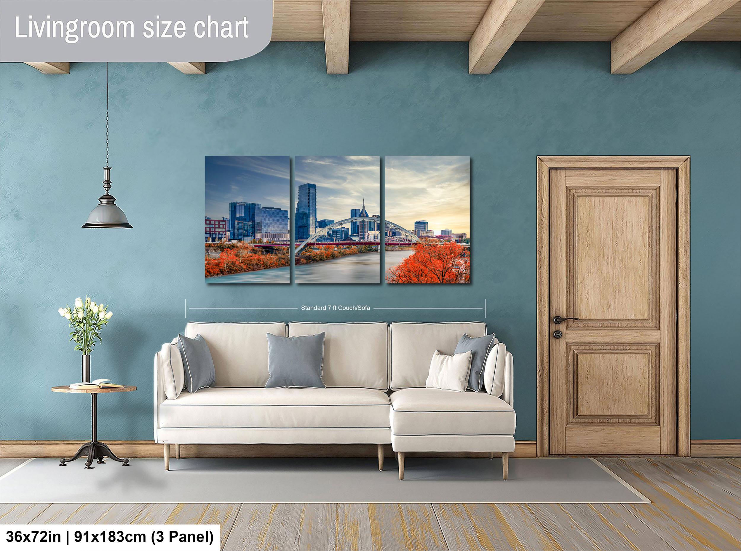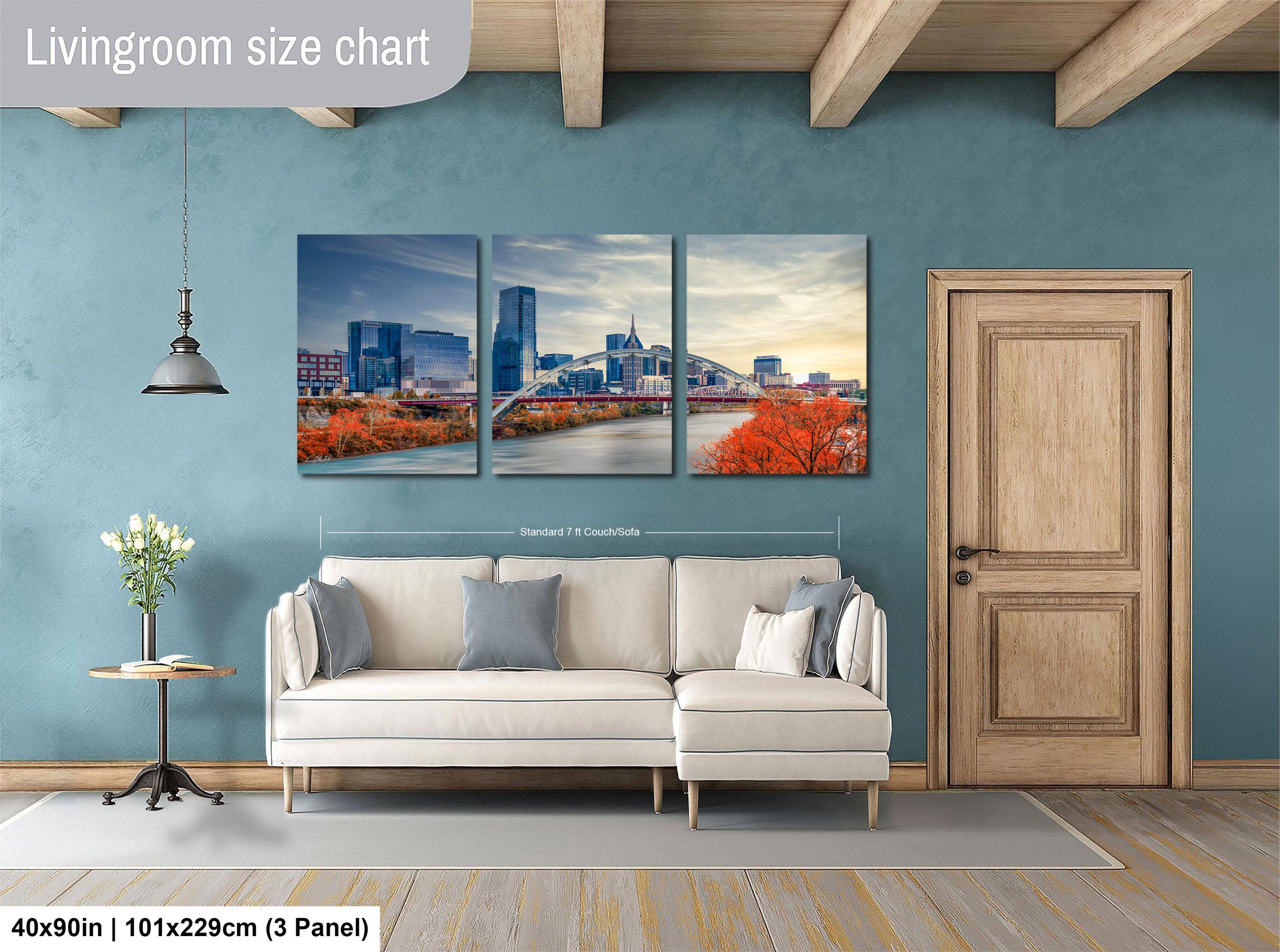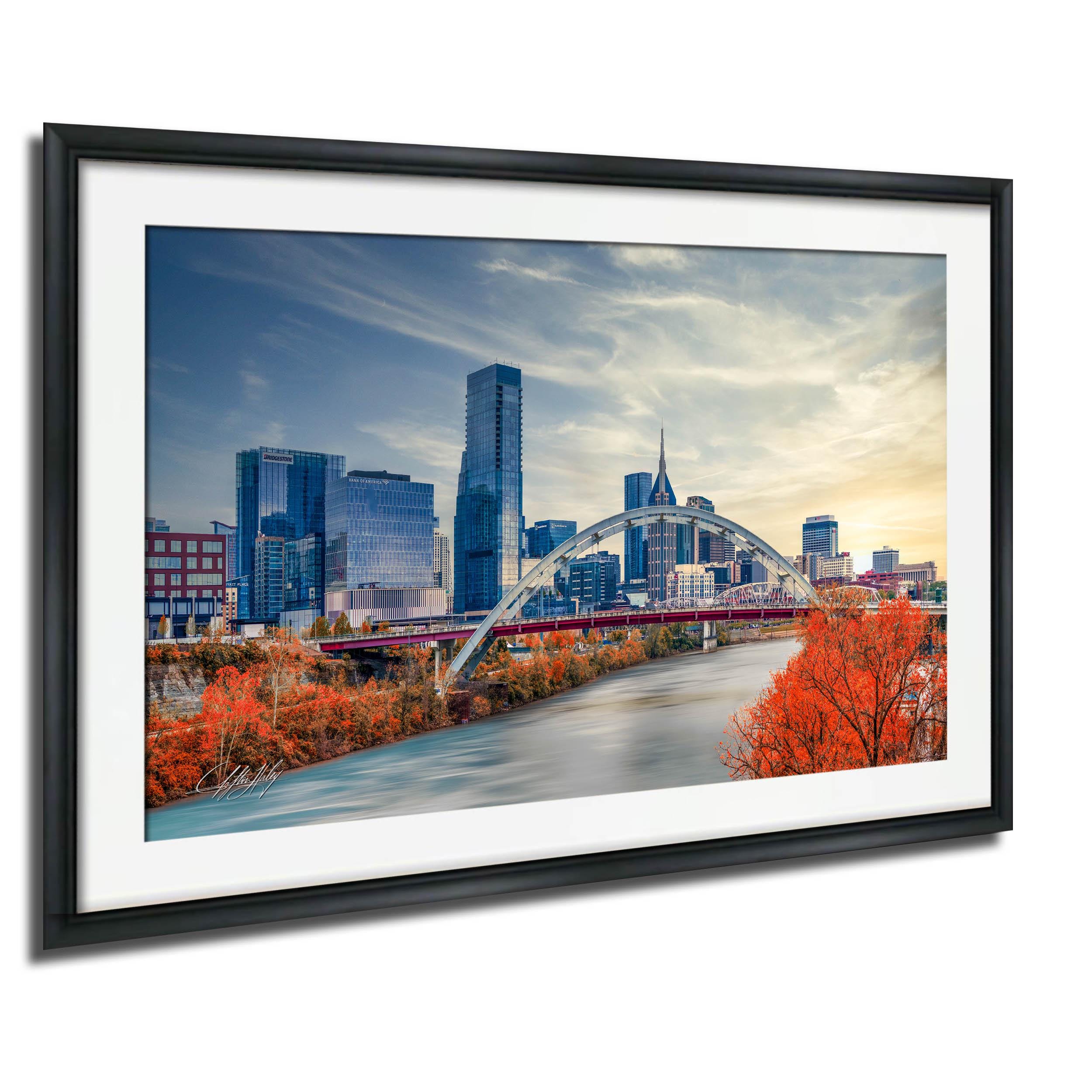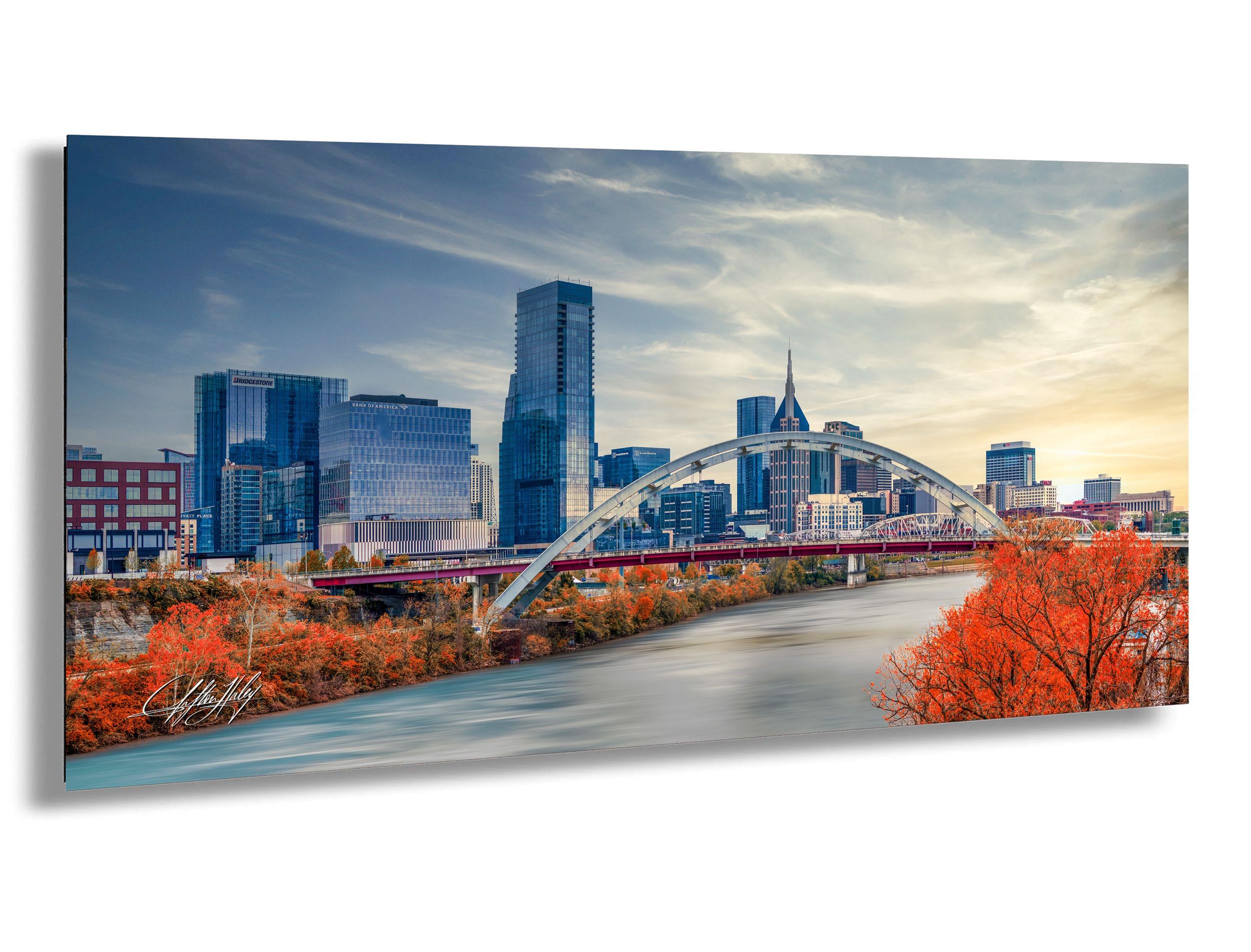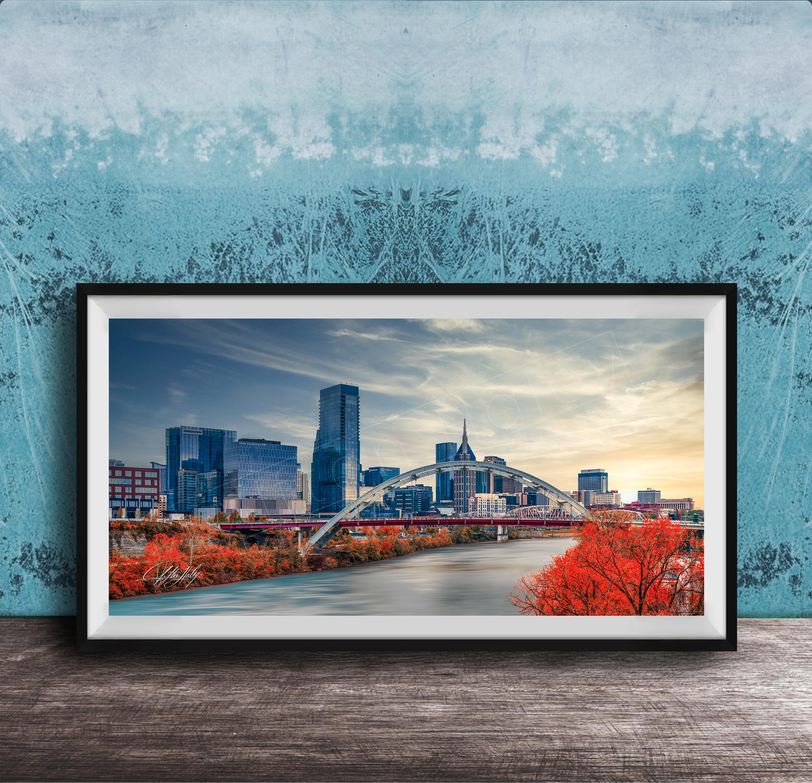 Experience the calm beauty of a Nashville cityscape poster that captures a golden autumn sunset over Music City. This fine art photograph highlights the Korean Veterans Boulevard Bridge and the amber light skyline, bringing a quiet beacon of faith and resilience into your space.