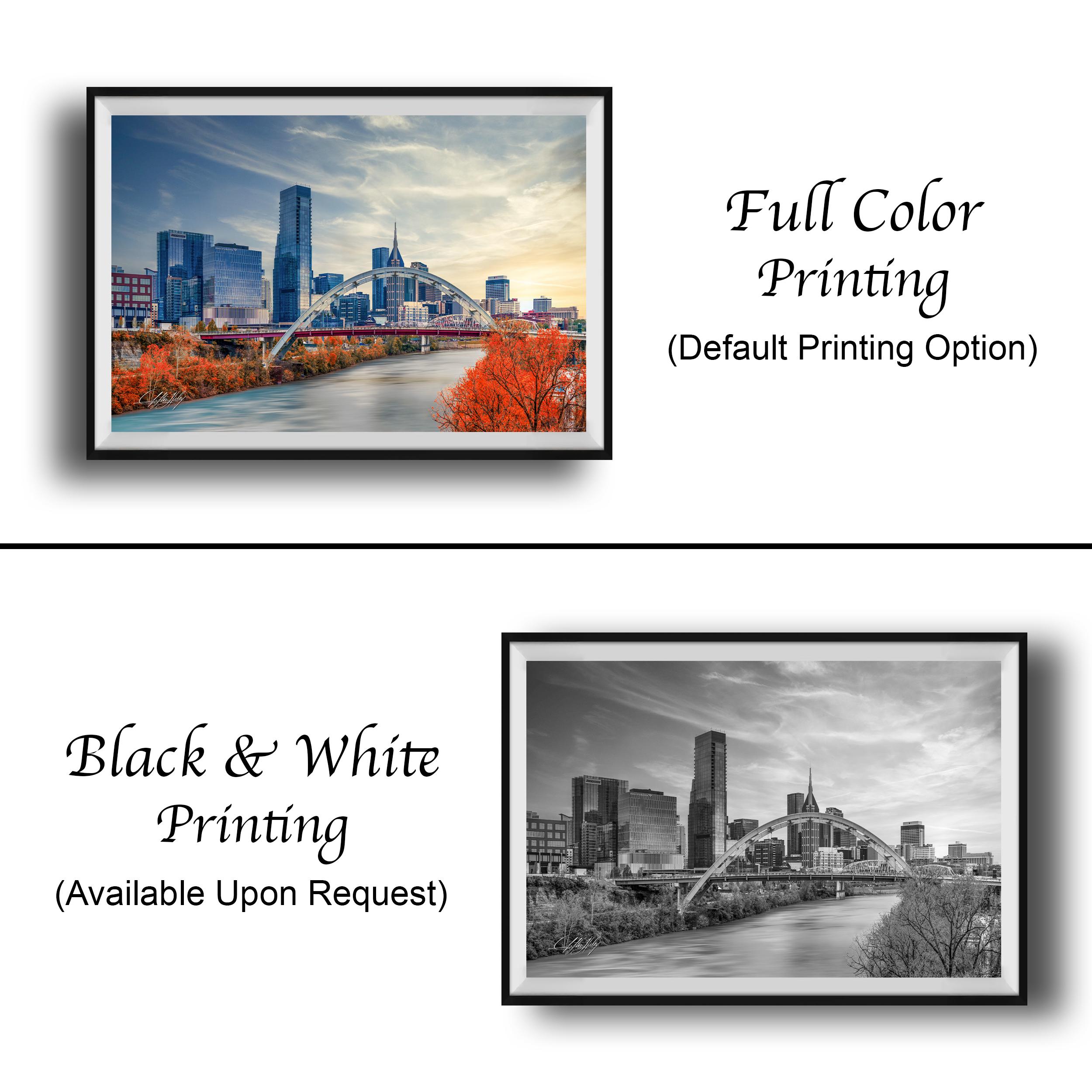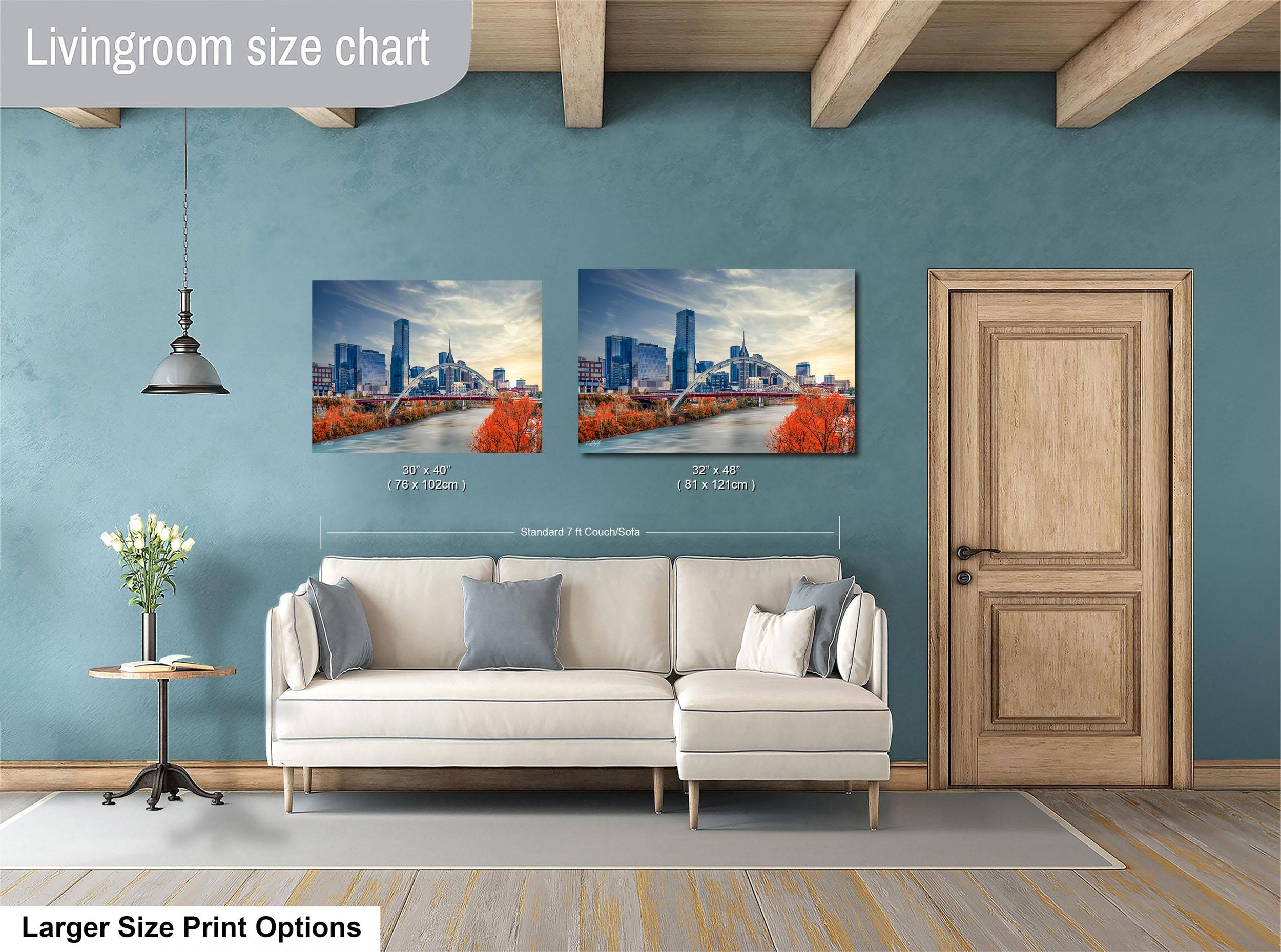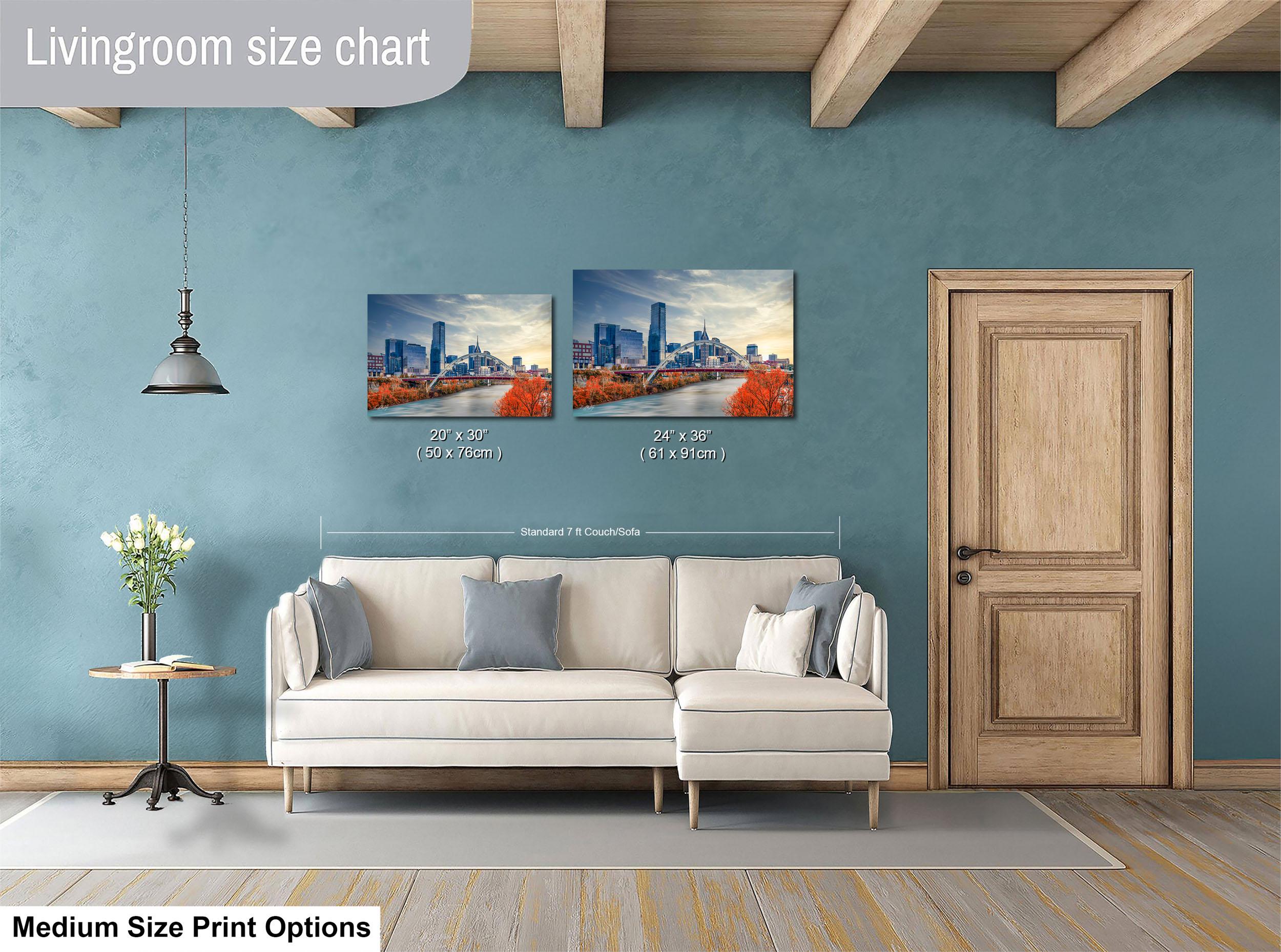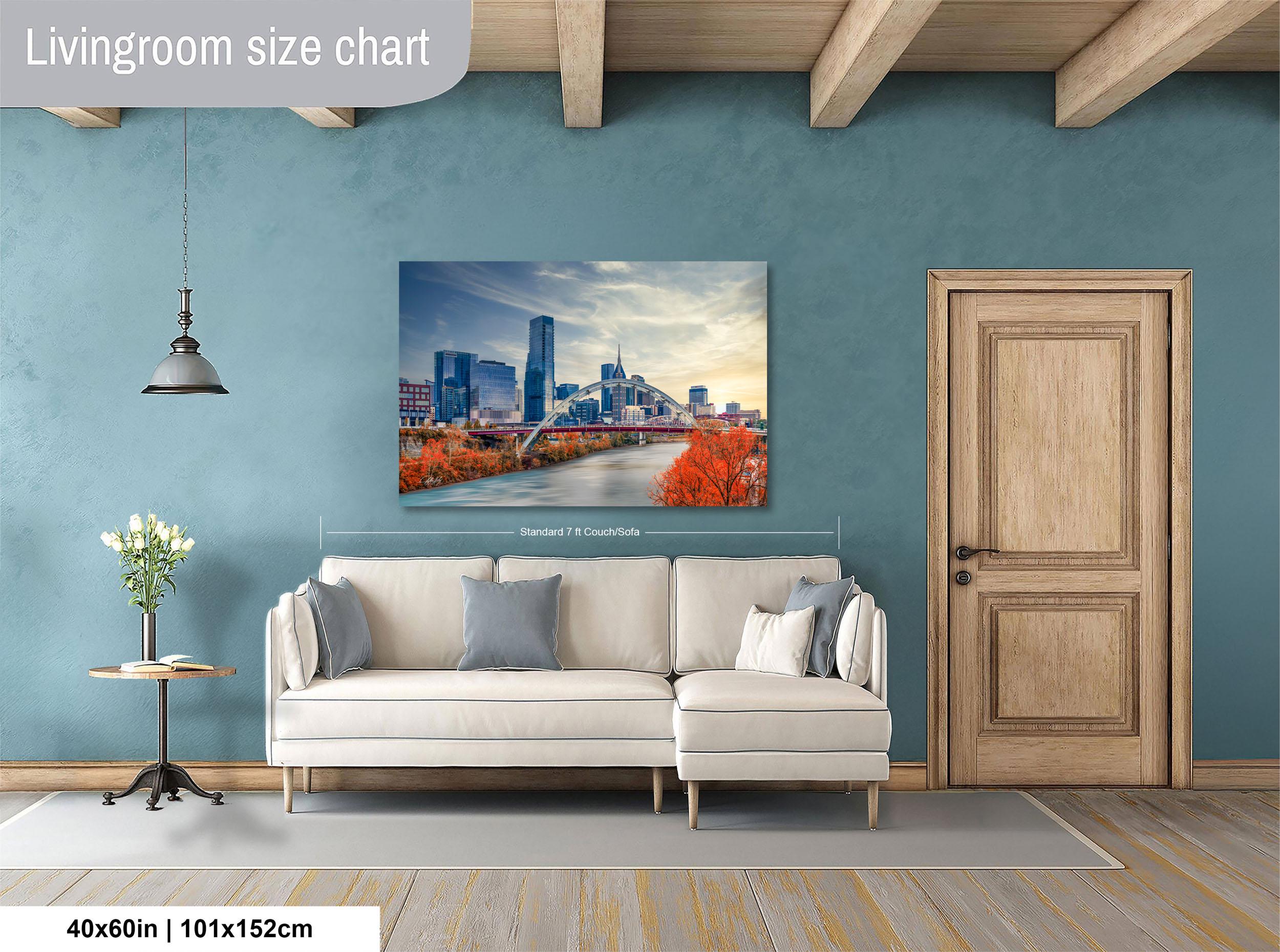 Captured high above the Cumberland River, this music city print freezes a serene moment amidst urban energy and storm calm artwork. The iconic Nashville skyline glows with amber light, framed by the Korean Veterans Bridge, embodying grace and resilience.