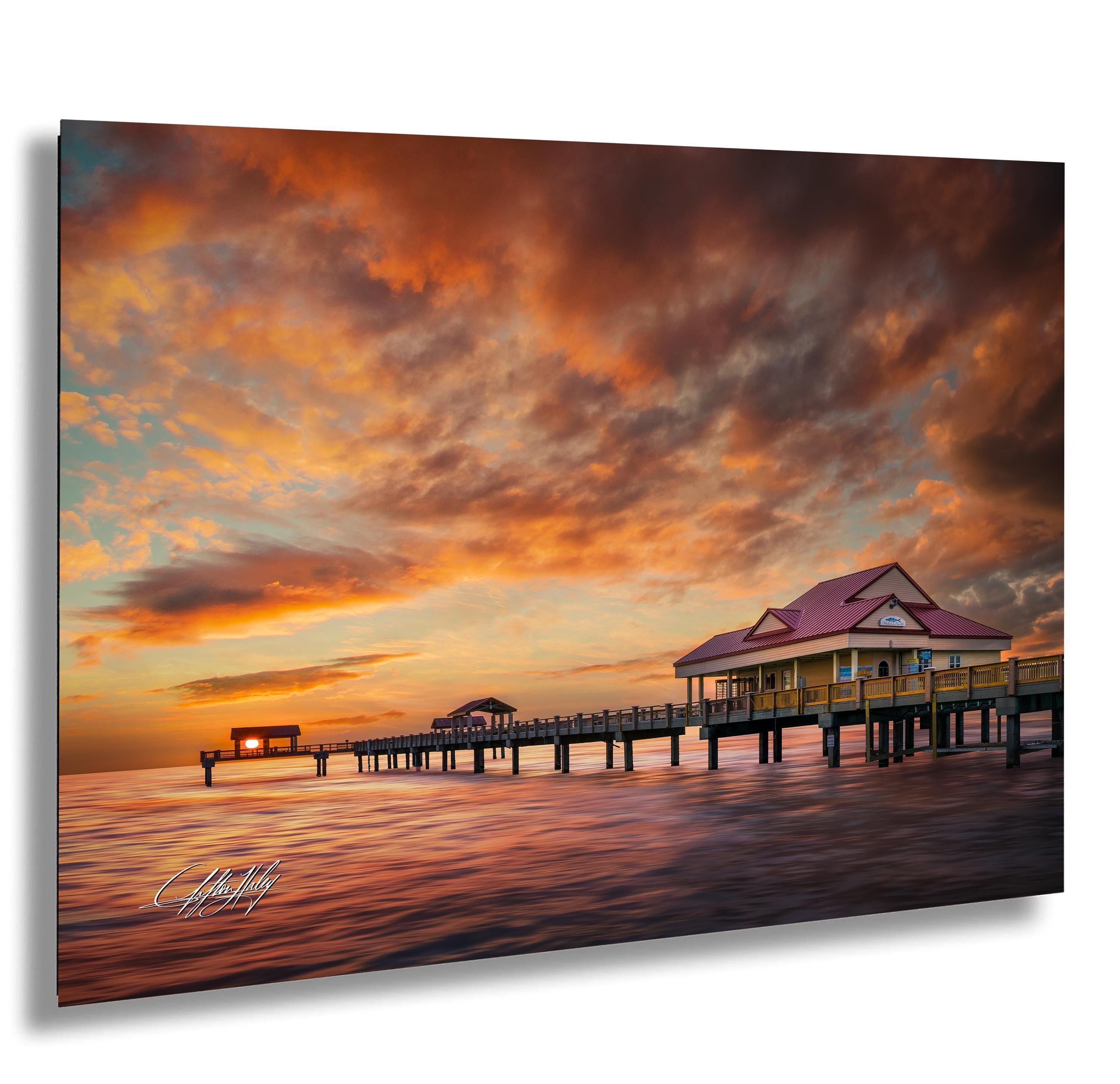 Experience the charm of Clearwater Pier 60, a beloved landmark where every sunset tells a story. This Florida coastal gift celebrates the iconic pier stretching into the shimmering waters, bathed in warm hues of orange, lavender, and indigo. Perfect for lovers of Tampa Bay art and those who cherish the tranquil sunrise ocean view.