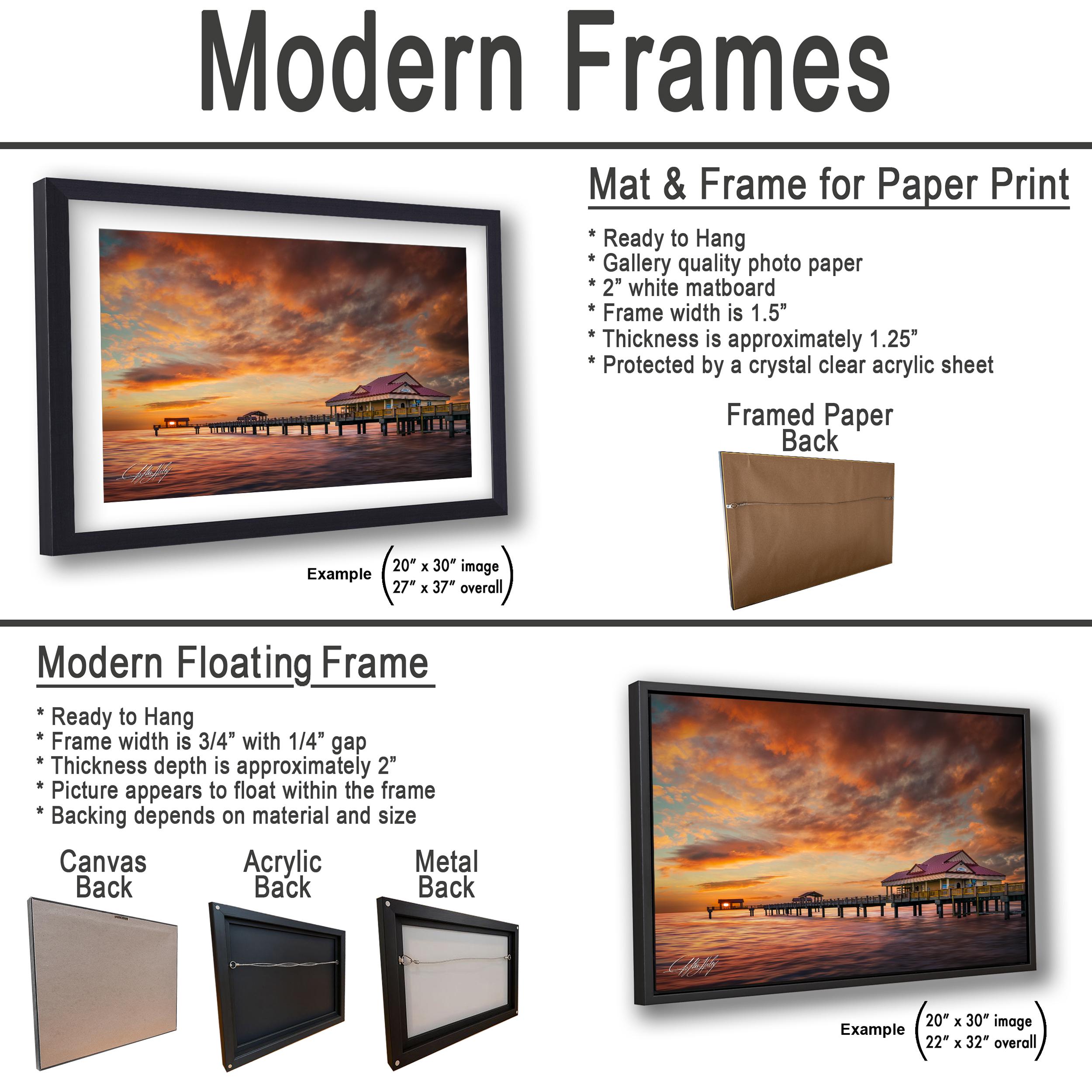 Key features: - Available as framed paper prints, acrylics, aluminum/metal prints with a 2" white mat border - Canvas prints are flush mounted without a mat border - Designed to bring the essence of Florida beach sunset into your living space
