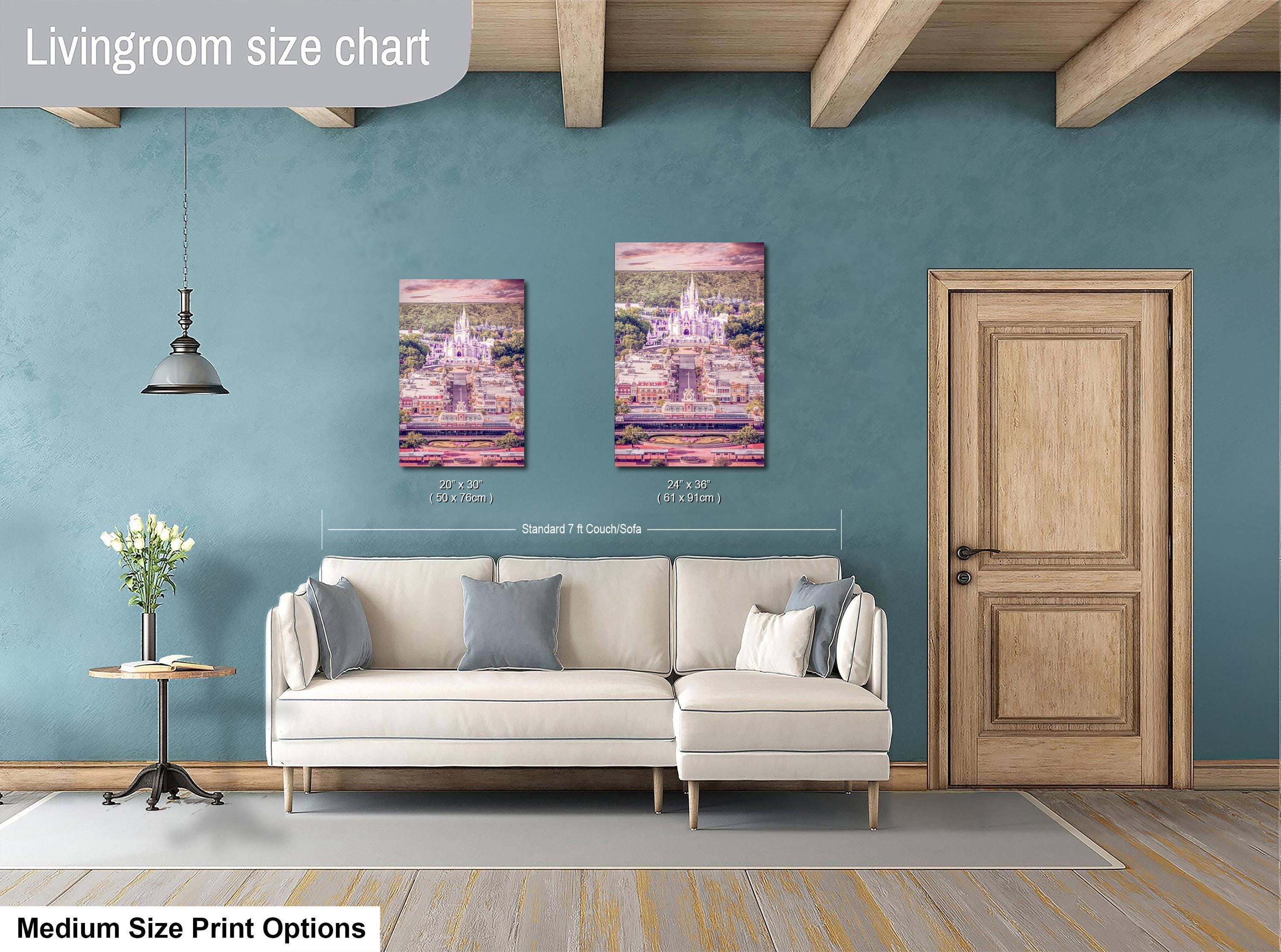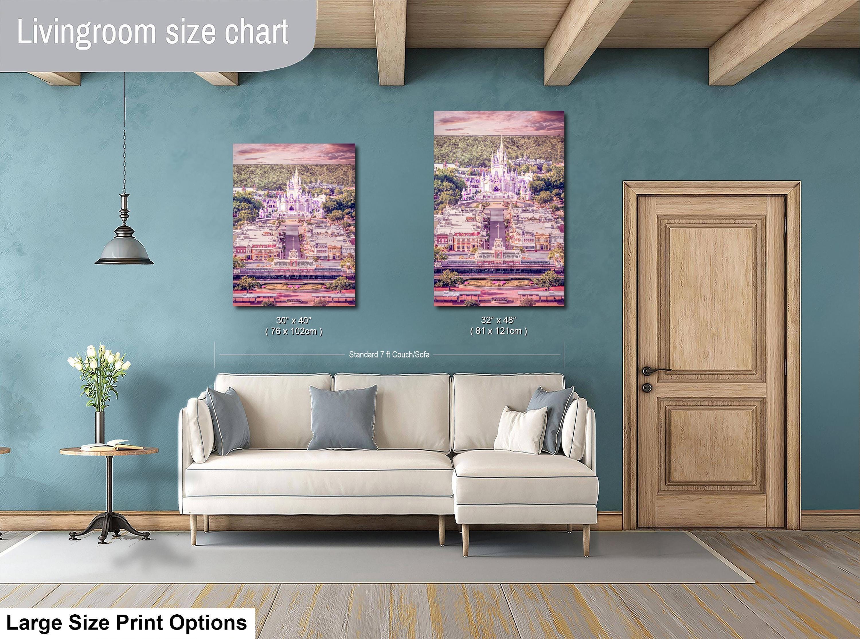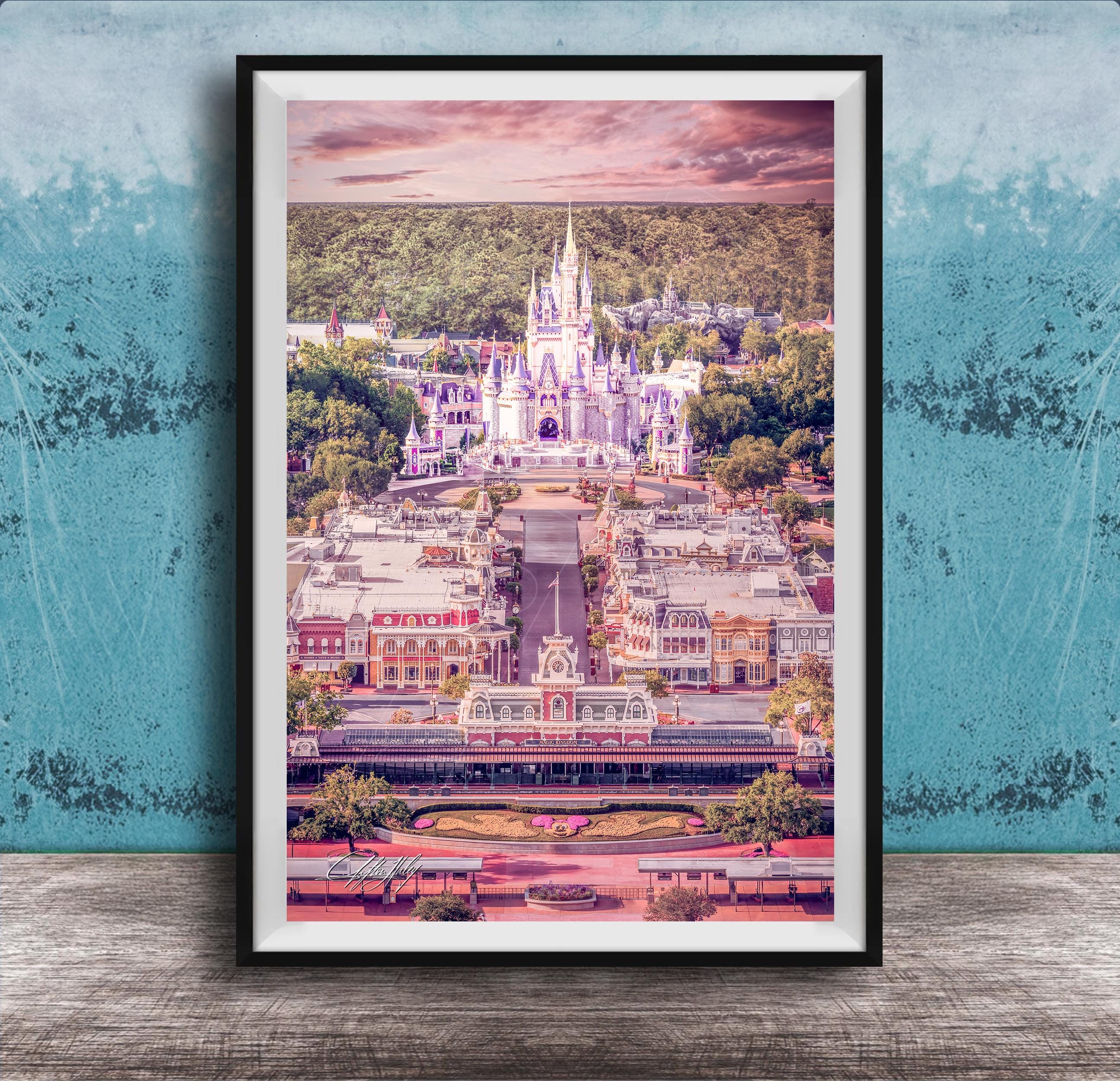 Discover the magic of a Disney World print that captures the enchanting glow of the Princess Castle at sunset. This pastel pink decor piece brings a touch of Florida's charm and the nostalgic warmth of Main Street right into your home.