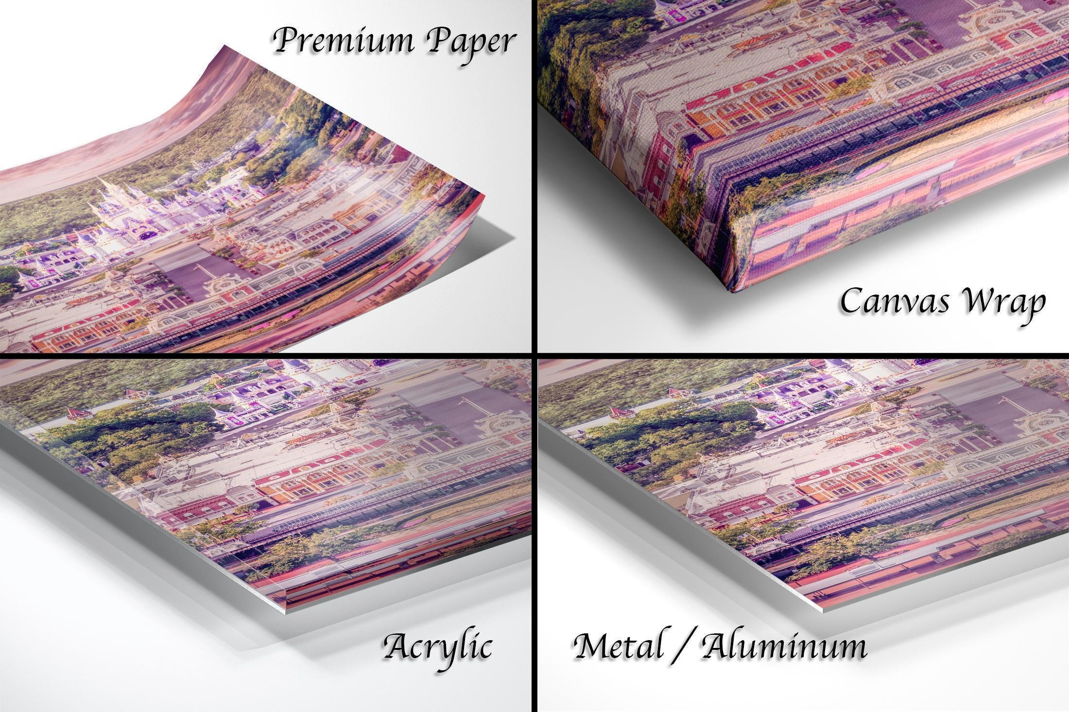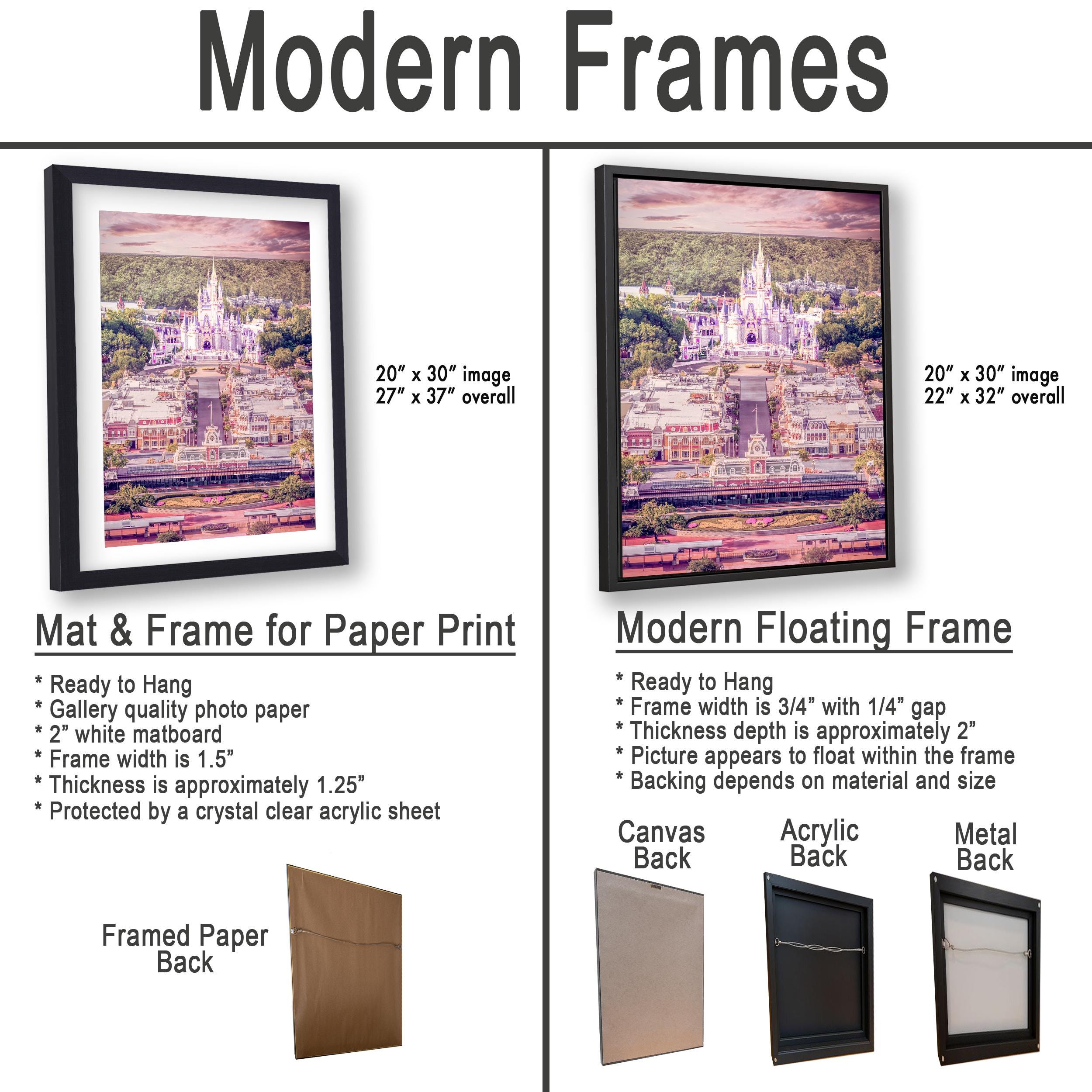 1. Framed paper prints, acrylics, and metal prints include a 2" white mat border. 2. Canvas prints are flush mounted with no mat border.