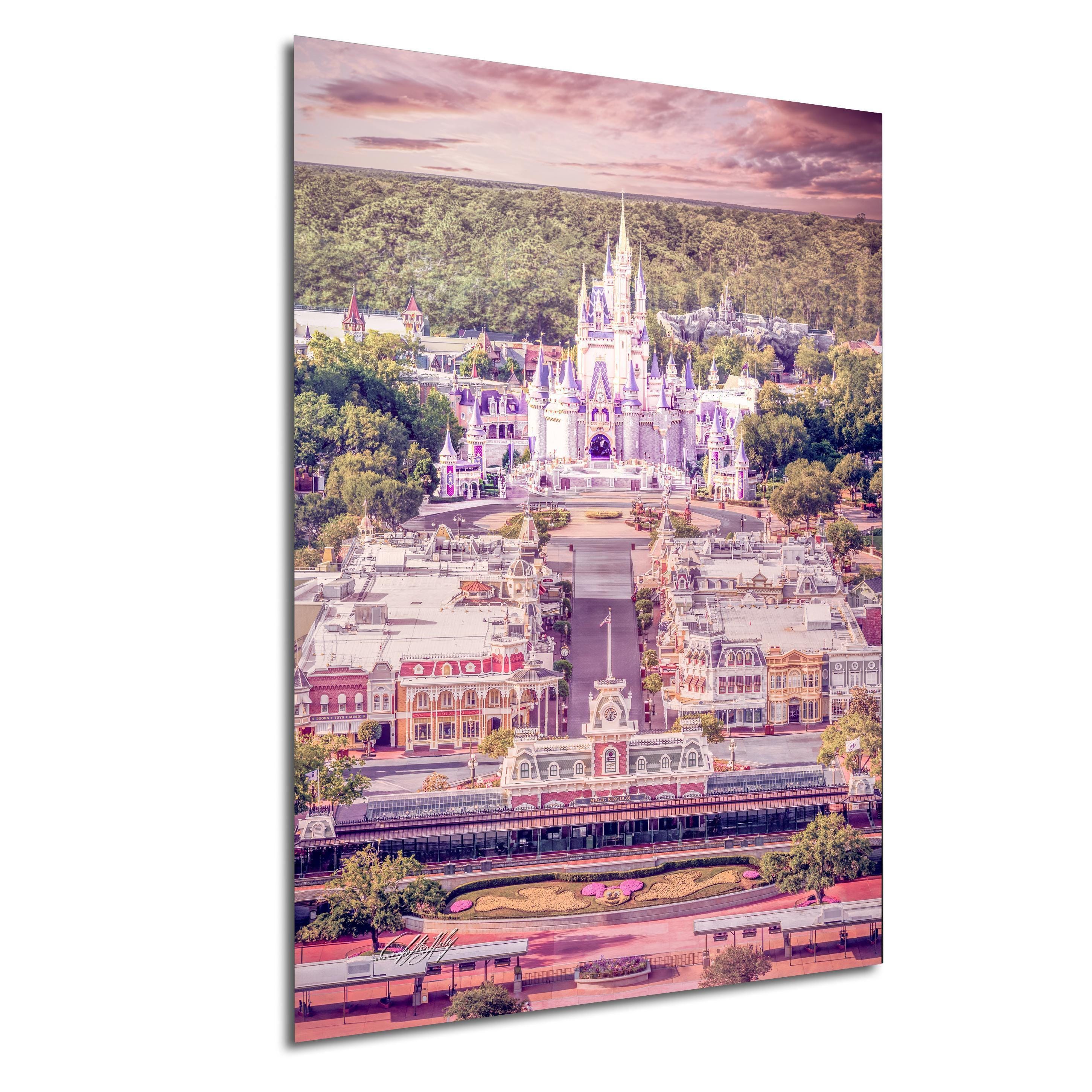 There’s a special place in Orlando known as the "Happiest Place on Earth," where every corner tells a story. This fine art print reflects the timeless wonder of Walt Disney's dream, featuring the iconic castle framed by candy-colored storefronts and flickering gas lamps along Main Street, USA.