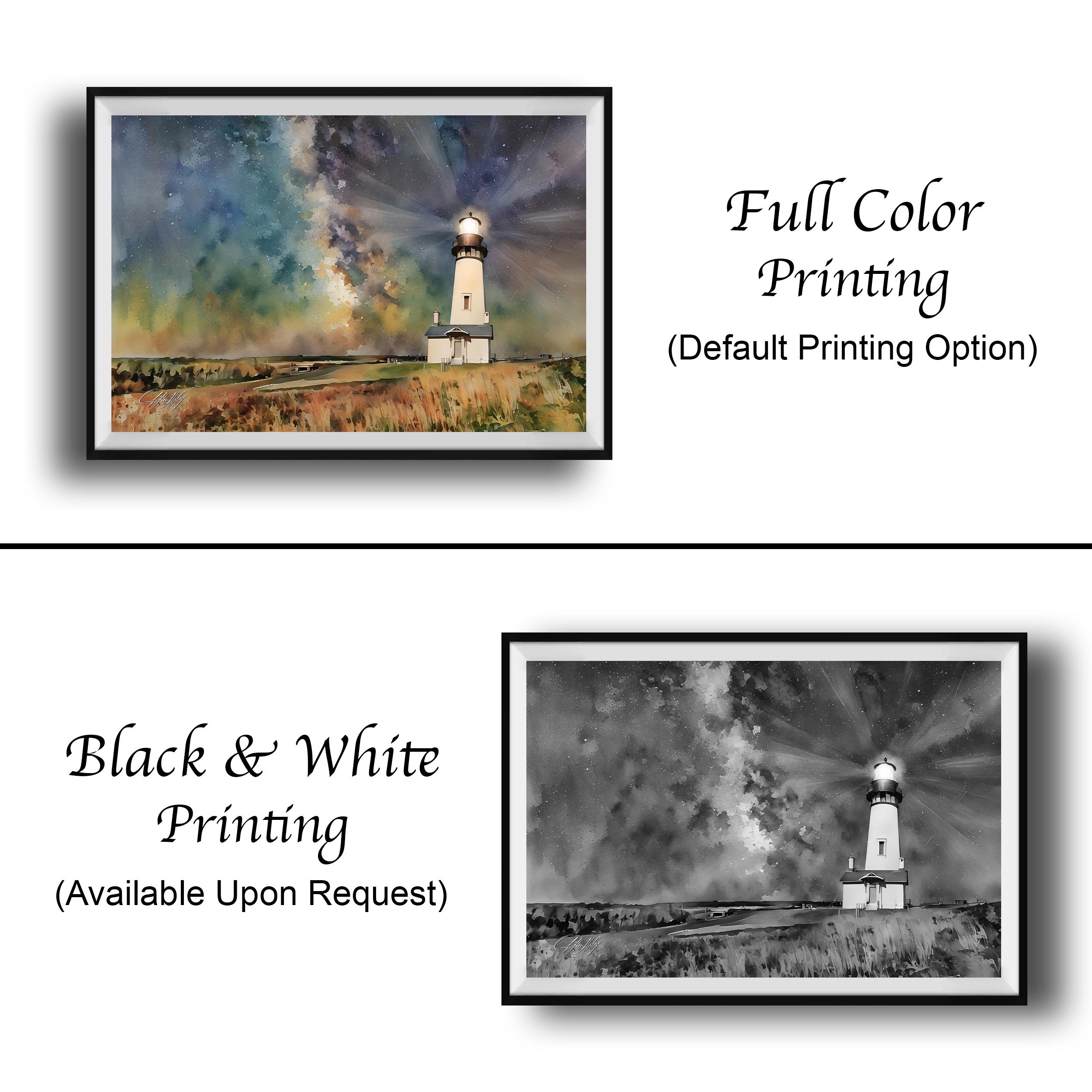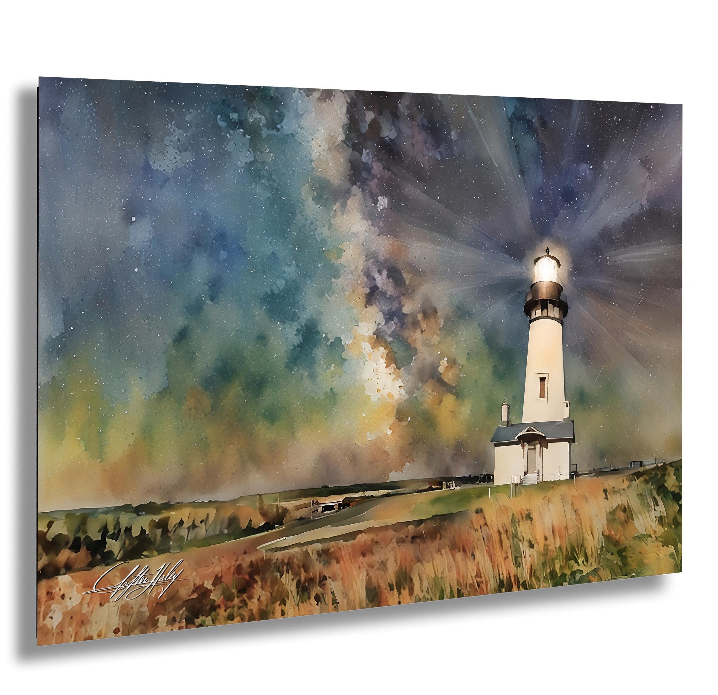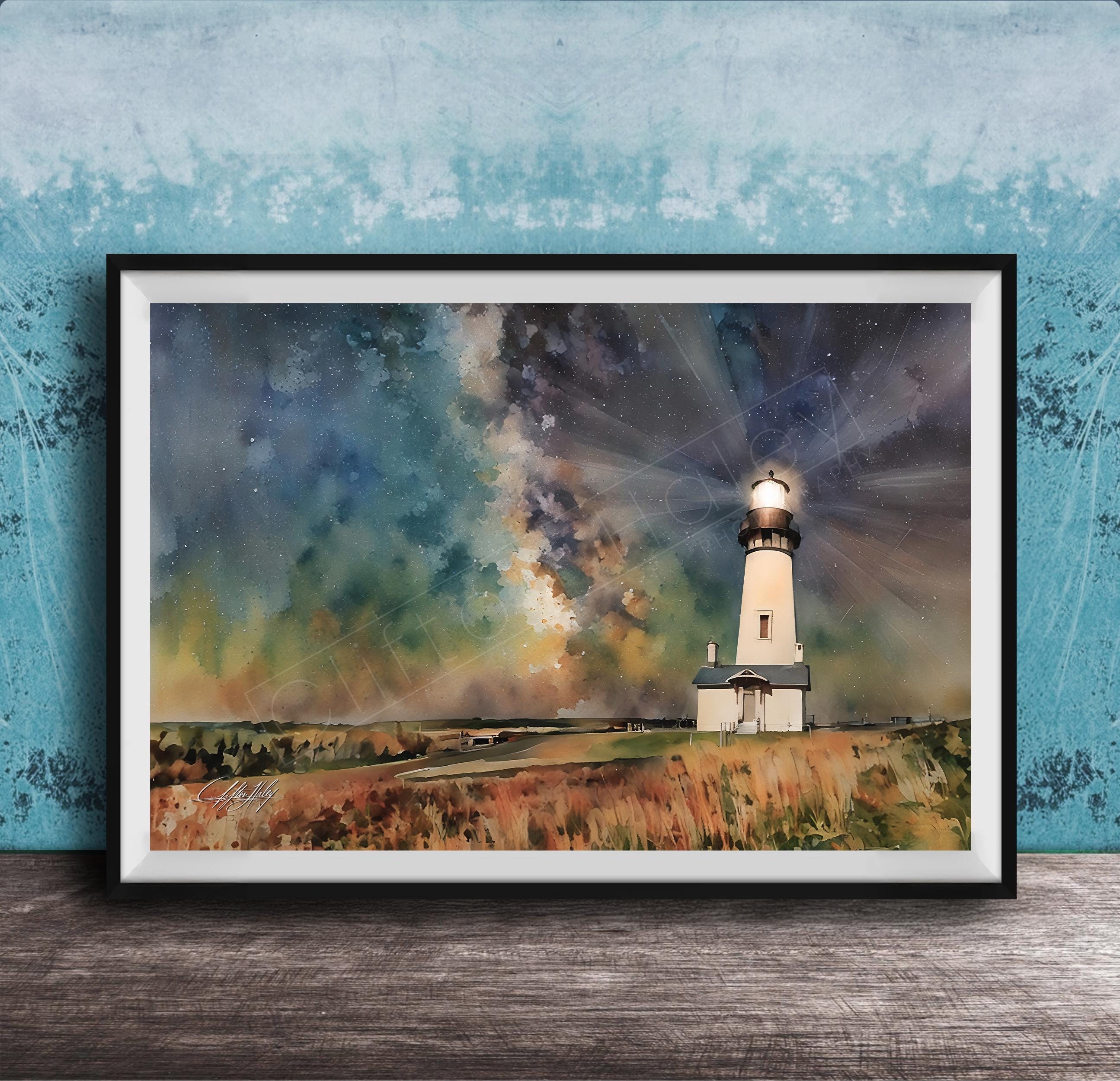 Discover the stunning Yaquina Head Lighthouse art, featuring a watercolor painting and fine art print capturing the sunset lighthouse and cliff top view in Newport Oregon.