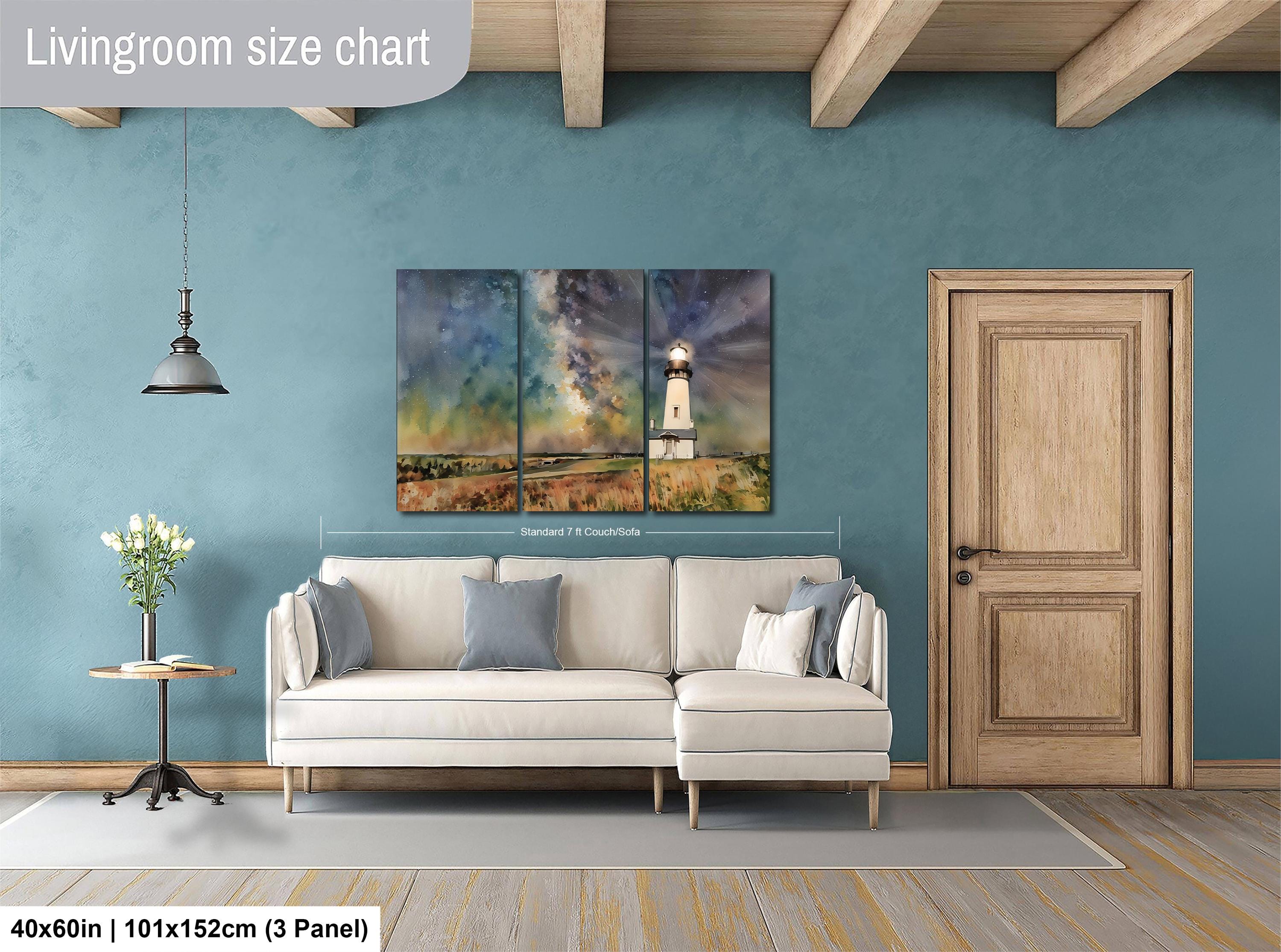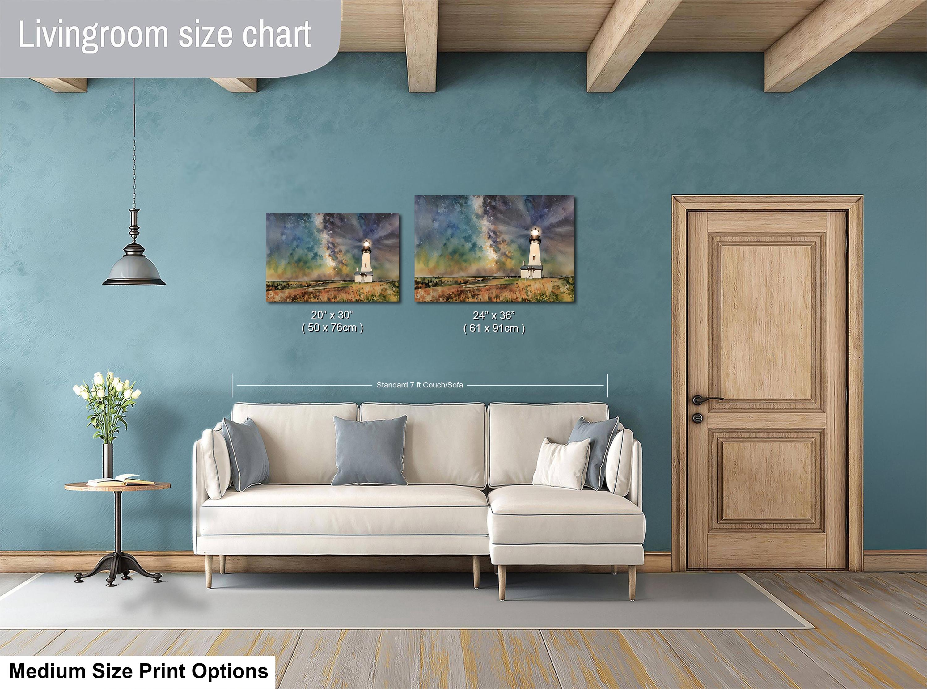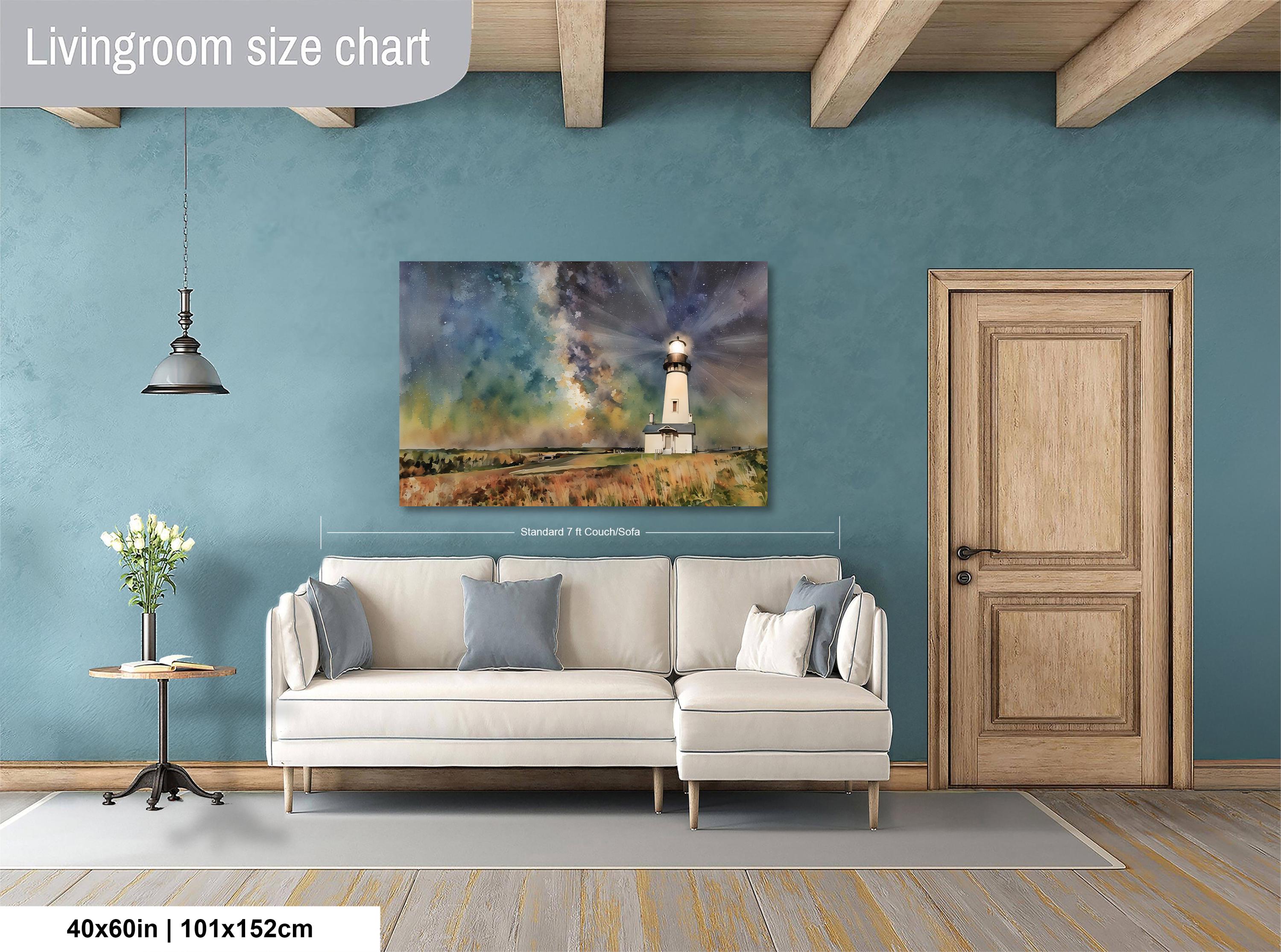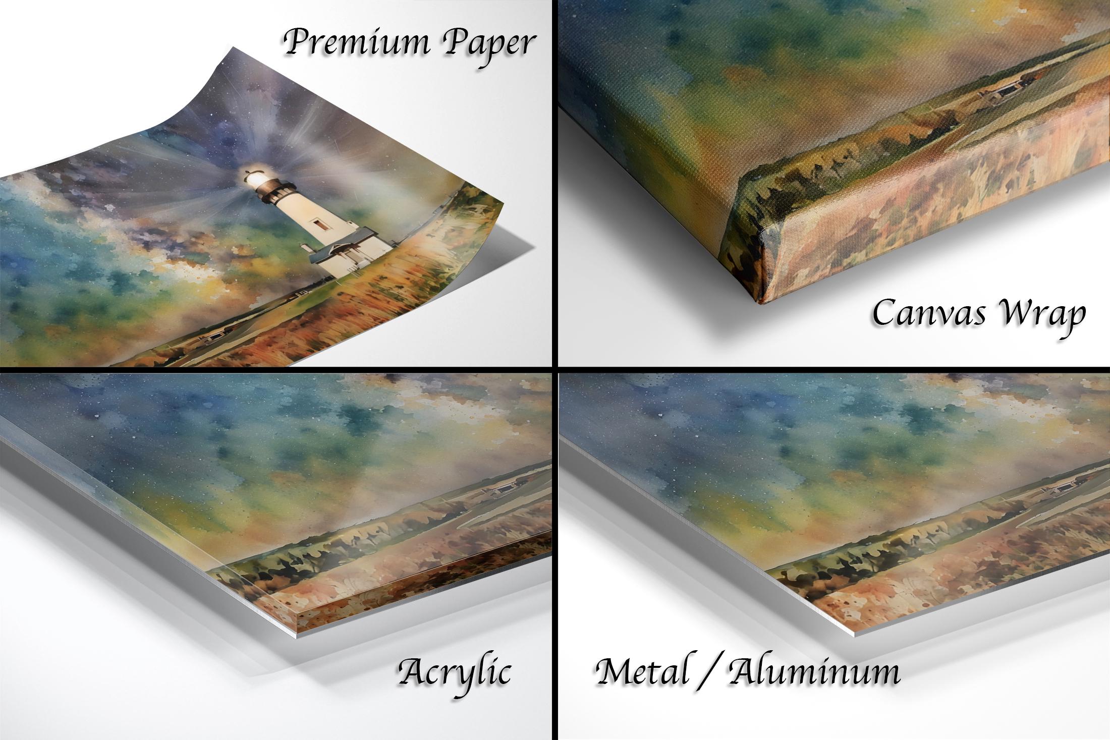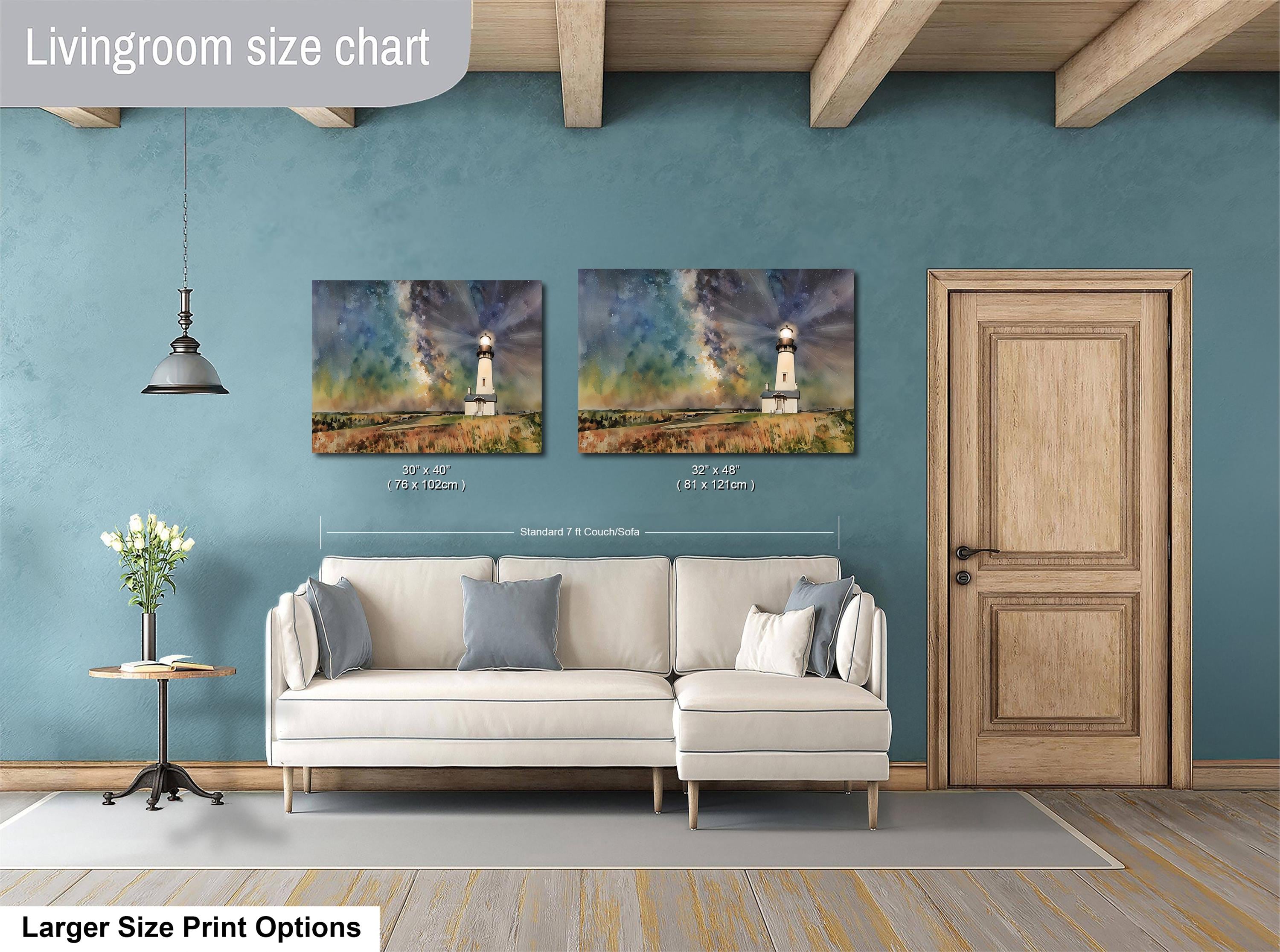 As the sun dipped below the horizon over the Pacific Ocean, this coastal wall decor brings to life the breathtaking scene from Yaquina Head Lighthouse. The artwork vividly portrays the lighthouse standing tall on the rocky path, illuminated by the warm glow of sunset, making it an ideal piece for lovers of nautical themes and serene landscapes.