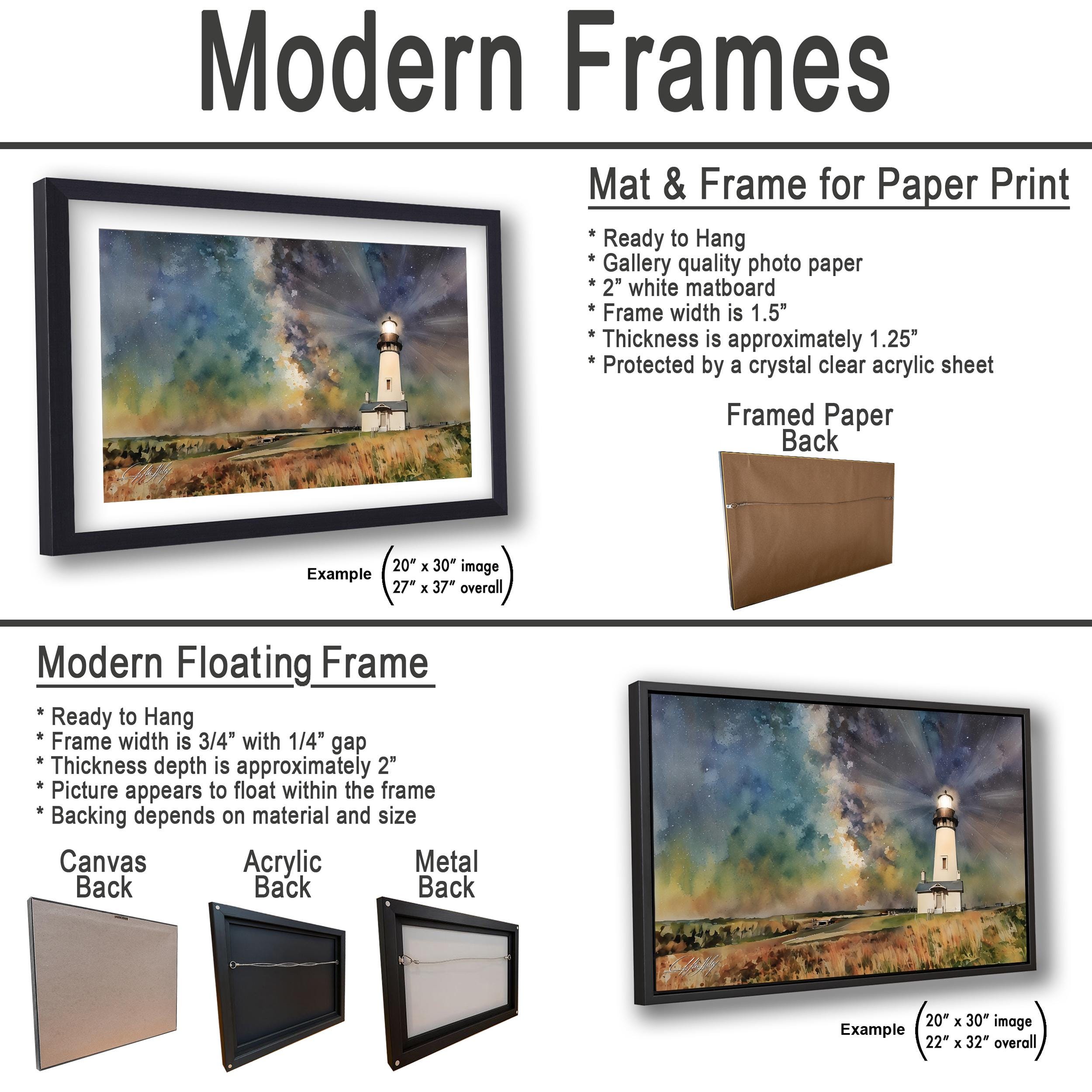 3.1) Only framed paper prints, acrylics and aluminum/metal prints will have a 2" white mat border. 3.2) Canvas prints will be a flush mounted (no mat border) to the frame.