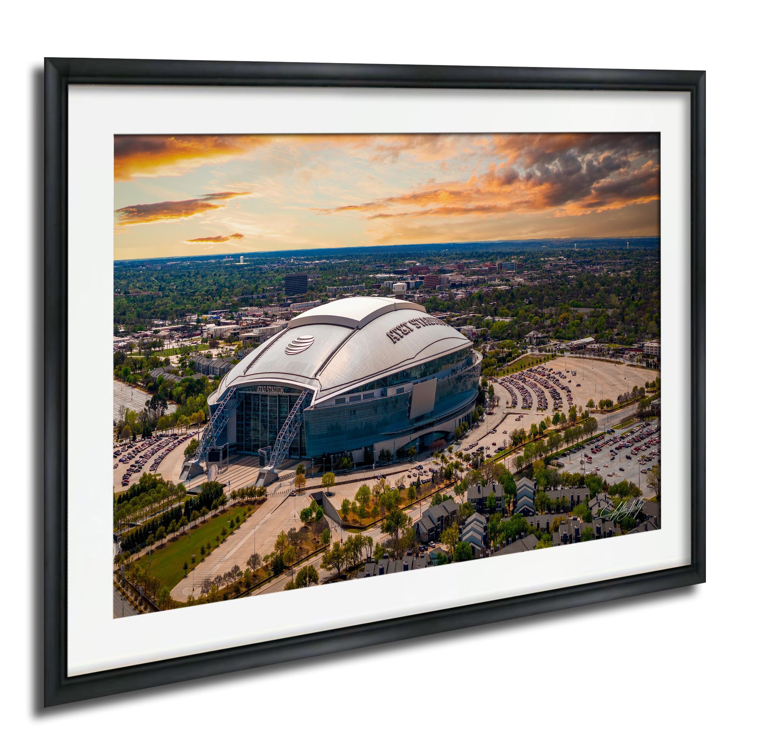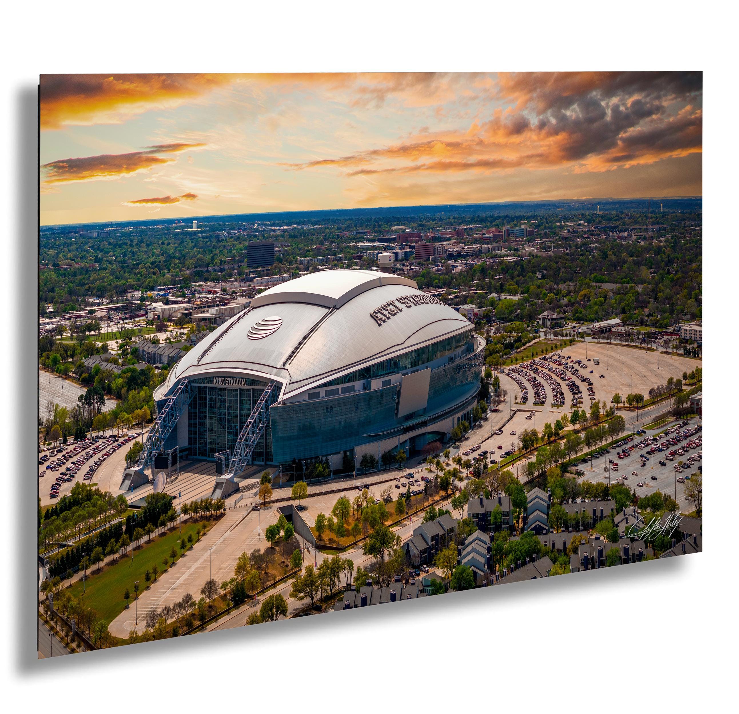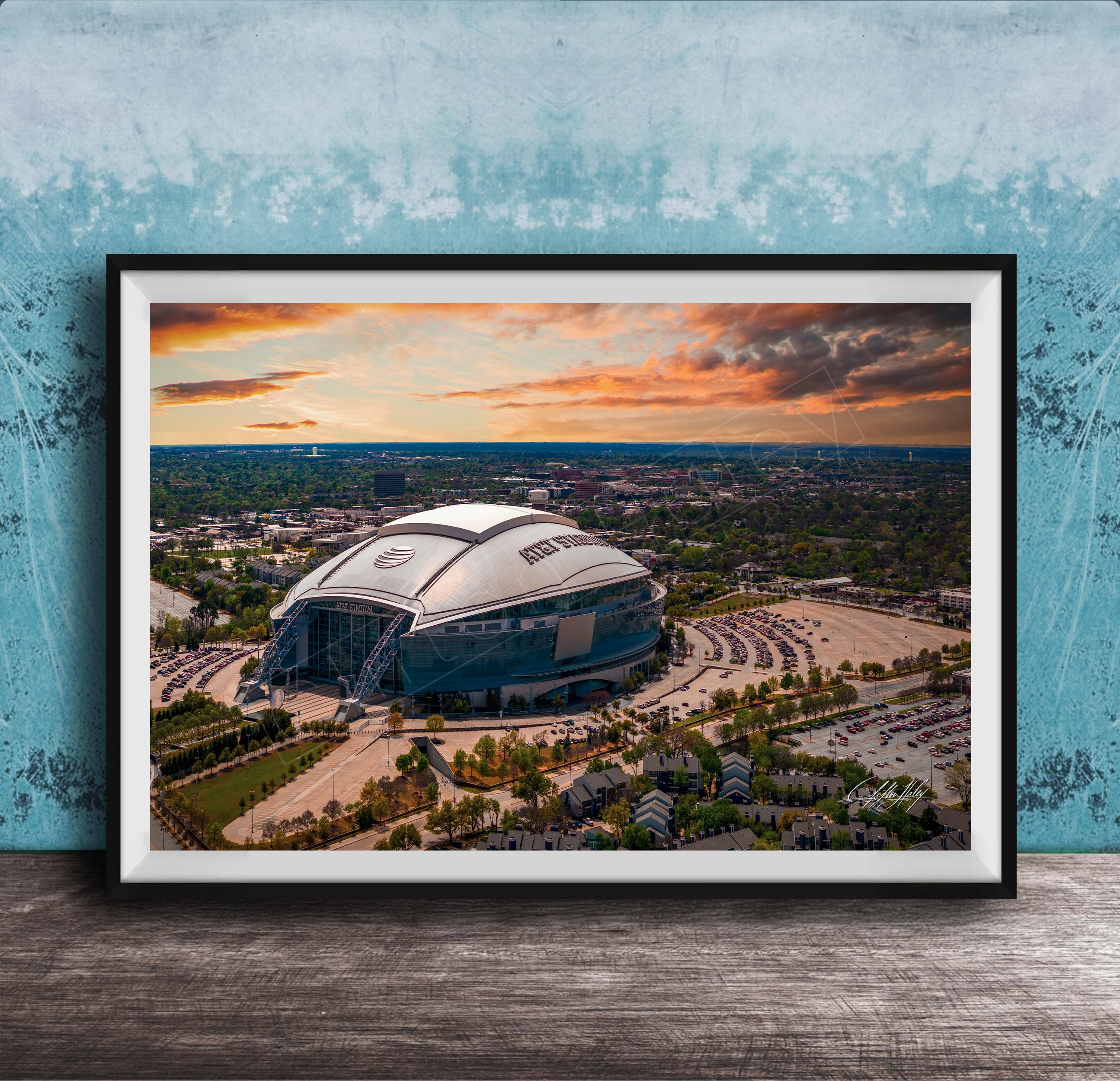 Experience the spirit of Dallas Cowboys Stadium artwork that captures the iconic AT&T Stadium in a stunning watercolor illustration. This NFL sports decor piece brings Texas pride and Cowboys Nation right into your home with a breathtaking sunset stadium print.