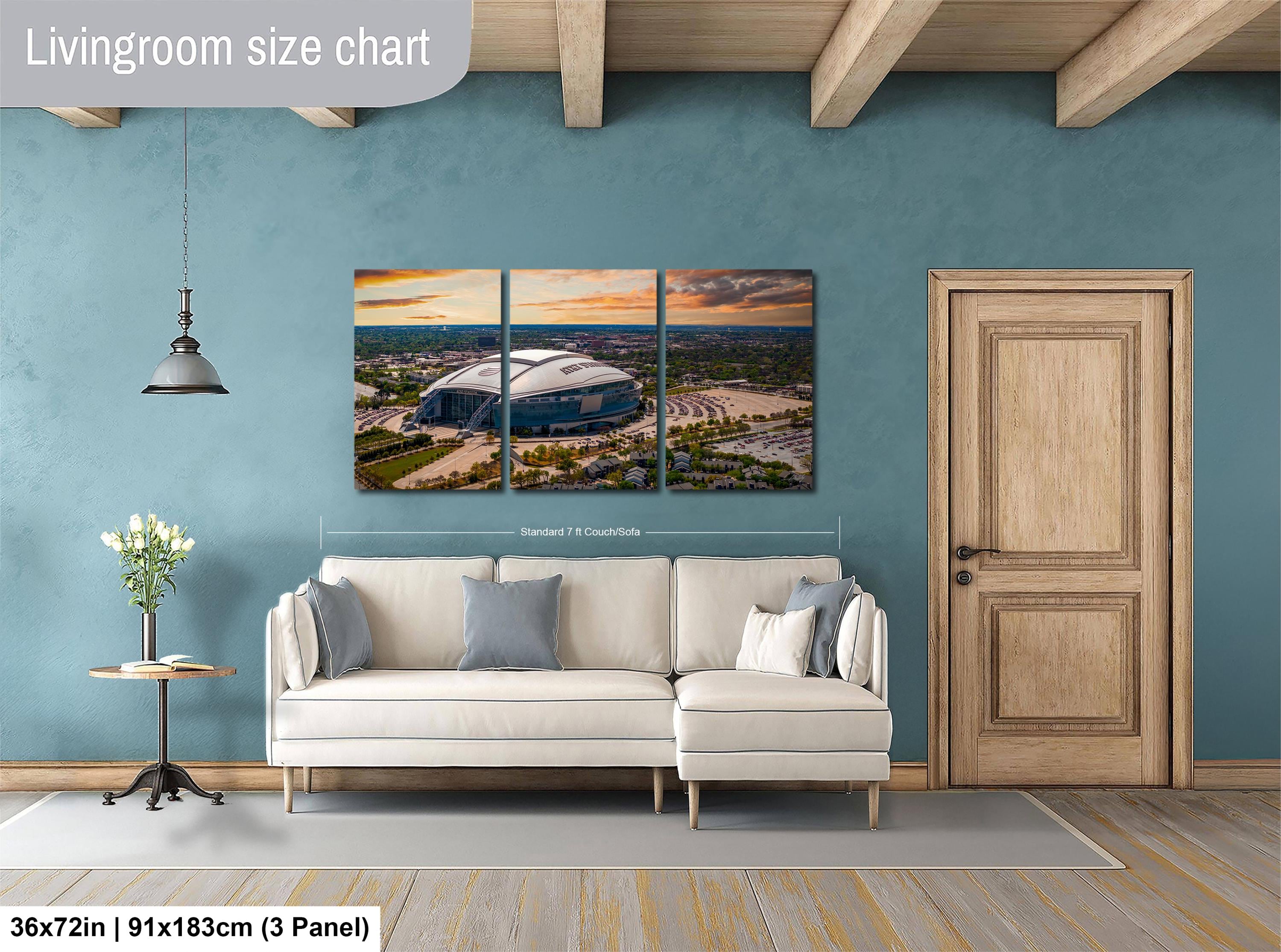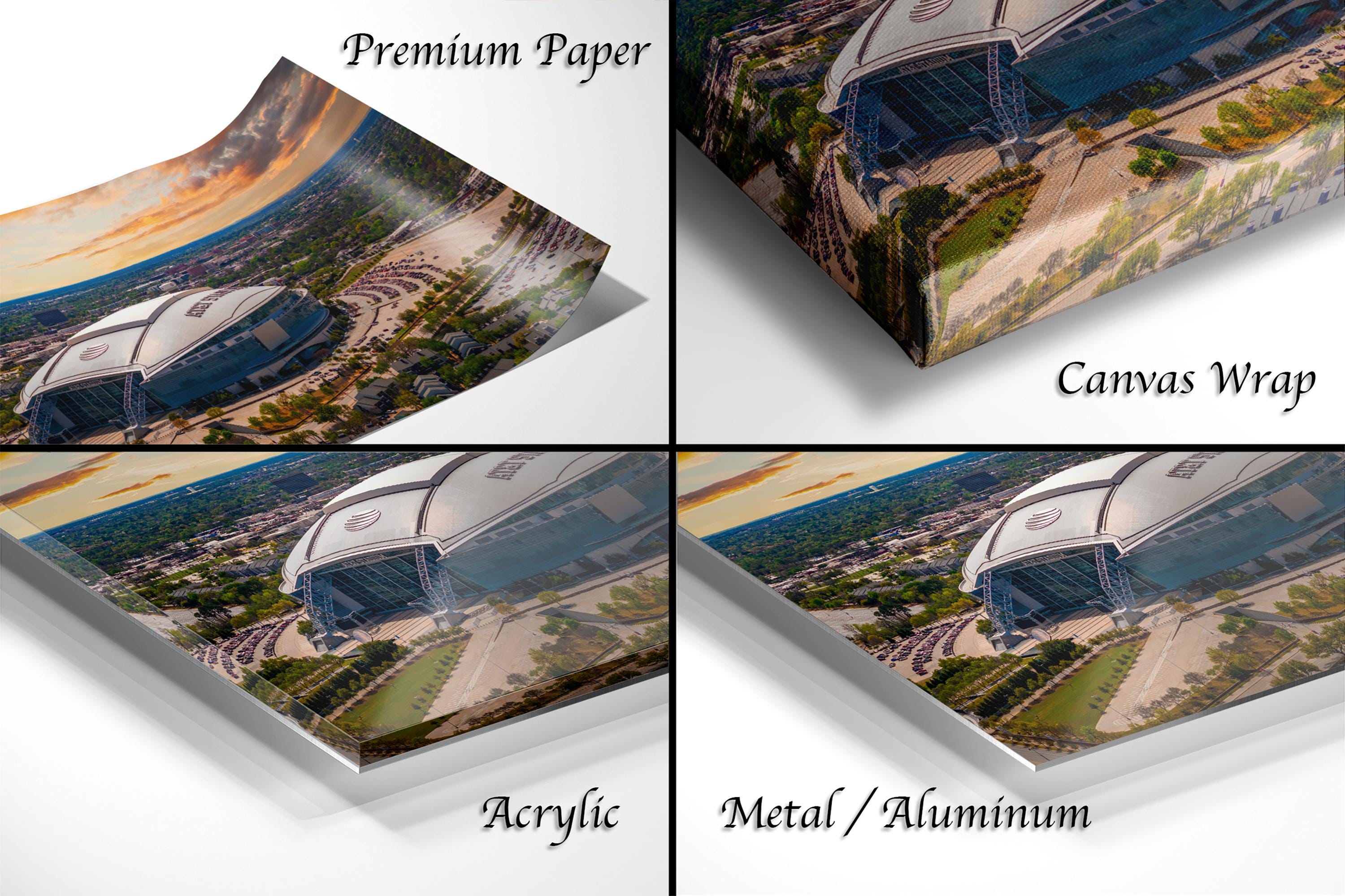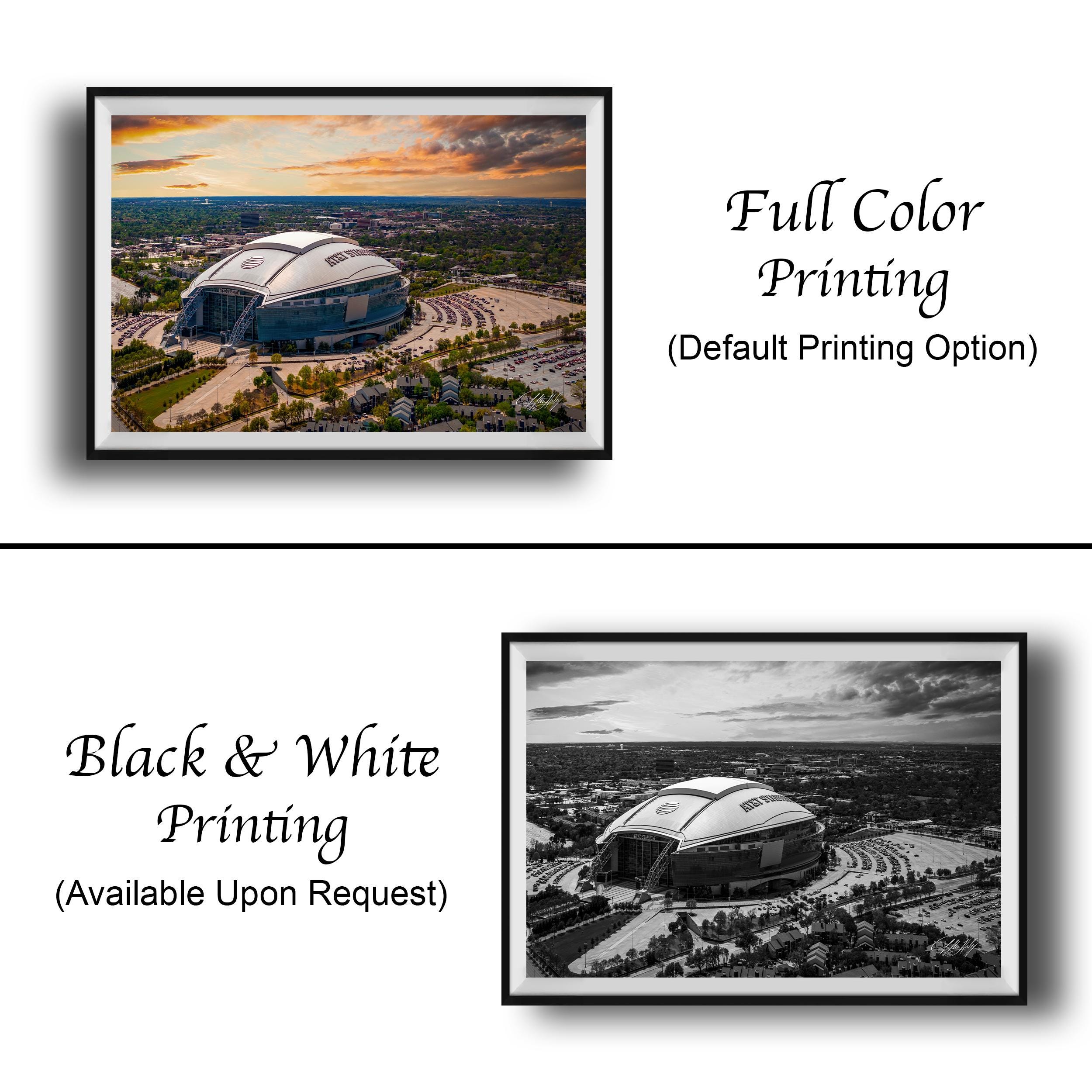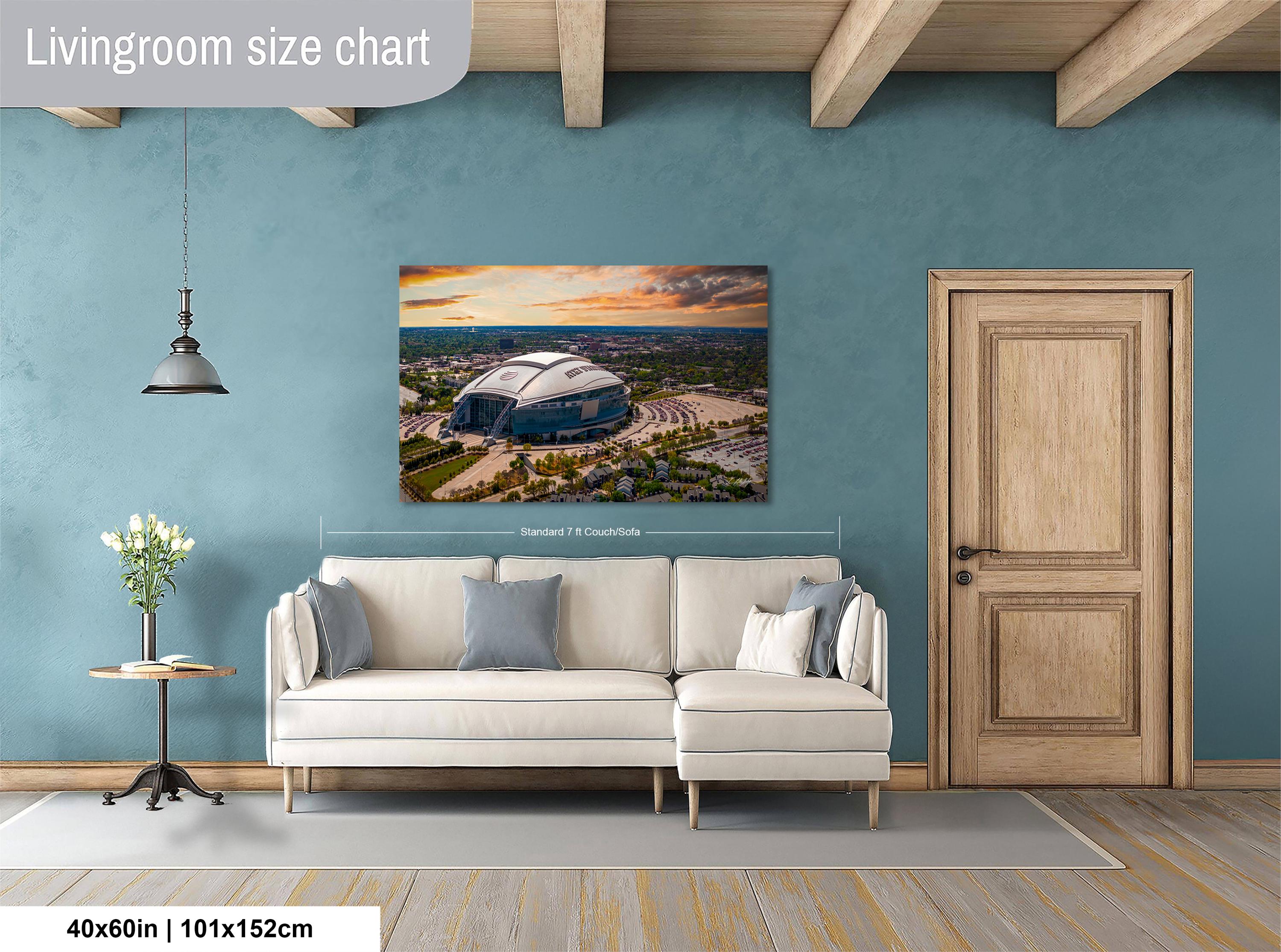 Experience the spirit of Dallas Cowboys Stadium artwork that captures the iconic AT&T Stadium in a stunning watercolor illustration. This NFL sports decor piece brings Texas pride and Cowboys Nation right into your home with a breathtaking sunset stadium print.