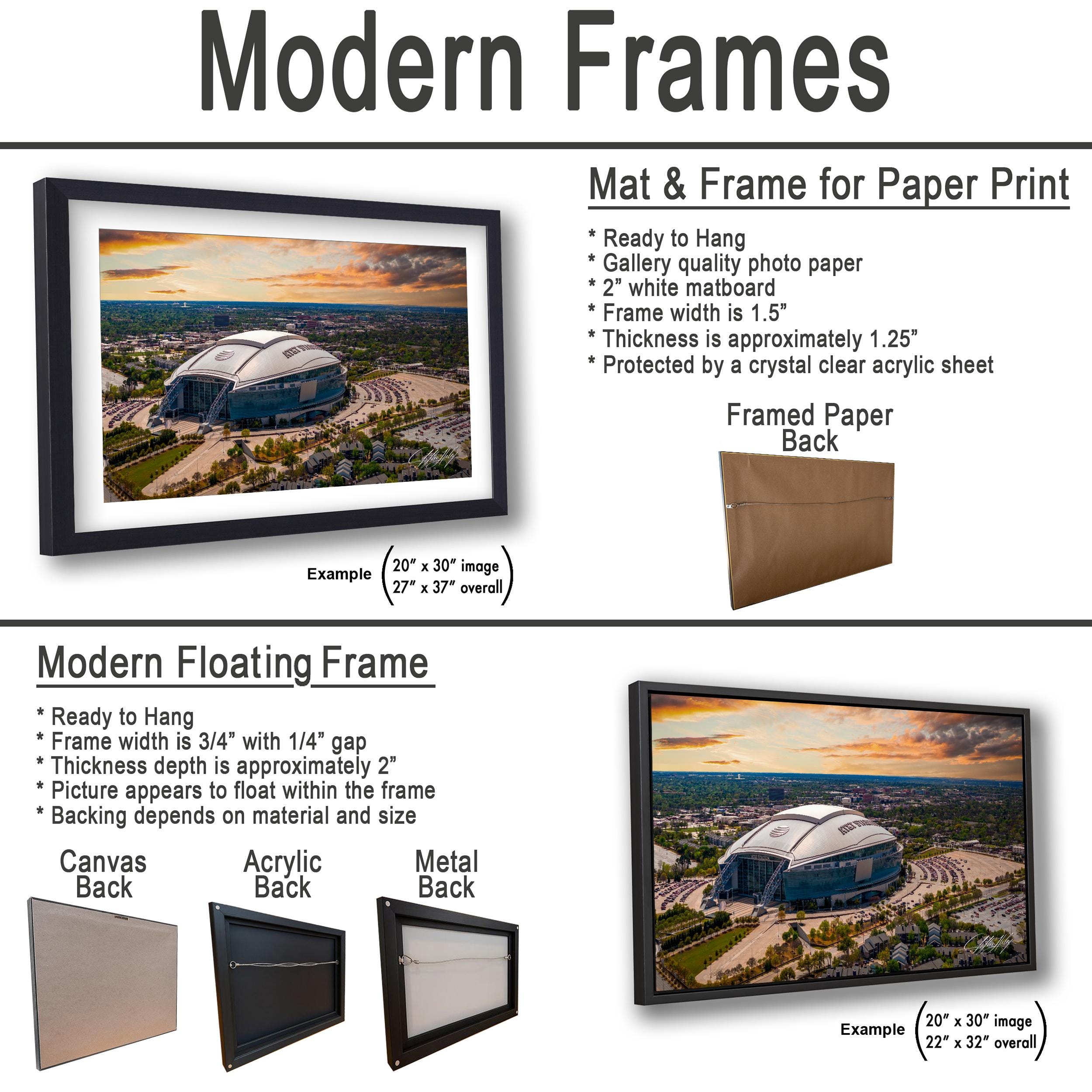 3.1) Only framed paper prints, acrylics and aluminum/metal prints will have a 2" white mat border. 3.2) Canvas prints will be a flush mounted (no mat border) to the frame.