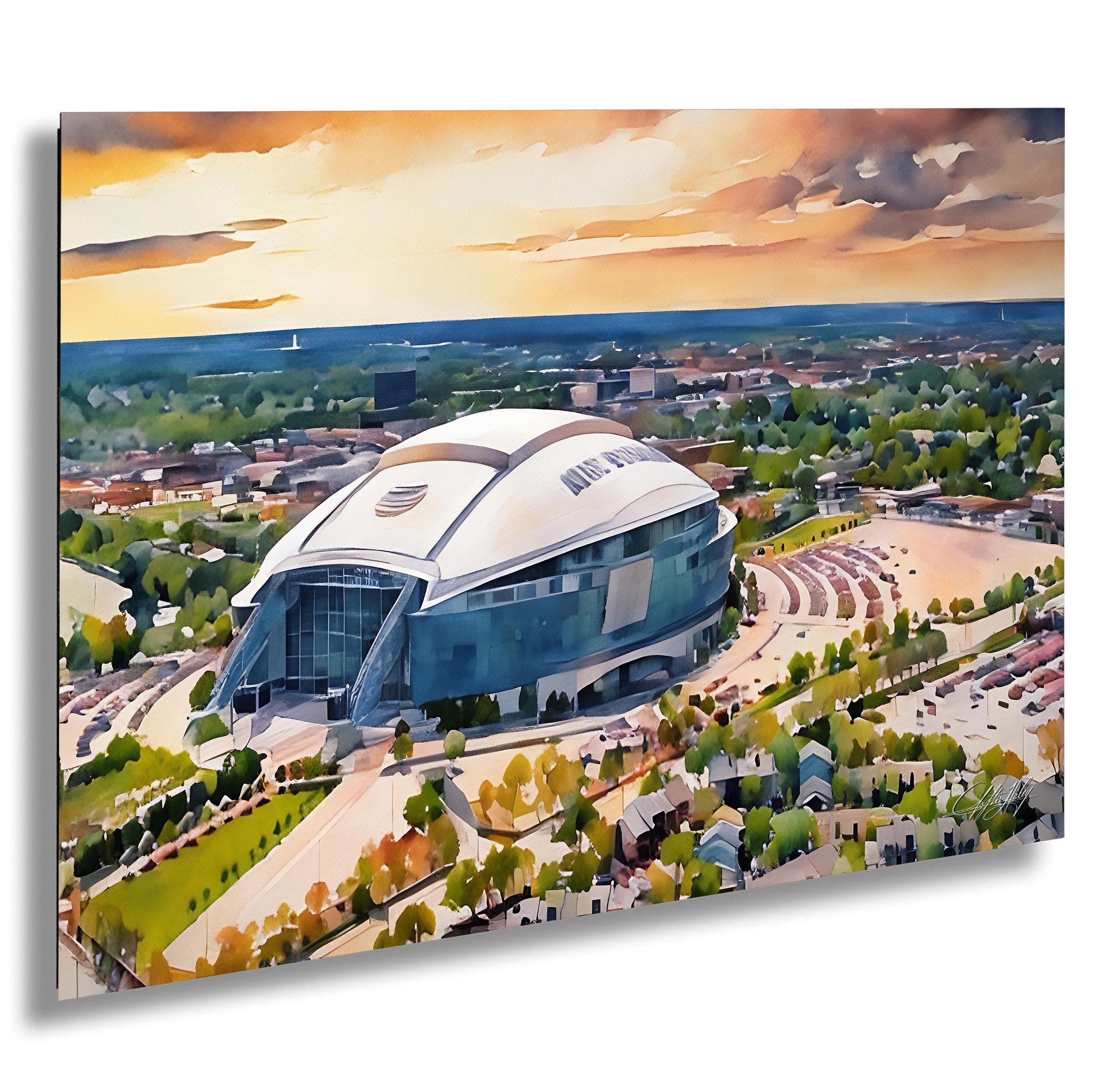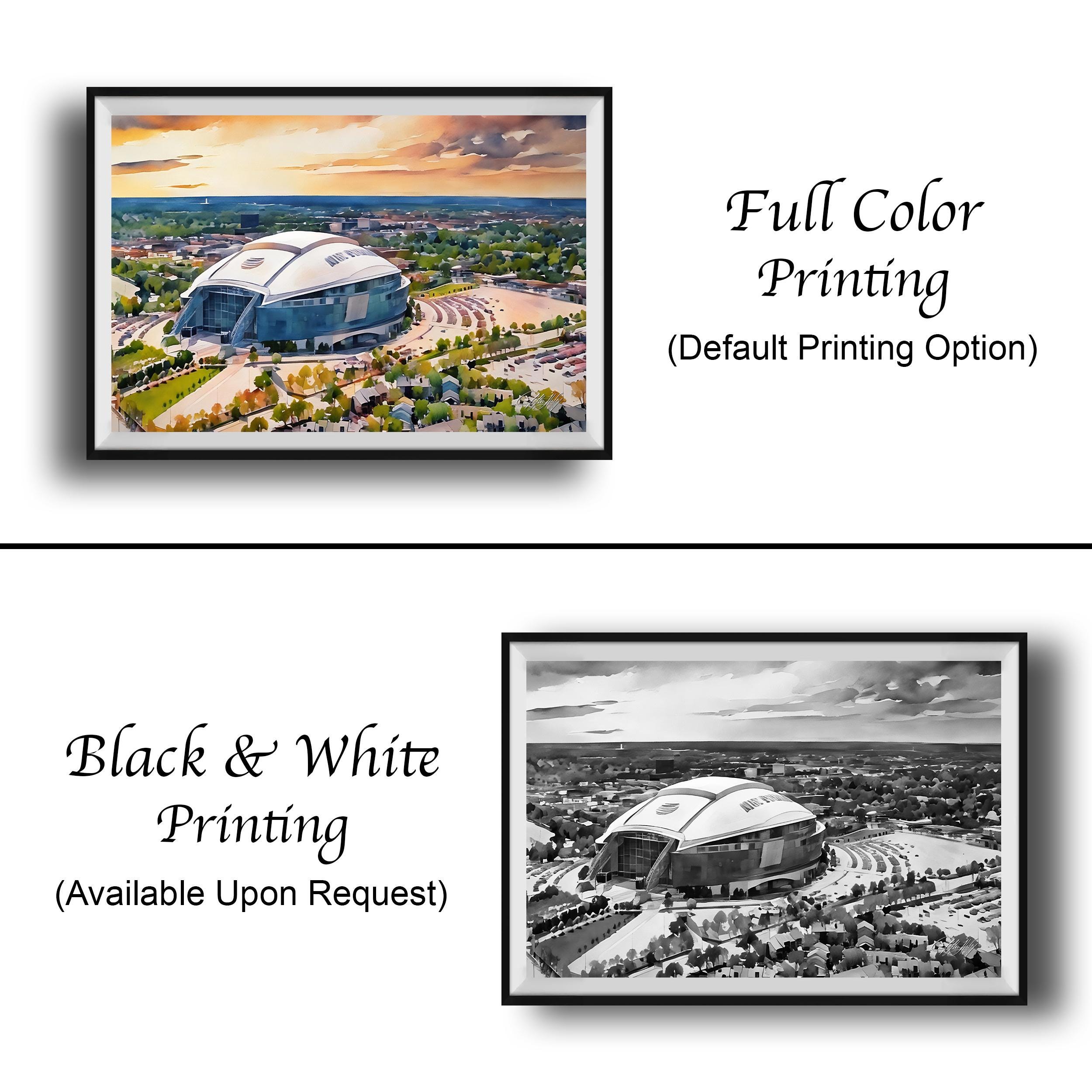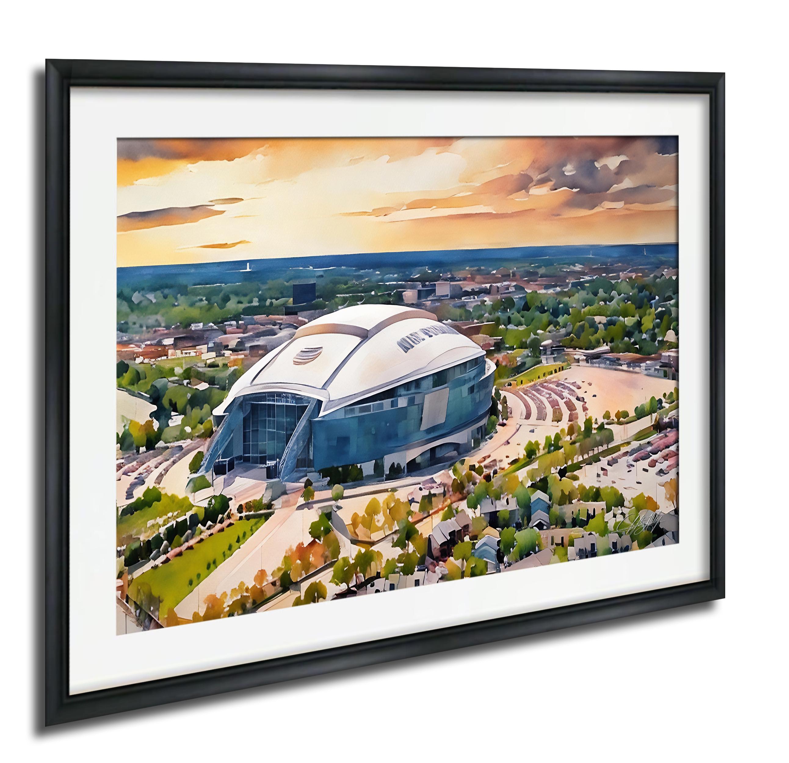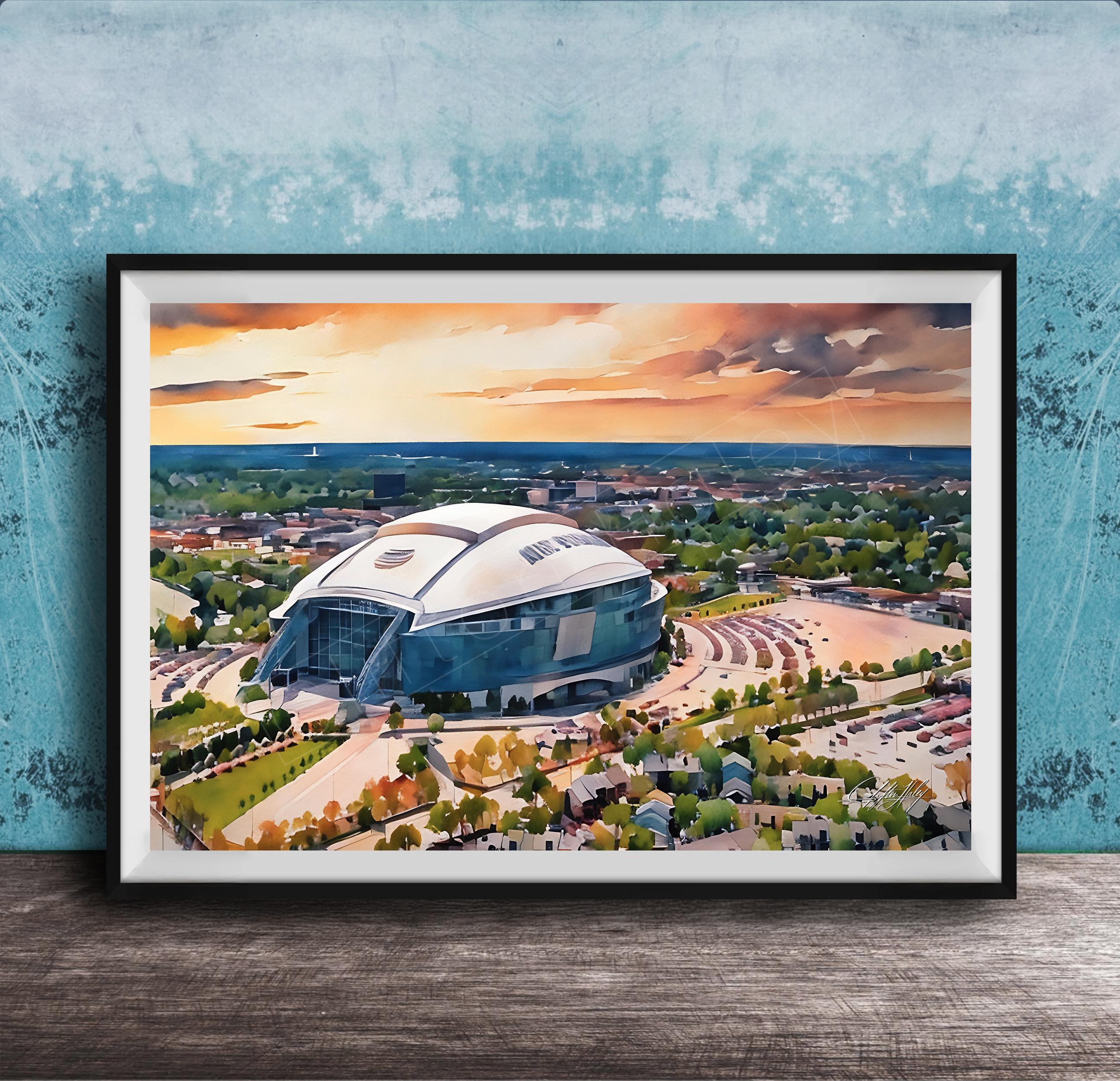 Experience the spirit of Dallas Cowboys Stadium artwork that captures the iconic AT&T Stadium in a stunning watercolor illustration. This NFL sports decor piece brings Texas pride and Cowboys Nation right into your home with a breathtaking sunset stadium print.
