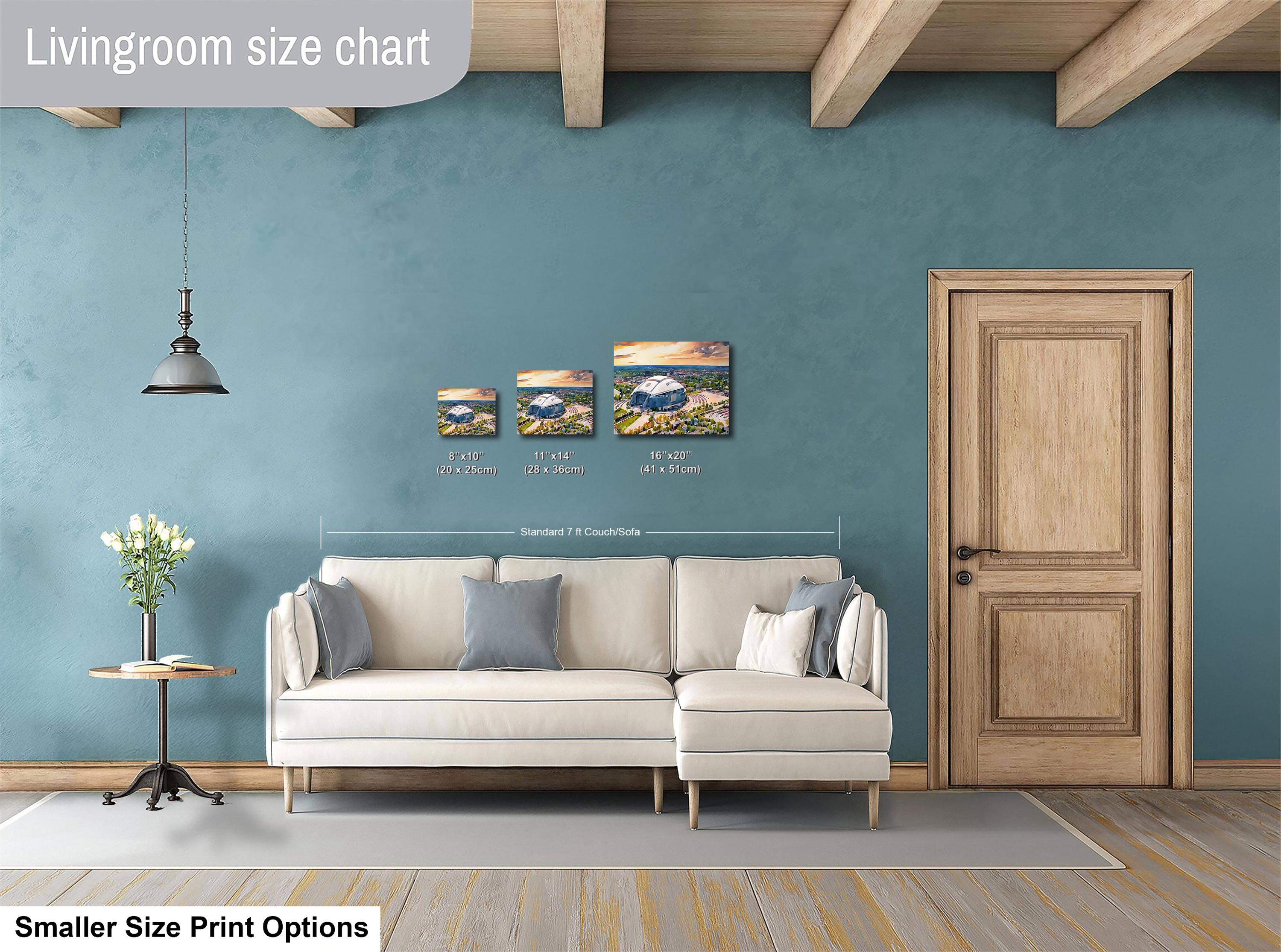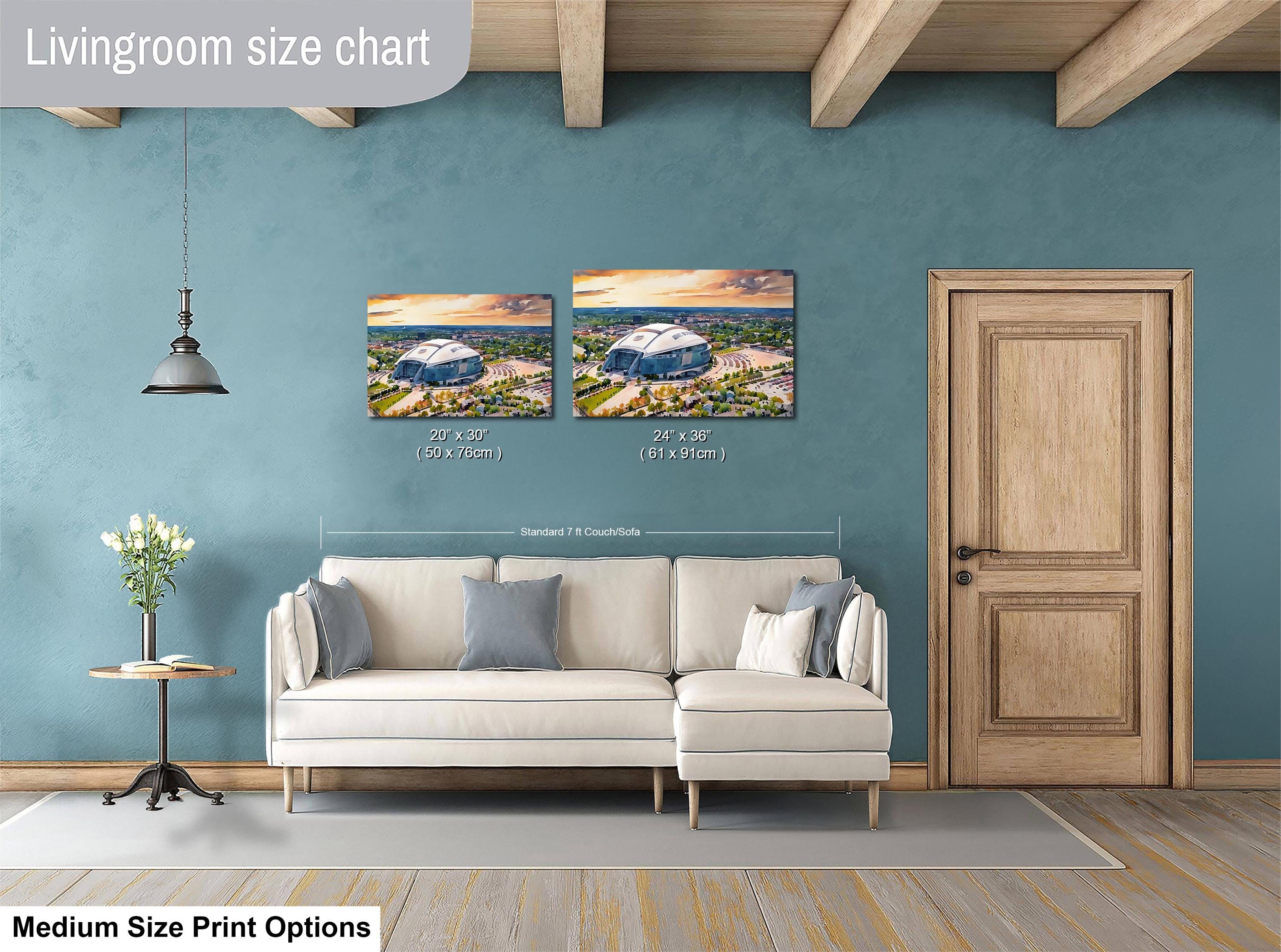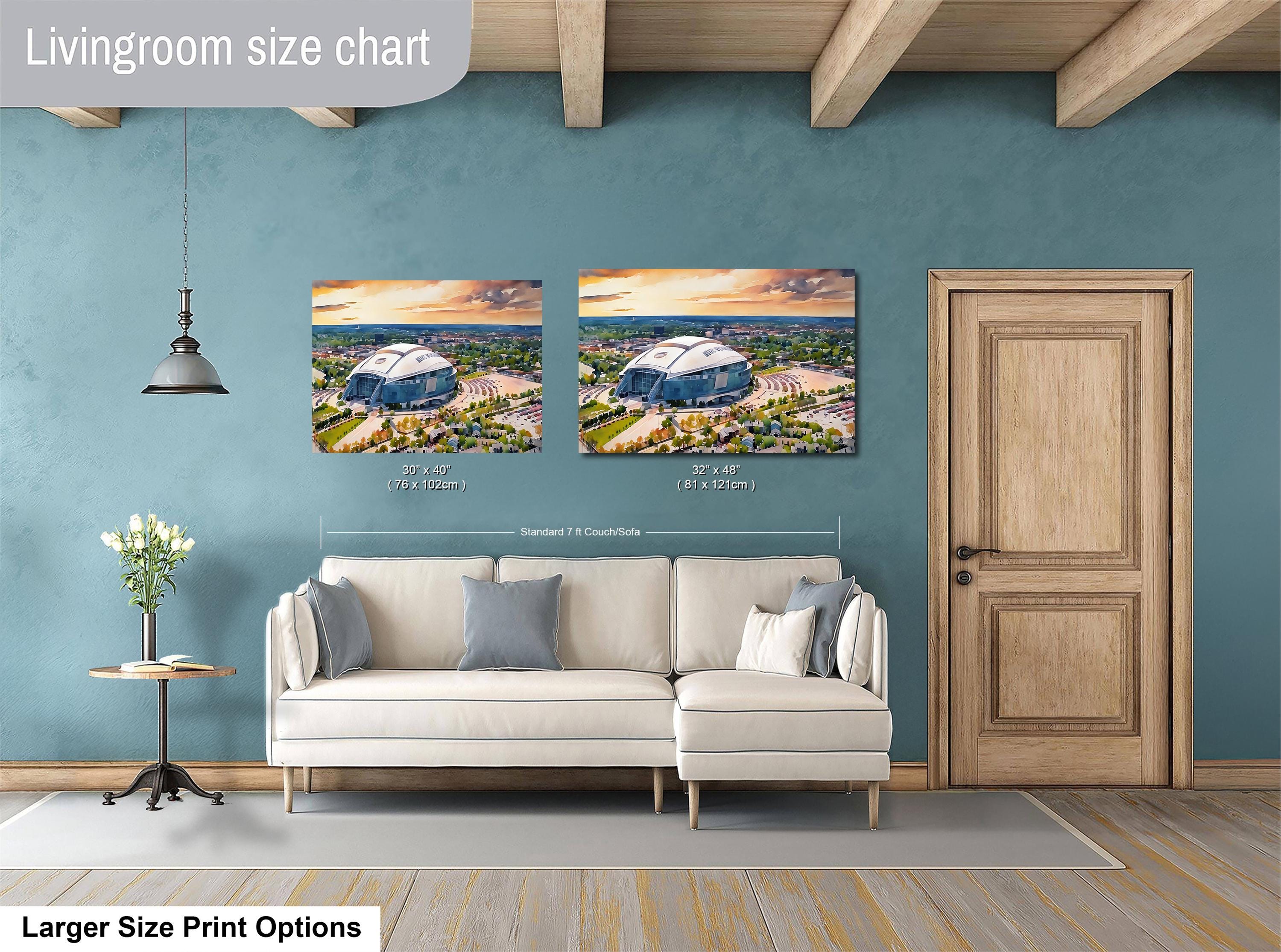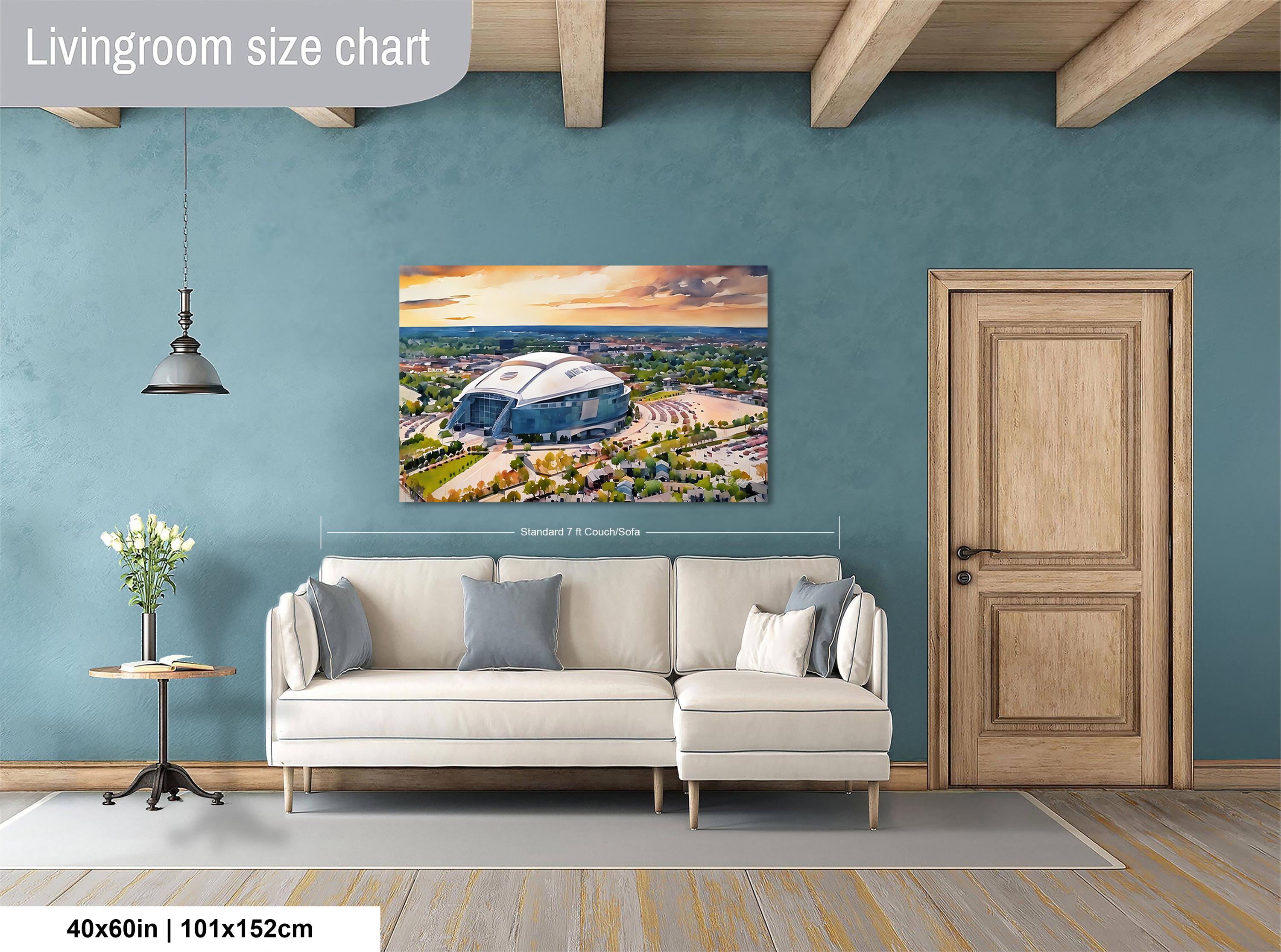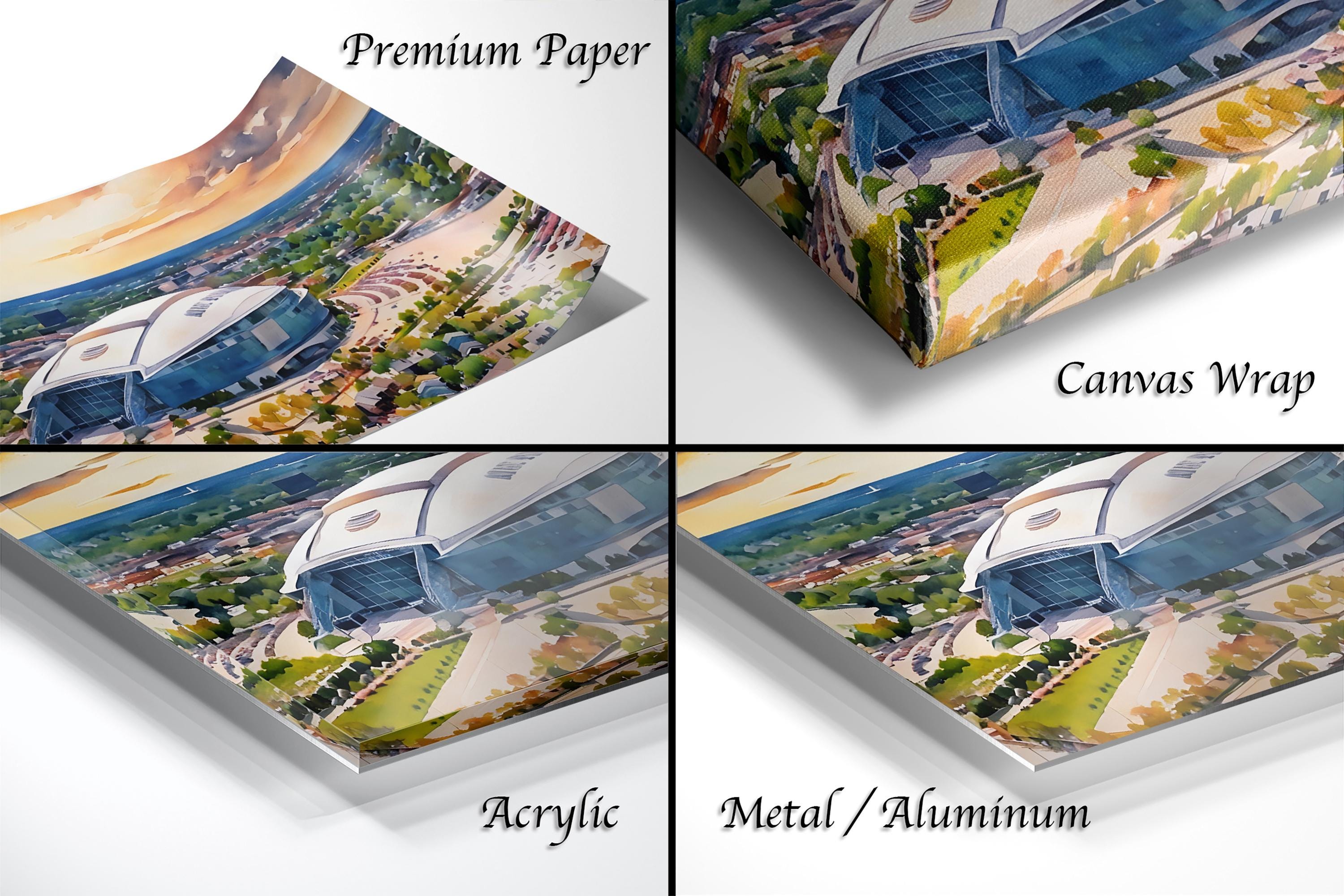 Experience the spirit of Dallas Cowboys Stadium artwork that captures the iconic AT&T Stadium in a stunning watercolor illustration. This NFL sports decor piece brings Texas pride and Cowboys Nation right into your home with a breathtaking sunset stadium print.
