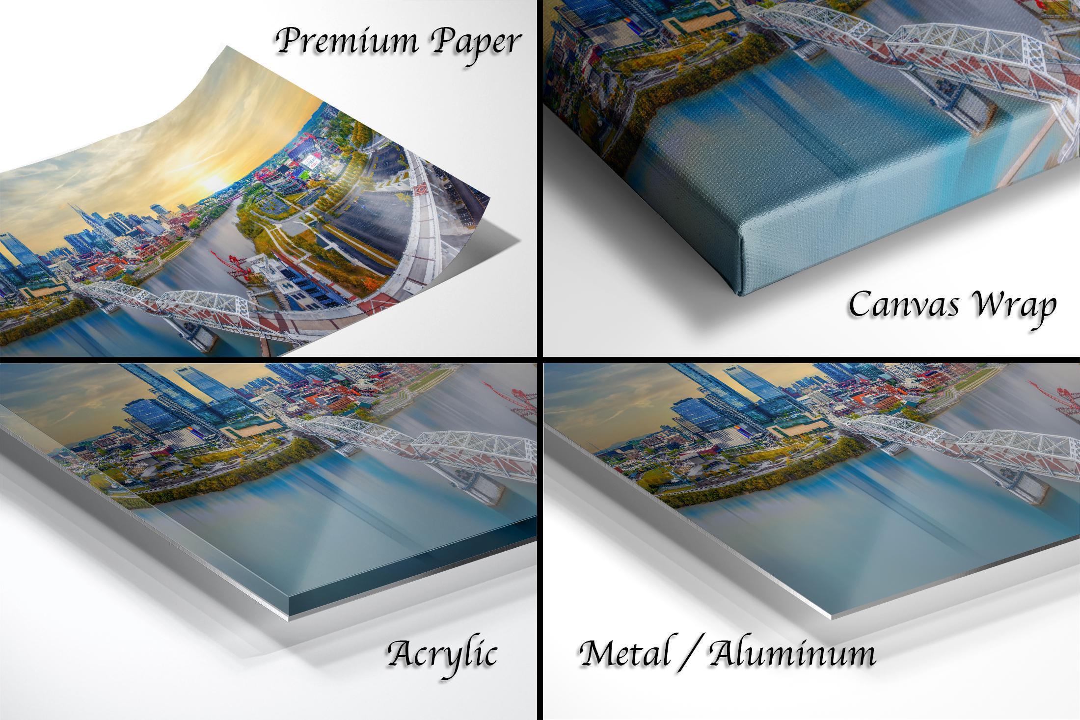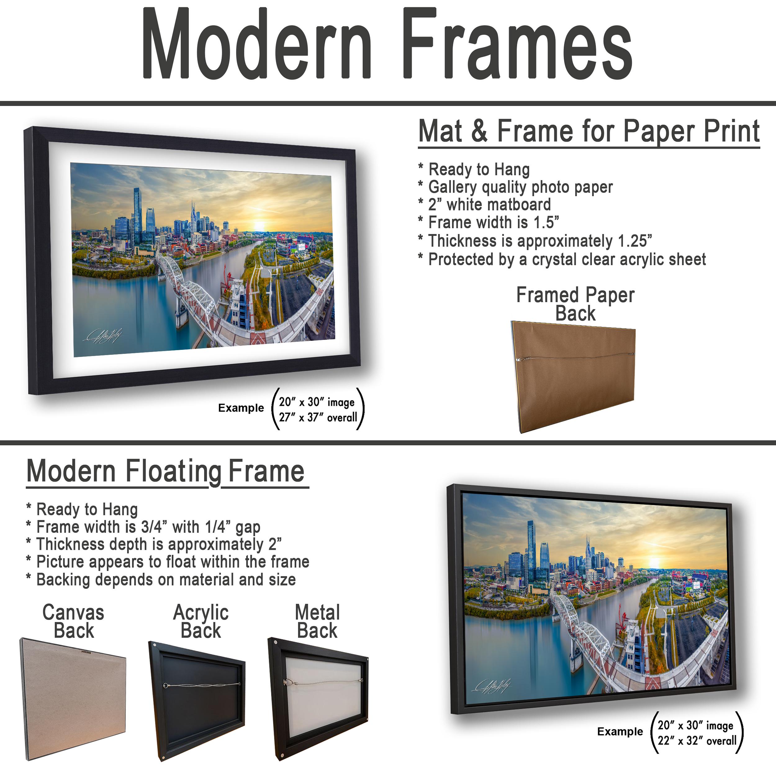 3.1) Only framed paper prints, acrylics and aluminum/metal prints will have a 2" white mat border. 3.2) Canvas prints will be a flush mounted (no mat border) to the frame.