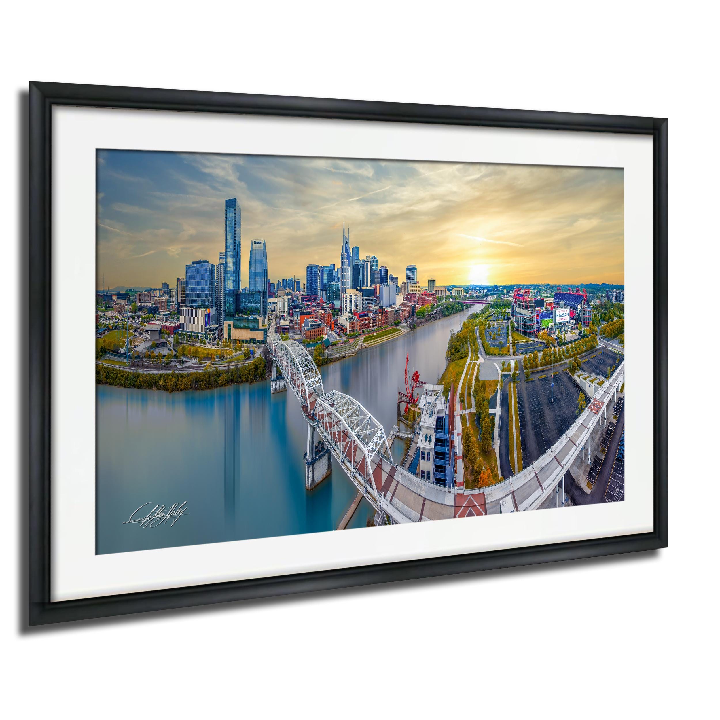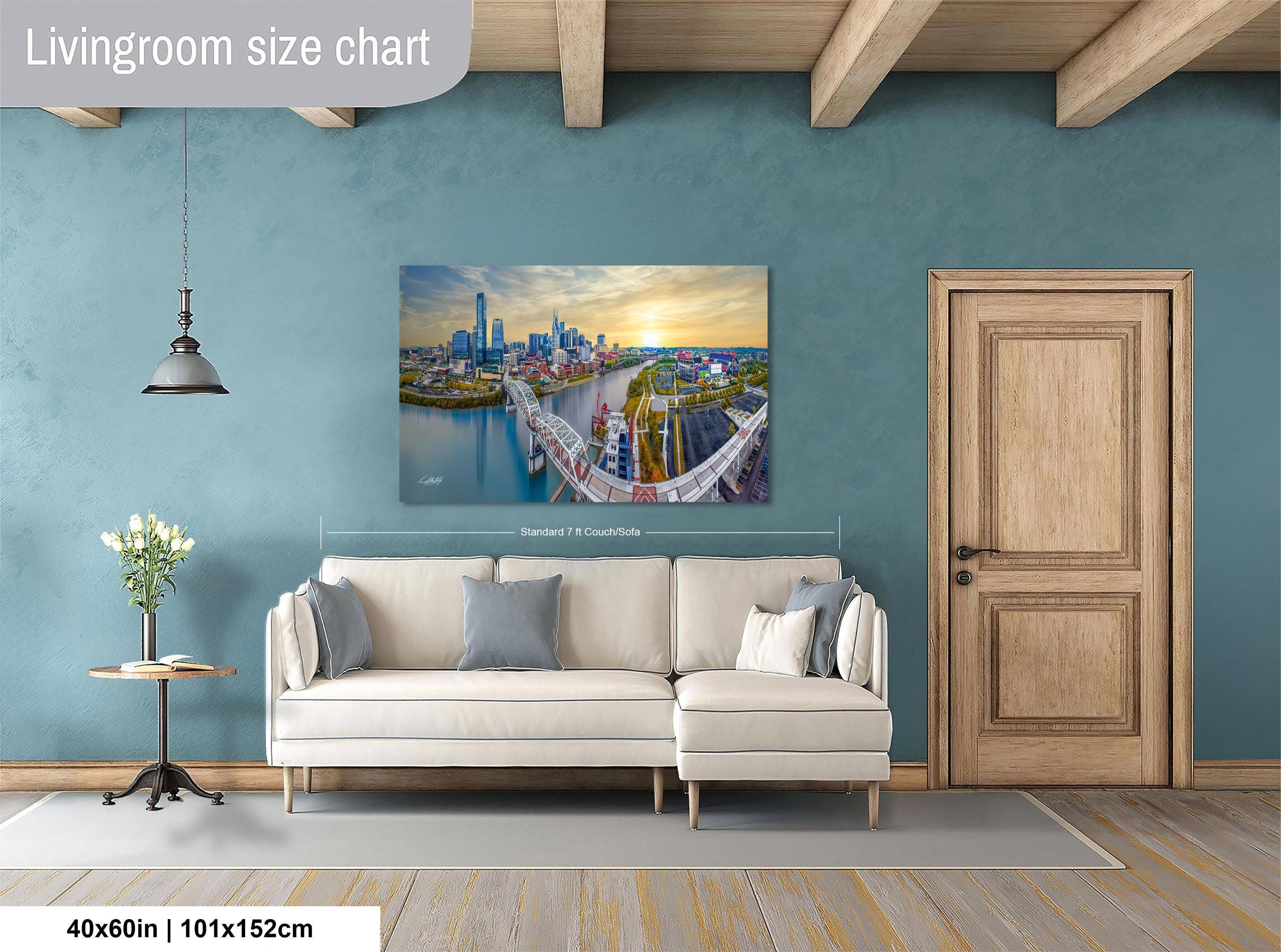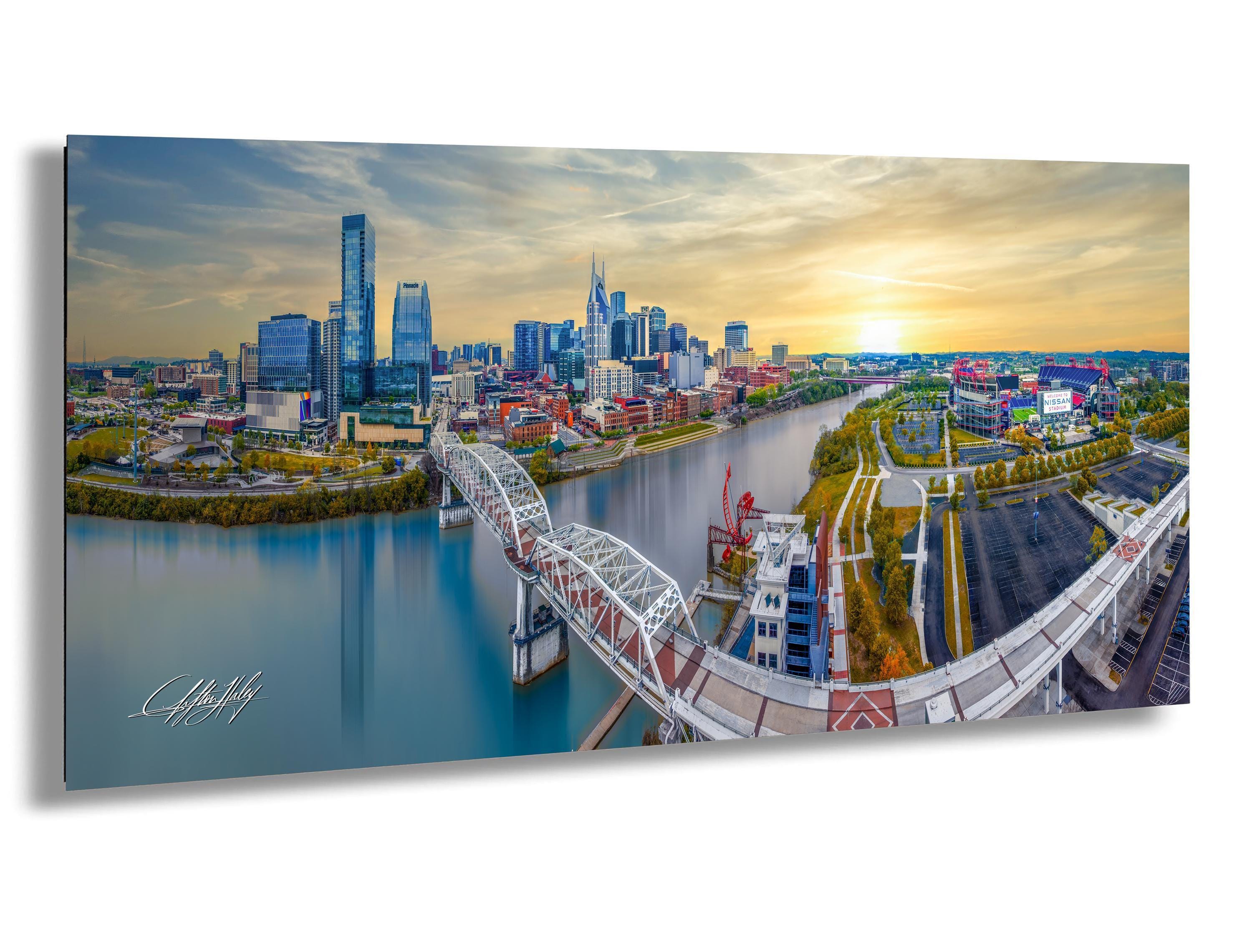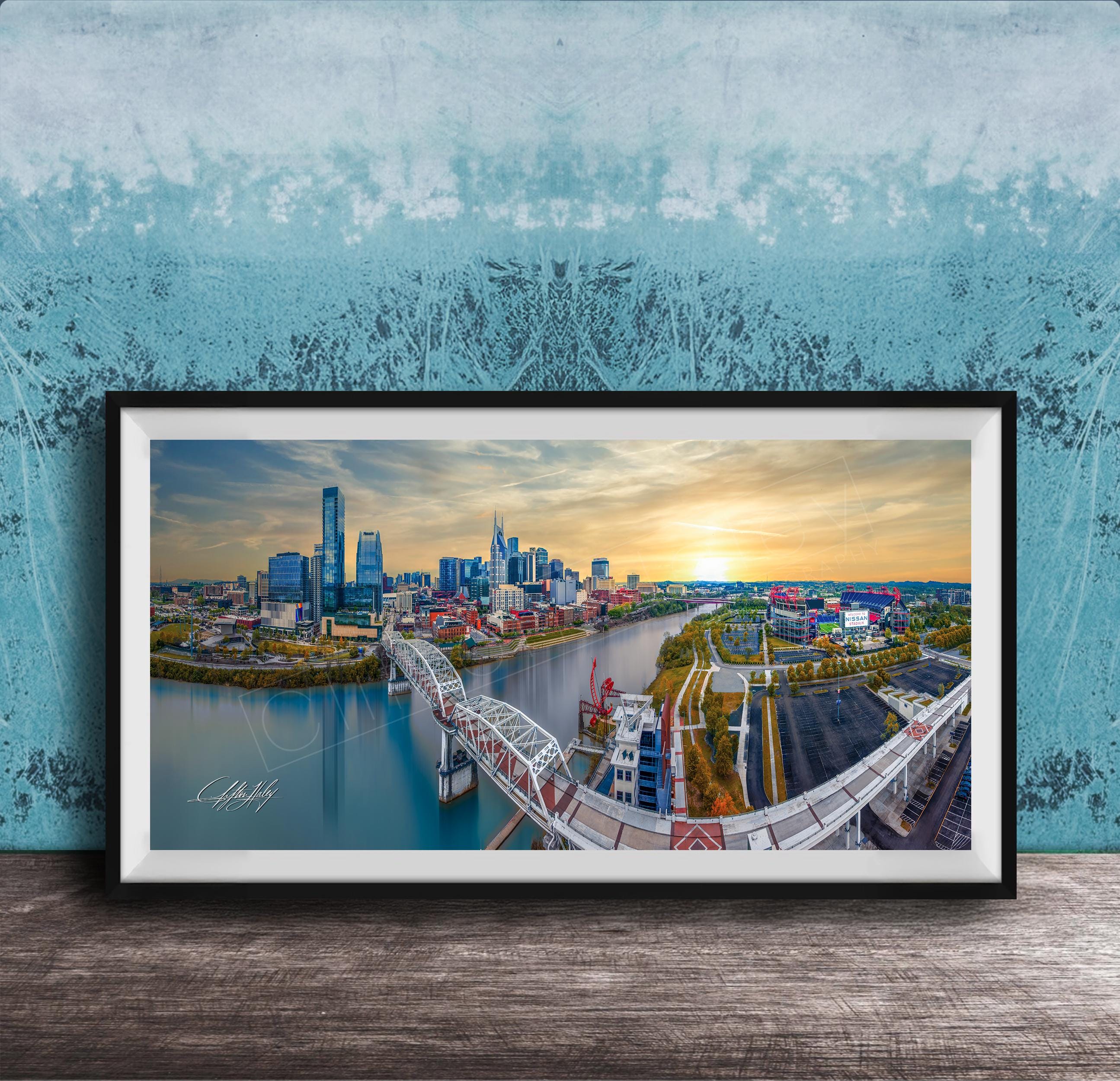 This Tennessee print and Nashville canvas captures the iconic John Seigenthaler pedestrian bridge and Cumberland River in a stunning city print poster. Experience the vibrant Nashville skyline and the proud Nissan Stadium, home of the Tennessee Titans, through this exquisite fine art wall hanging.