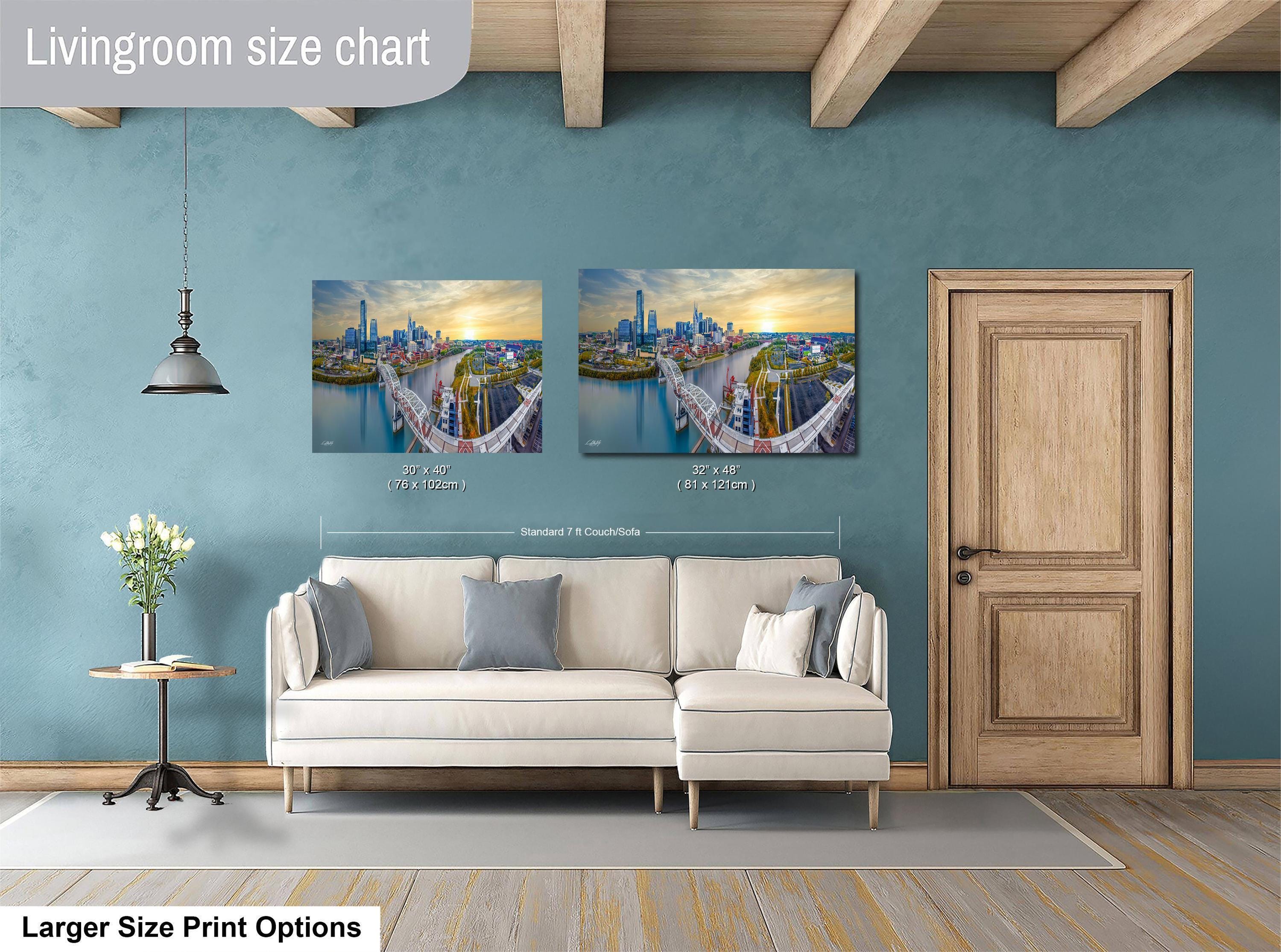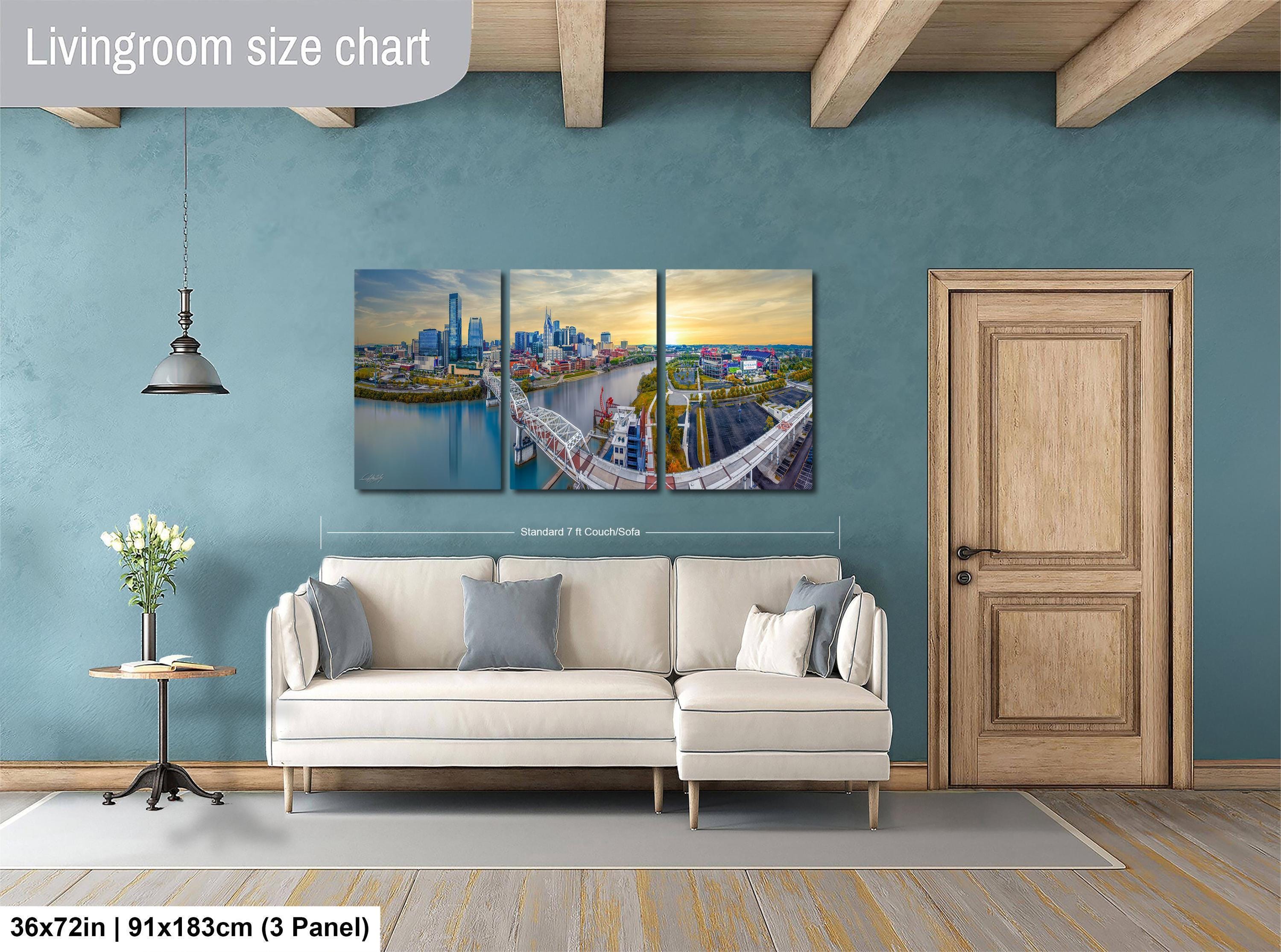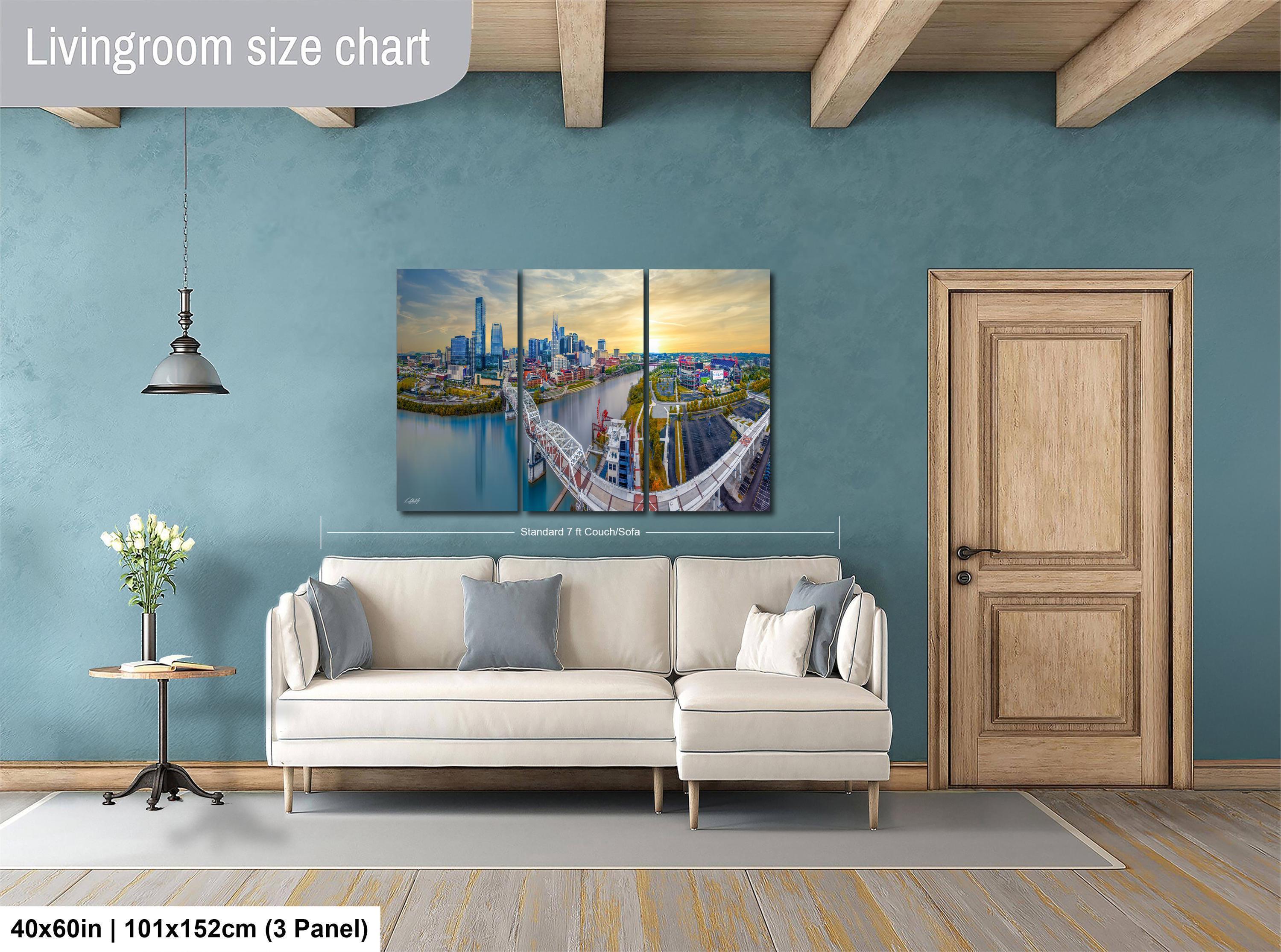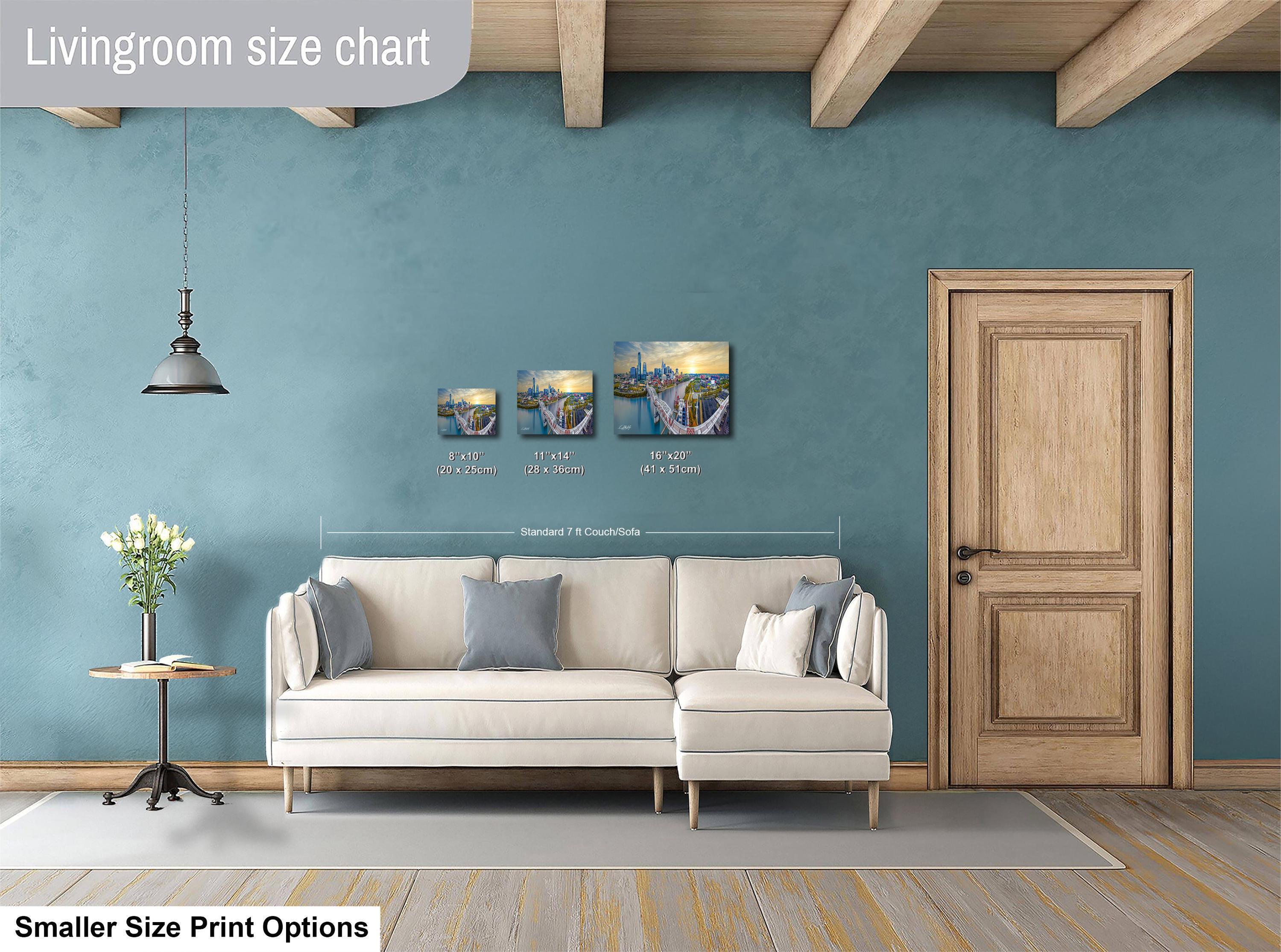 This Tennessee print and Nashville canvas captures the iconic John Seigenthaler pedestrian bridge and Cumberland River in a stunning city print poster. Experience the vibrant Nashville skyline and the proud Nissan Stadium, home of the Tennessee Titans, through this exquisite fine art wall hanging.