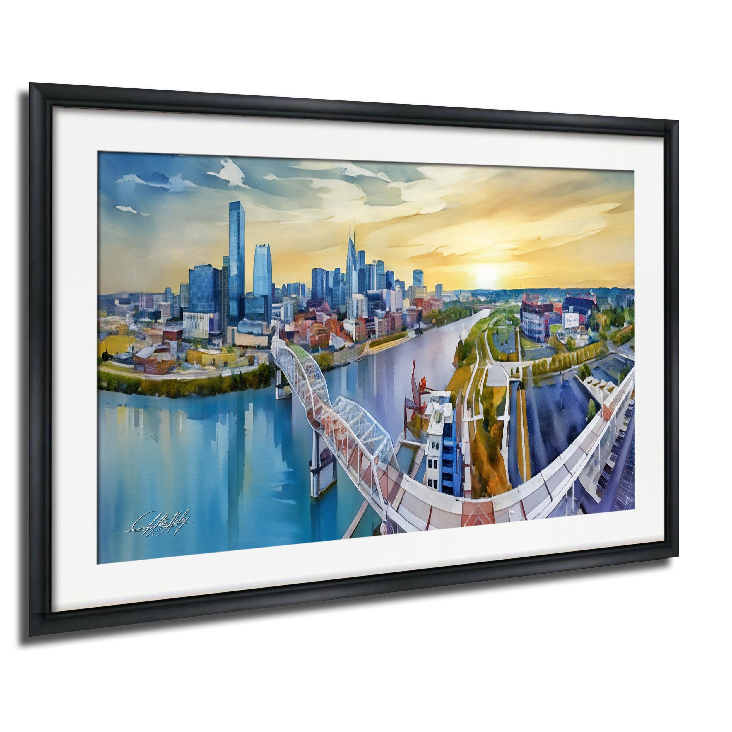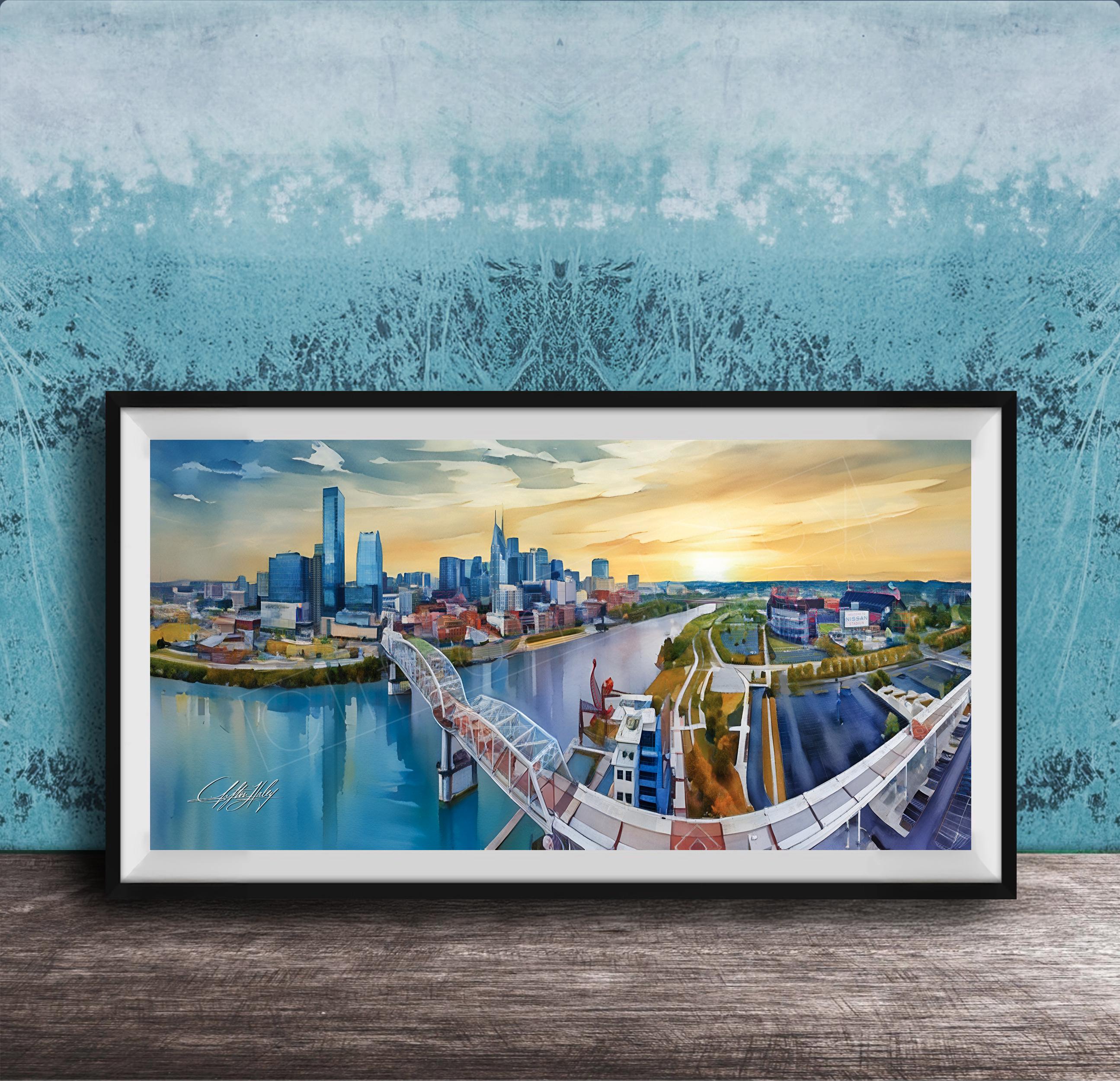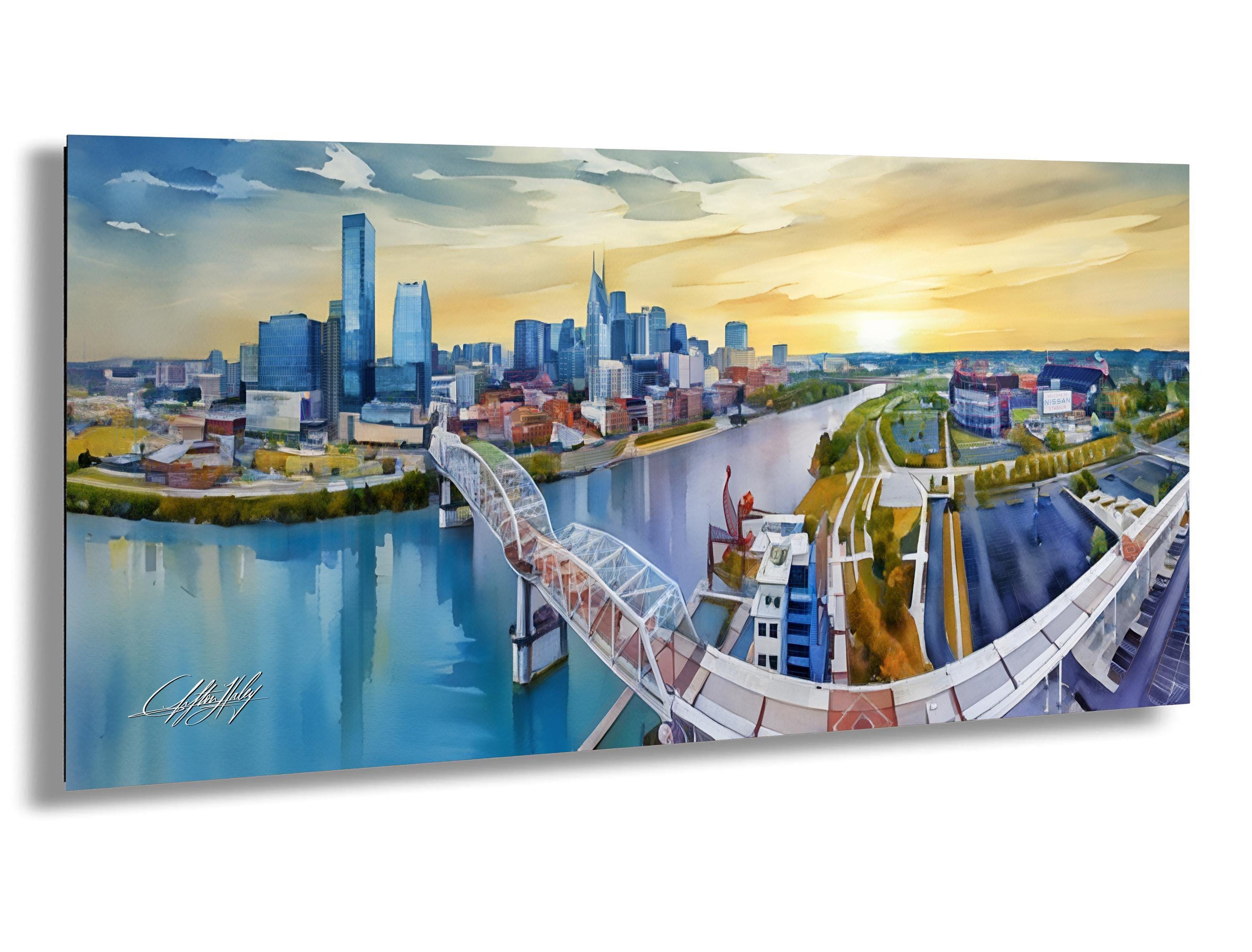 This Tennessee print and Nashville canvas beautifully captures the John Seigenthaler pedestrian bridge over the Cumberland River in stunning watercolor.
