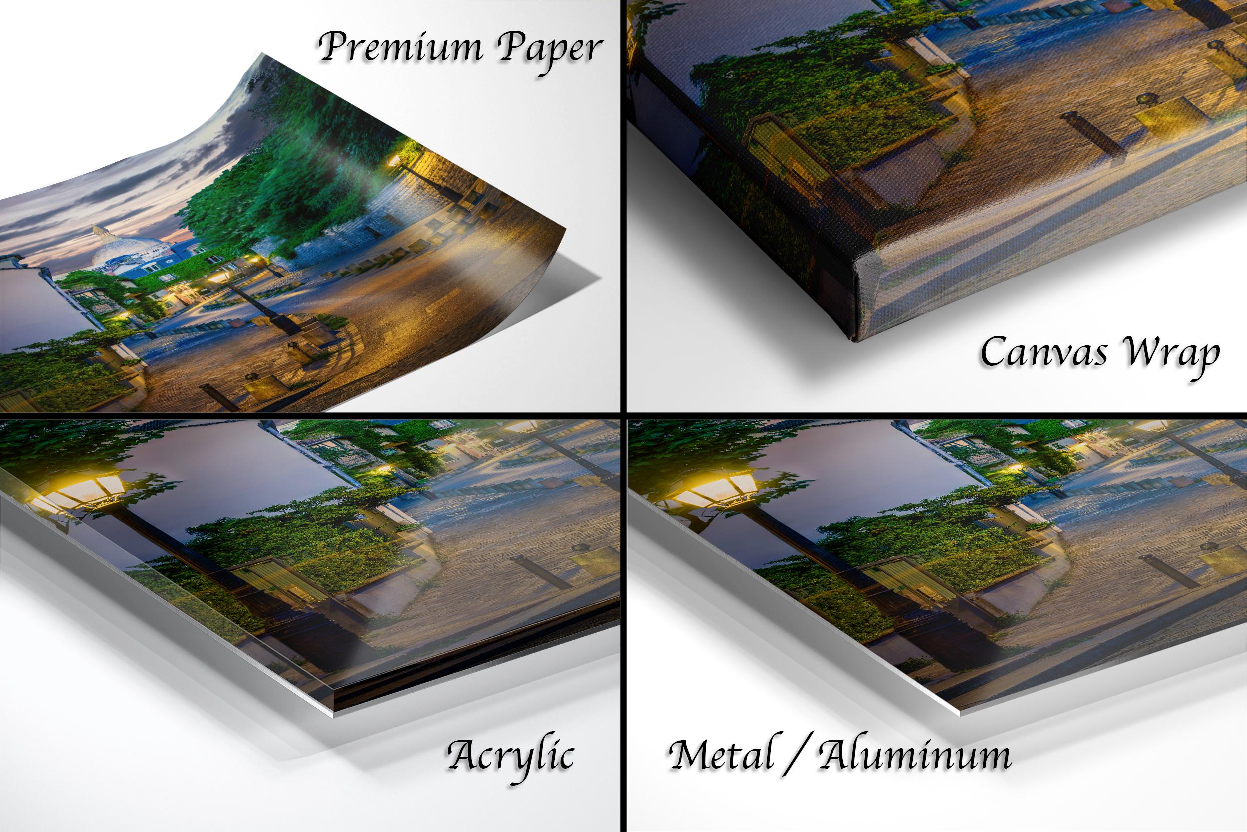 3.1) Only framed paper prints, acrylics and aluminum/metal prints will have a 2" white mat border. 3.2) Canvas prints will be a flush mounted (no mat border) to the frame.