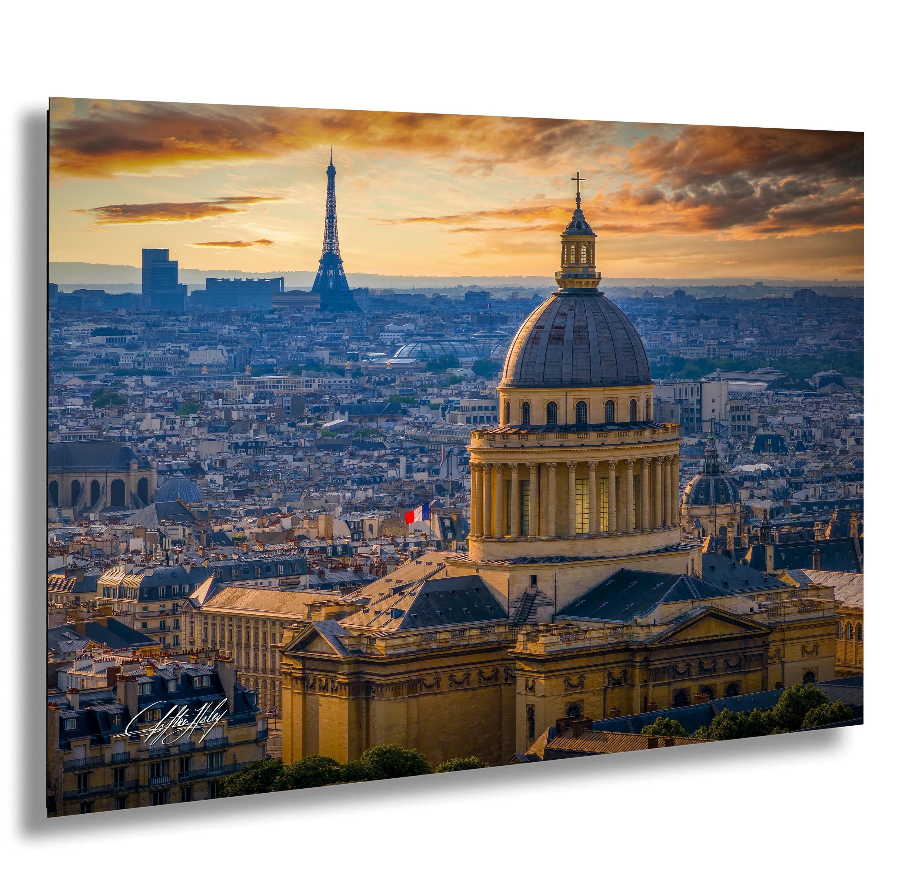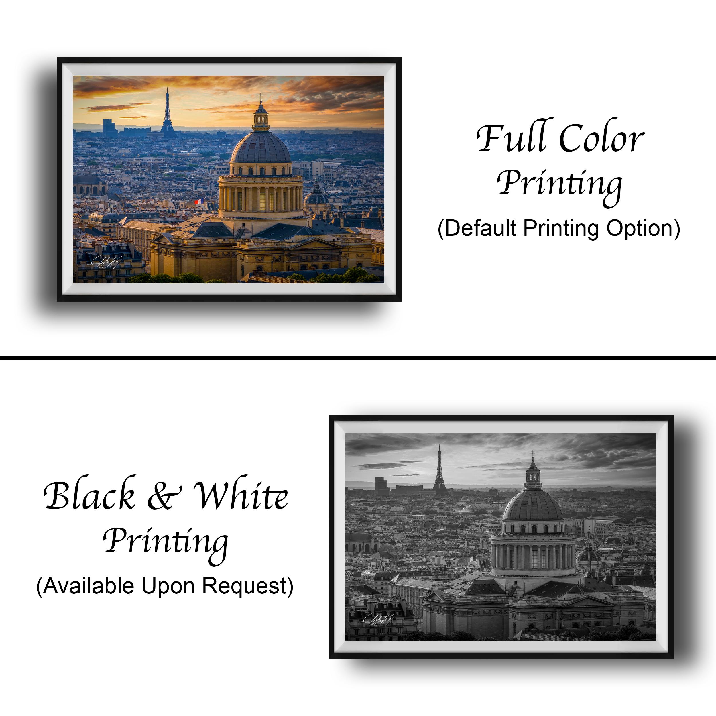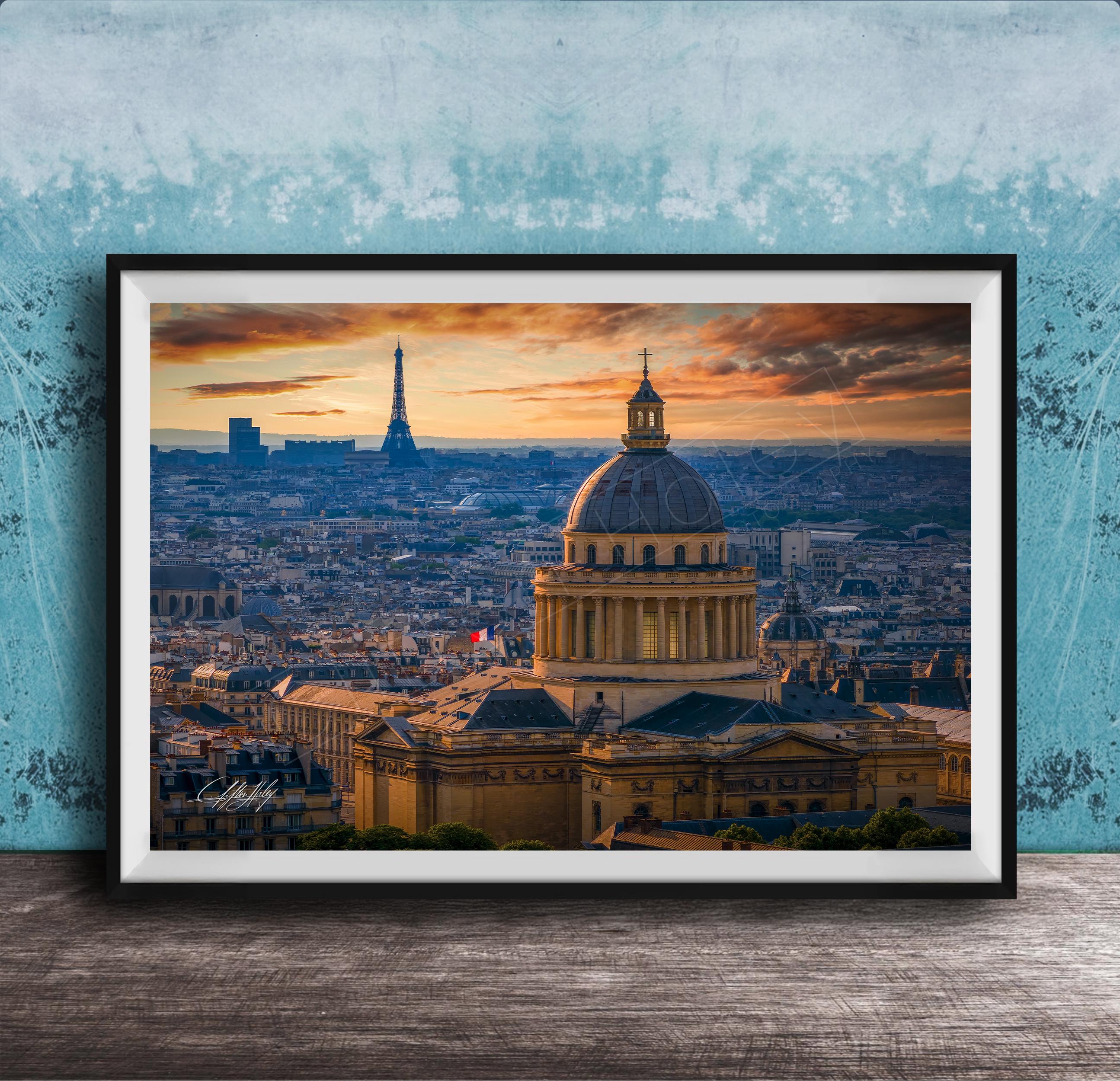 Experience the timeless charm of the Paris Pantheon skyline captured at golden hour, where history and beauty merge in a stunning cityscape watercolor. This Parisian cafe decor print brings the iconic Eiffel Tower and historic Pantheon into your space, perfect as a travel wall poster or fine art gift.