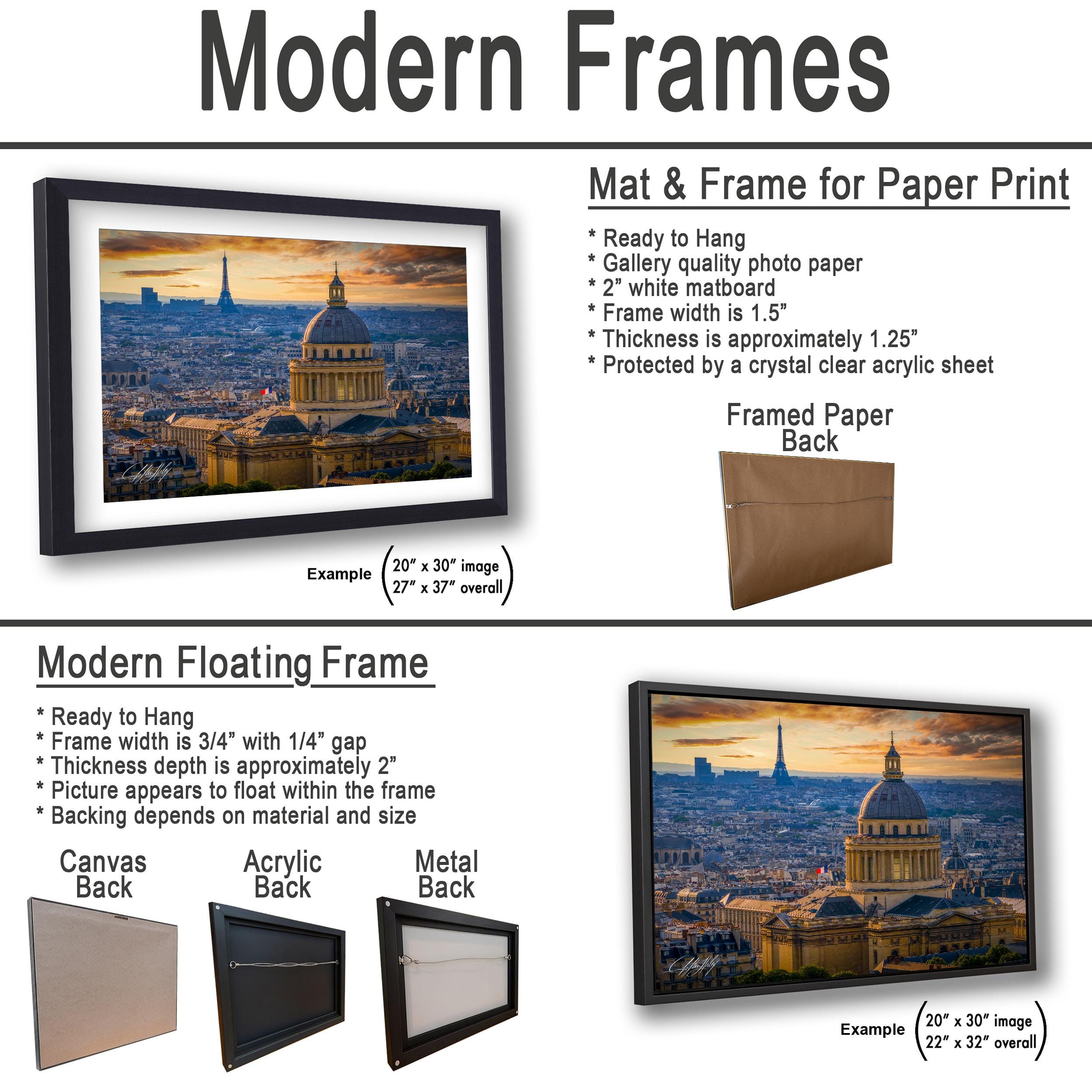 - Each print is made-to-order, ensuring your travel wall poster is unique and personal. Because of this custom process, returns are not offered, but we gladly provide exchanges or replacements if your artwork arrives damaged or with any issues. - The artist's signature authenticates each fine art gift, adding a personal touch in the bottom corner. - Framed paper prints, acrylics, and aluminum/metal prints feature a 2" white mat border for refined presentation. - Canvas prints are flush mounted with no mat border for a sleek look.