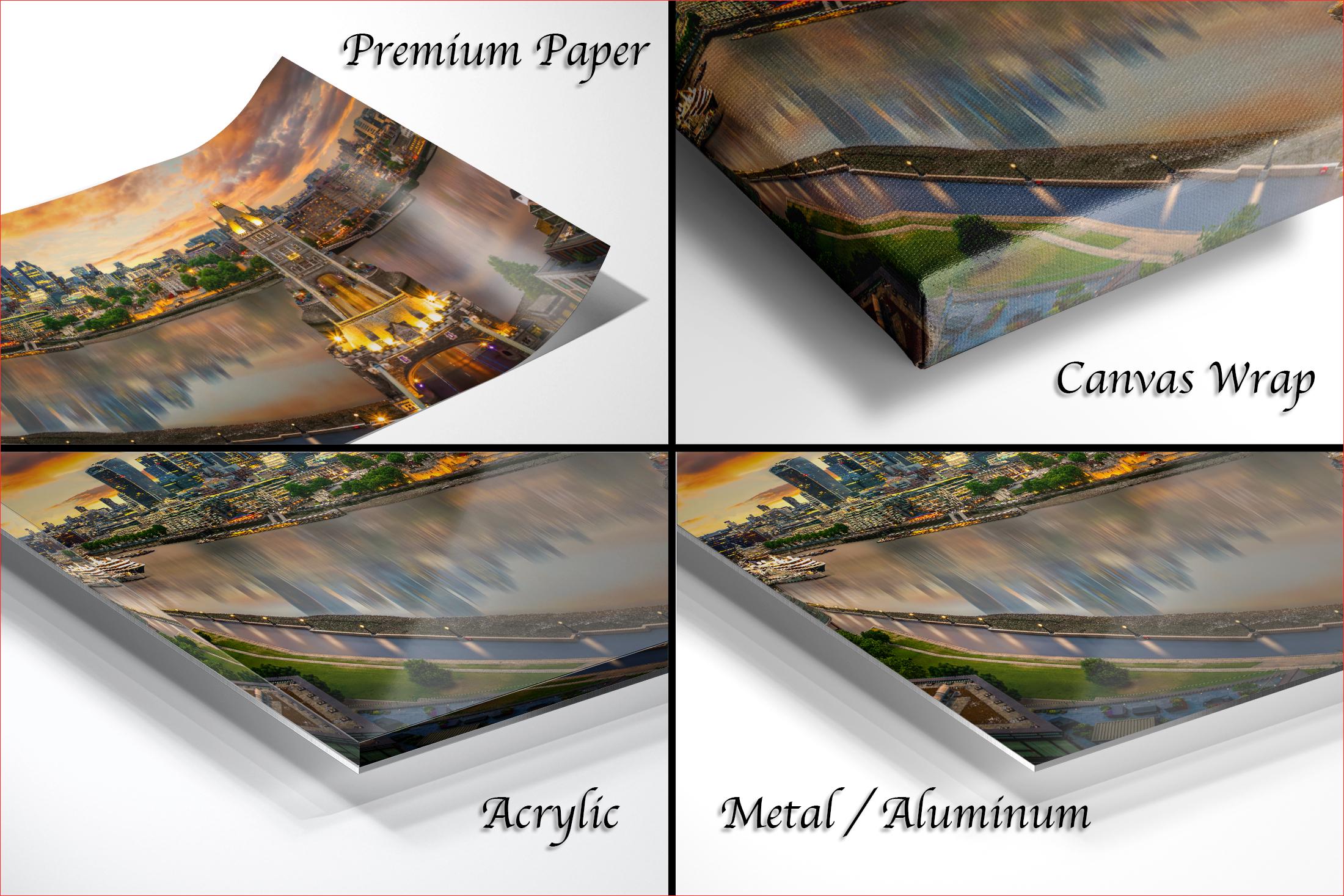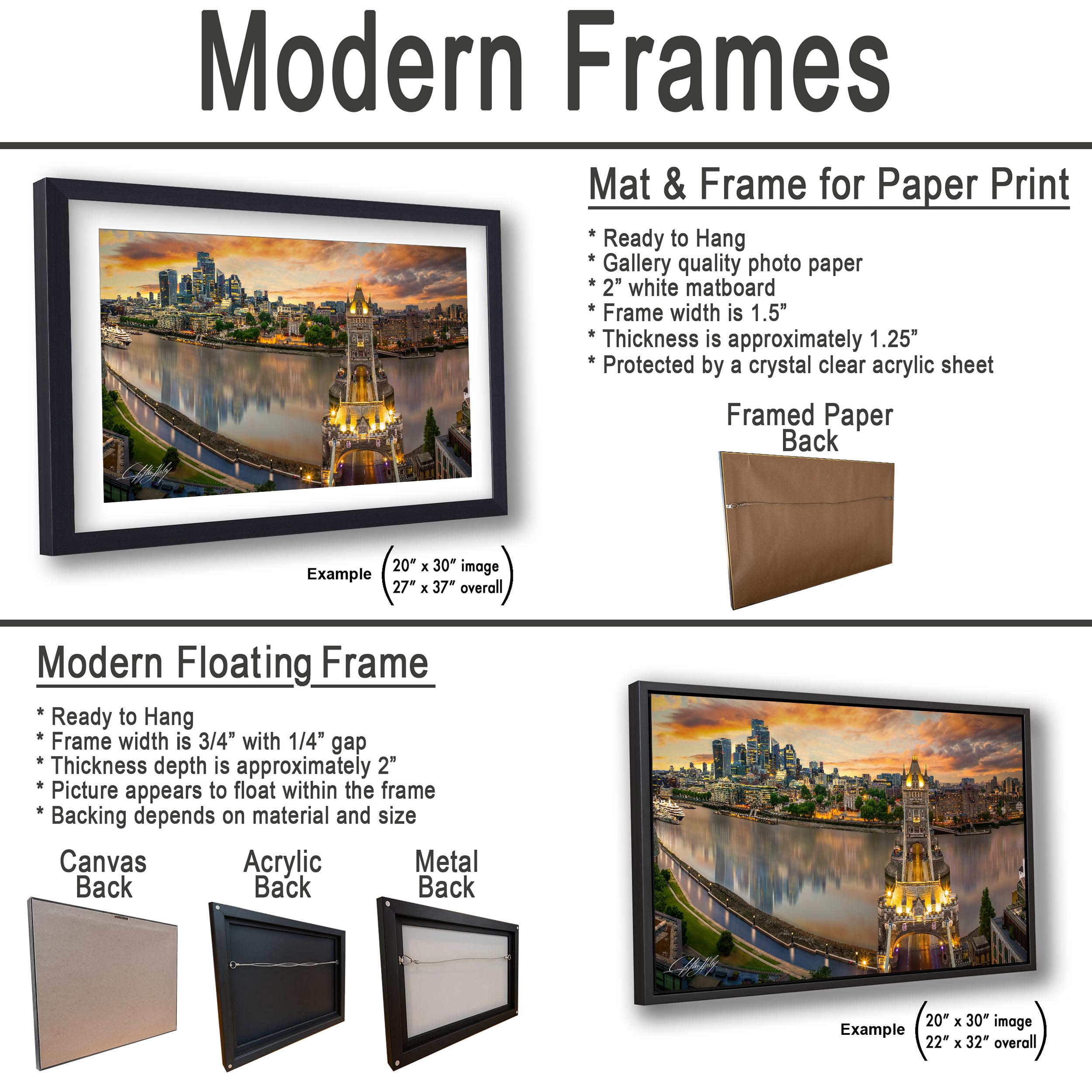 3.1) Only framed paper prints, acrylics and aluminum/metal prints will have a 2" white mat border. 3.2) Canvas prints will be a flush mounted (no mat border) to the frame.