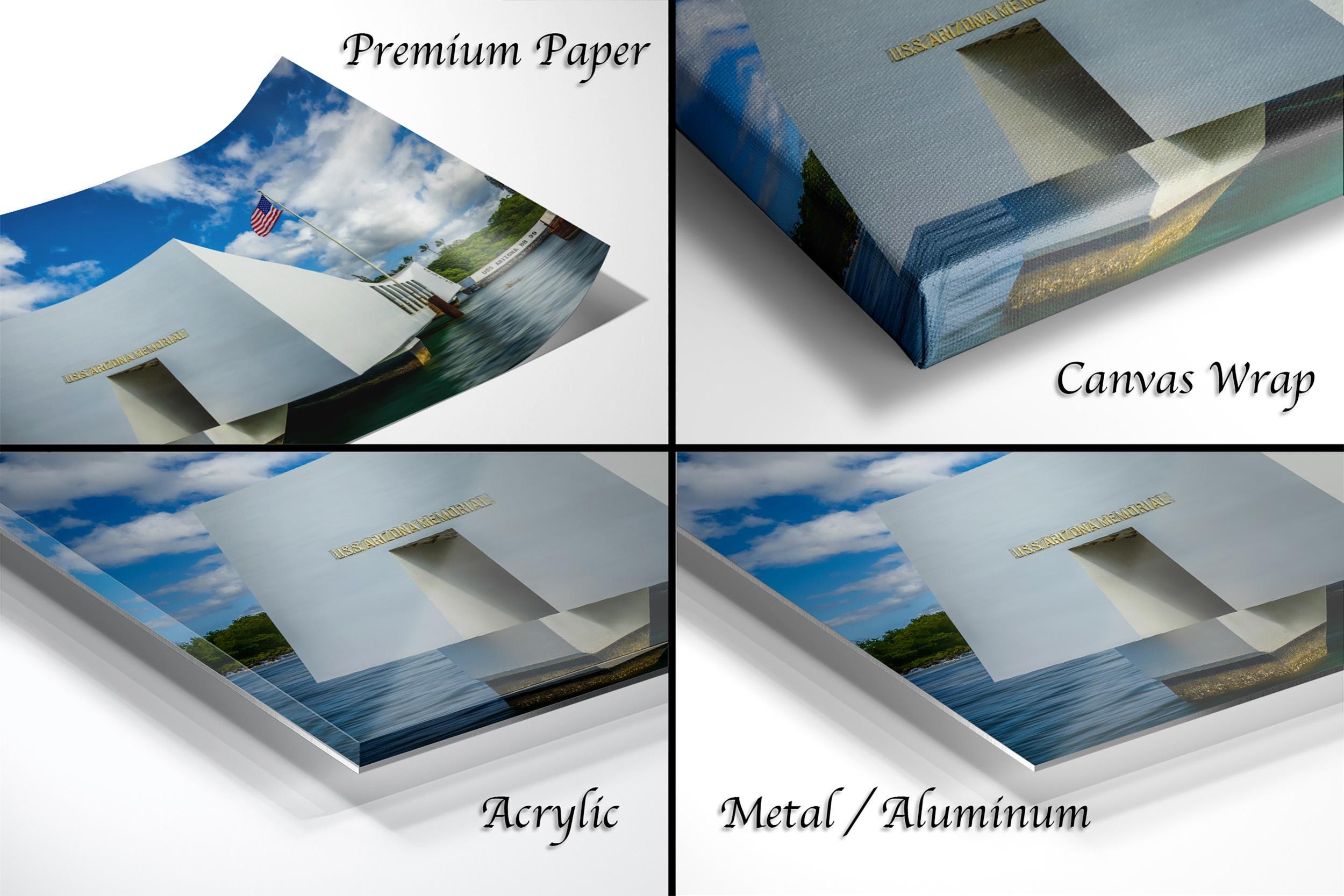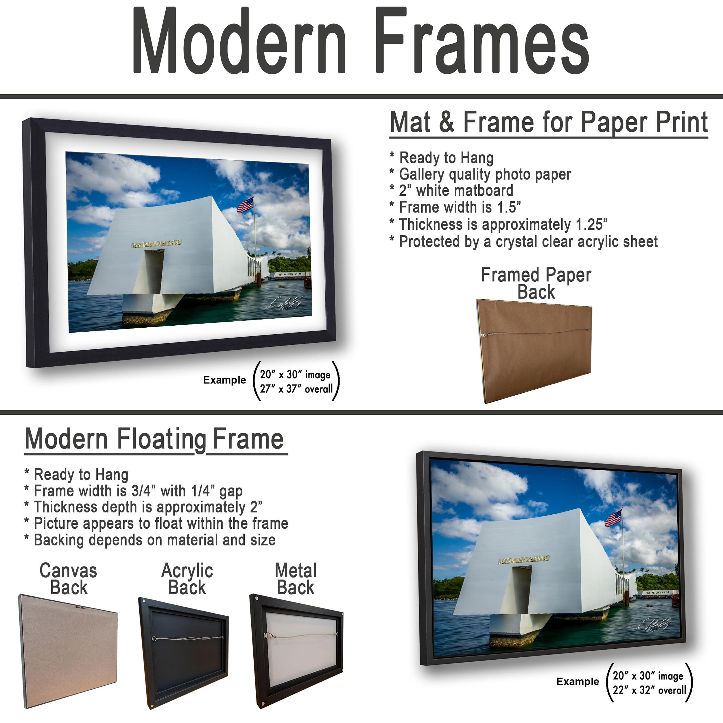 3.1) Only framed paper prints, acrylics and aluminum/metal prints will have a 2" white mat border. 3.2) Canvas prints will be a flush mounted (no mat border) to the frame.