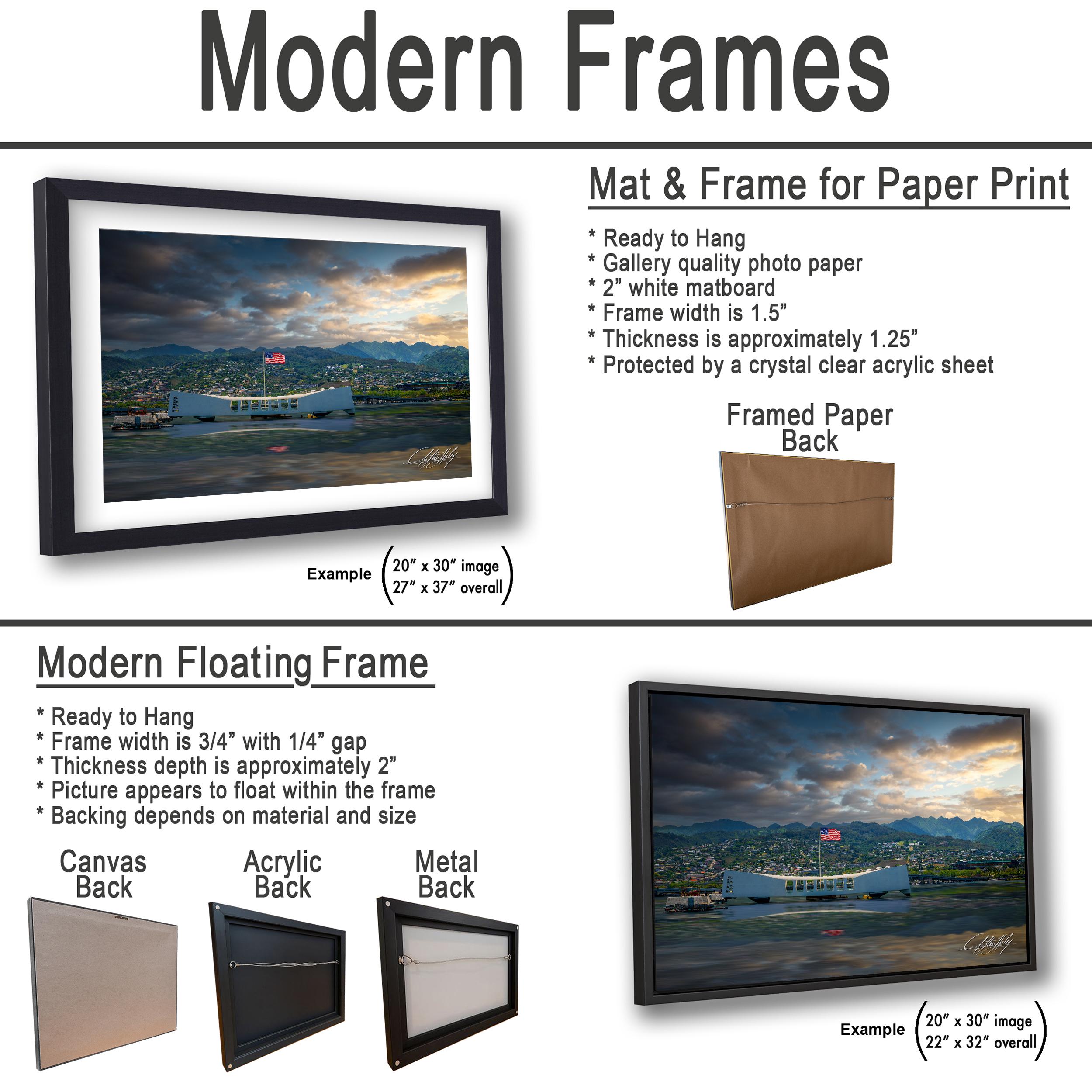 3.1) Only framed paper prints, acrylics and aluminum/metal prints will have a 2" white mat border. 3.2) Canvas prints will be a flush mounted (no mat border) to the frame.