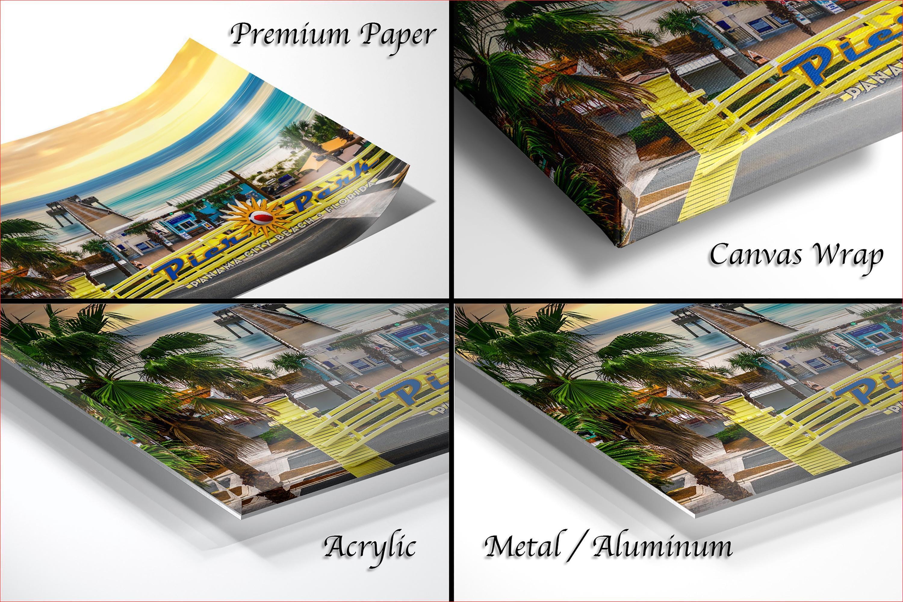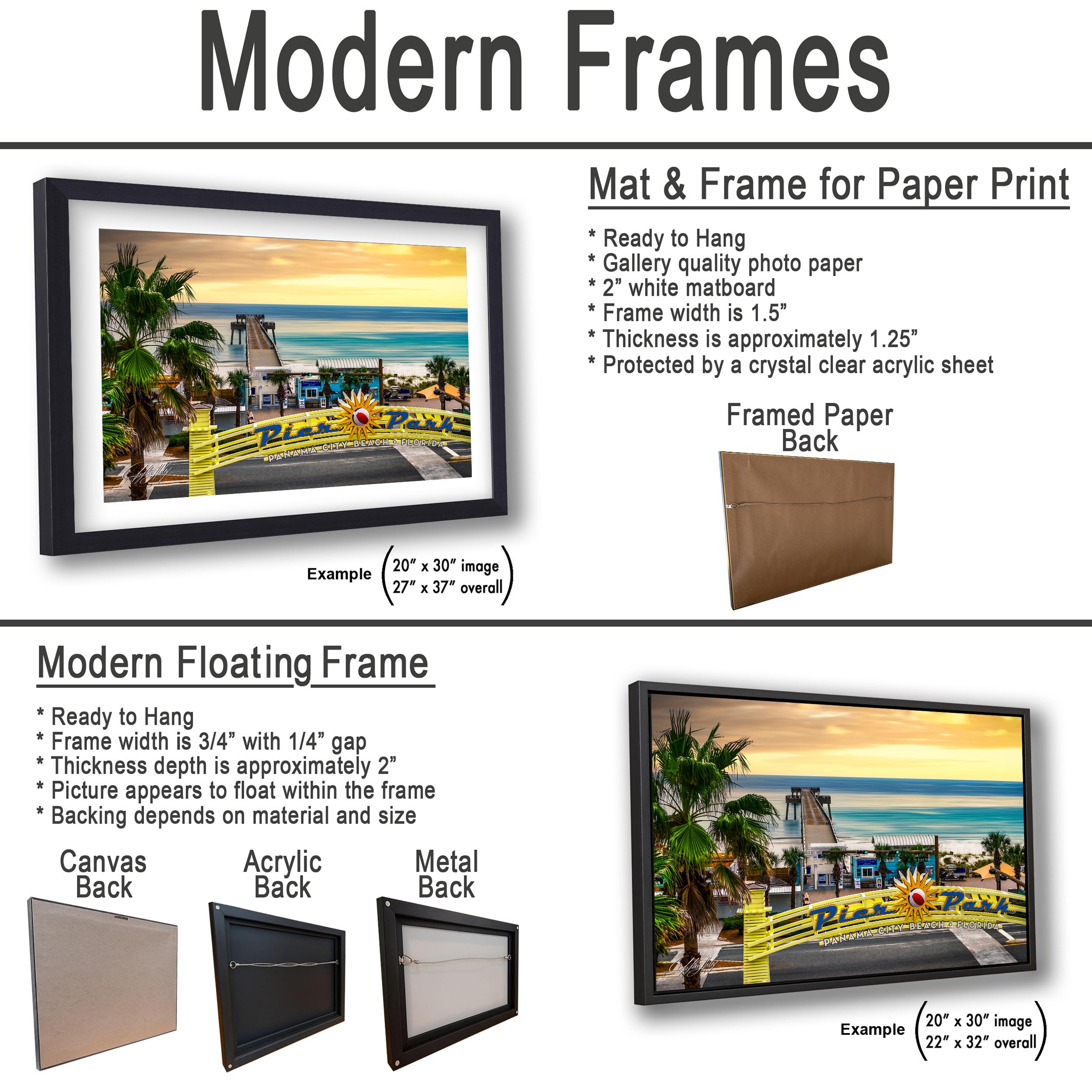3.1) Only framed paper prints, acrylics and aluminum/metal prints will have a 2" white mat border. 3.2) Canvas prints will be a flush mounted (no mat border) to the frame.