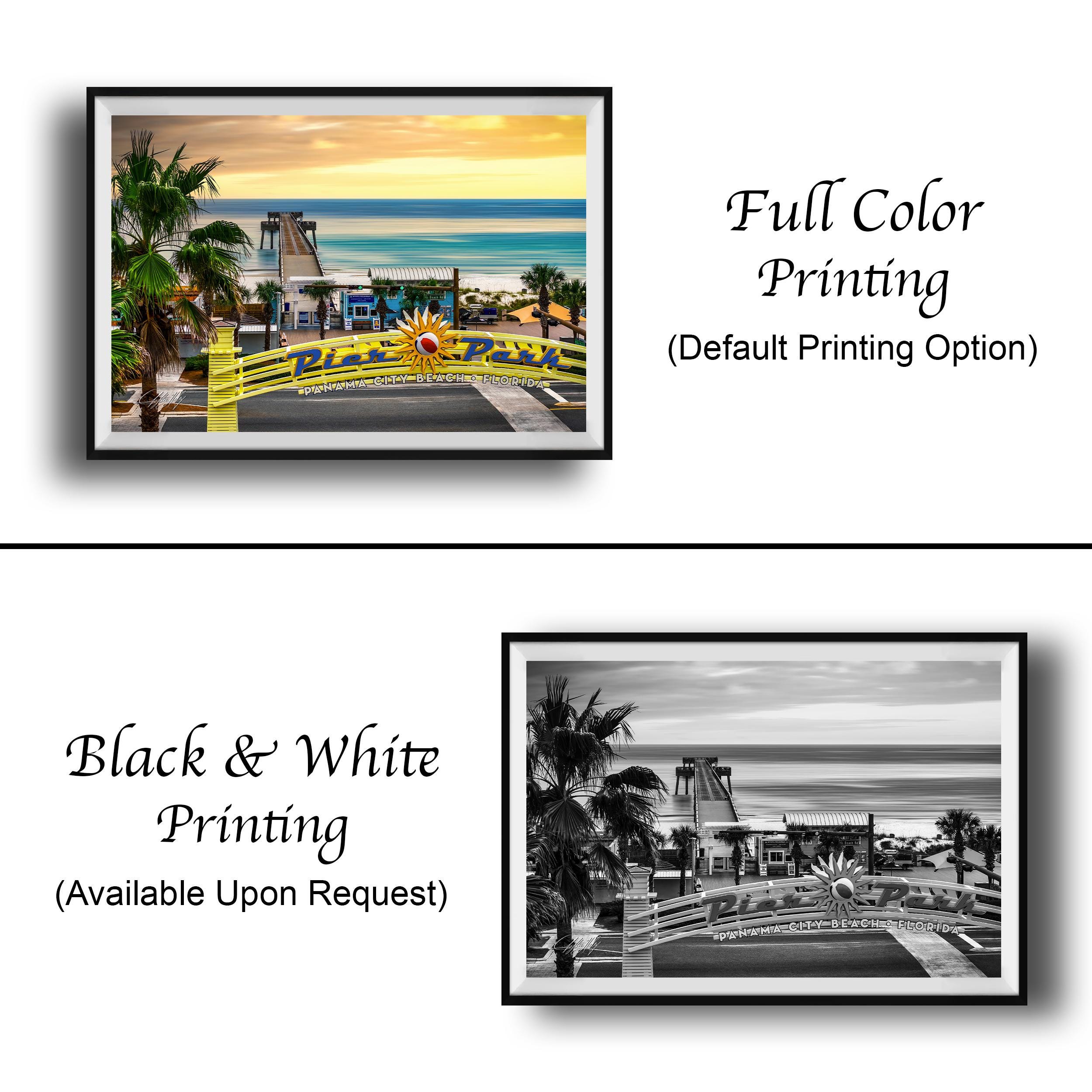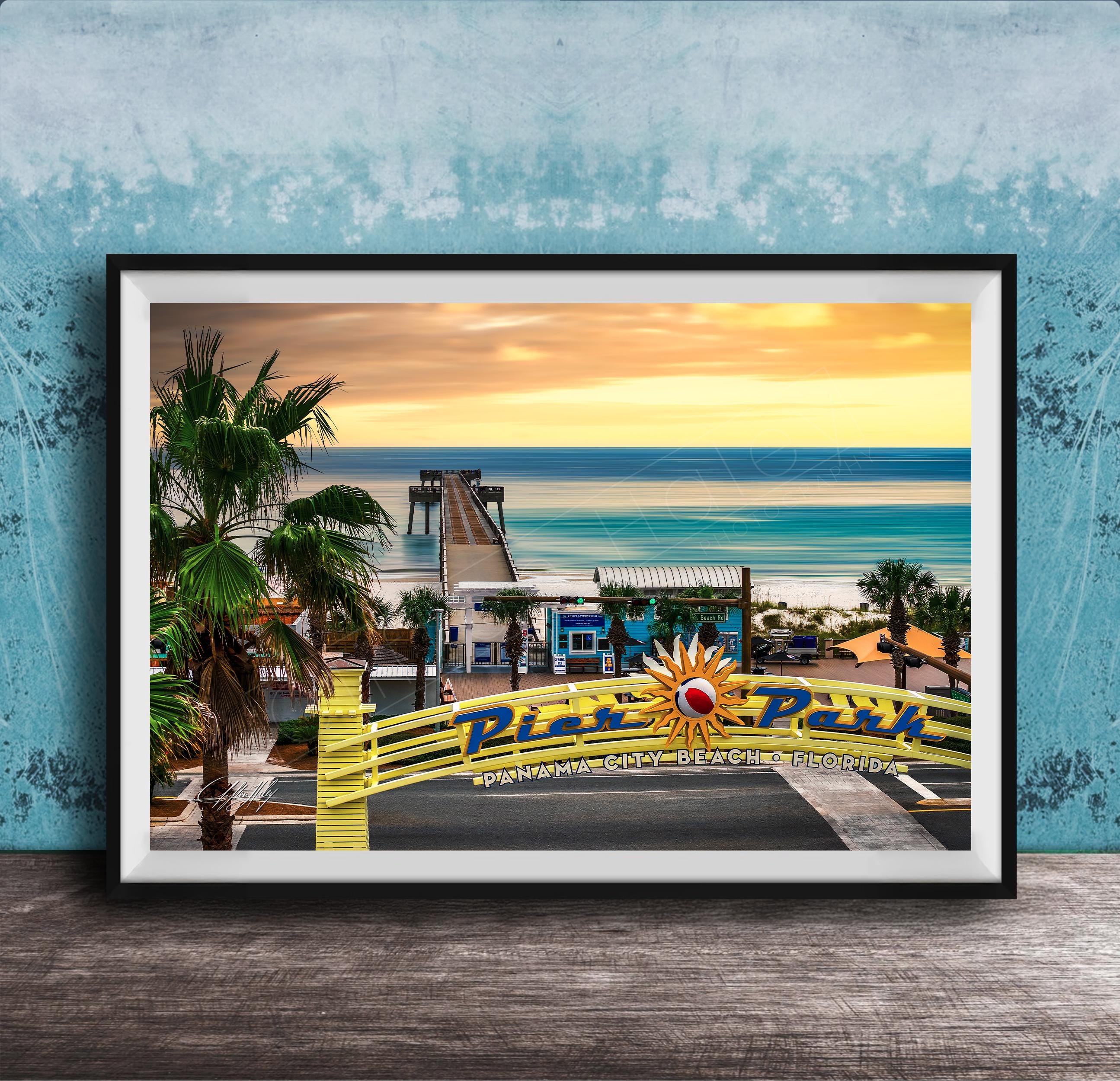 Panama City Pier landscape captures the serene beauty of the Gulf Coast in a breathtaking ocean view. This beach travel art invites you to experience the calm and charm of Florida's coastal landmark through a unique drone aerial shot.