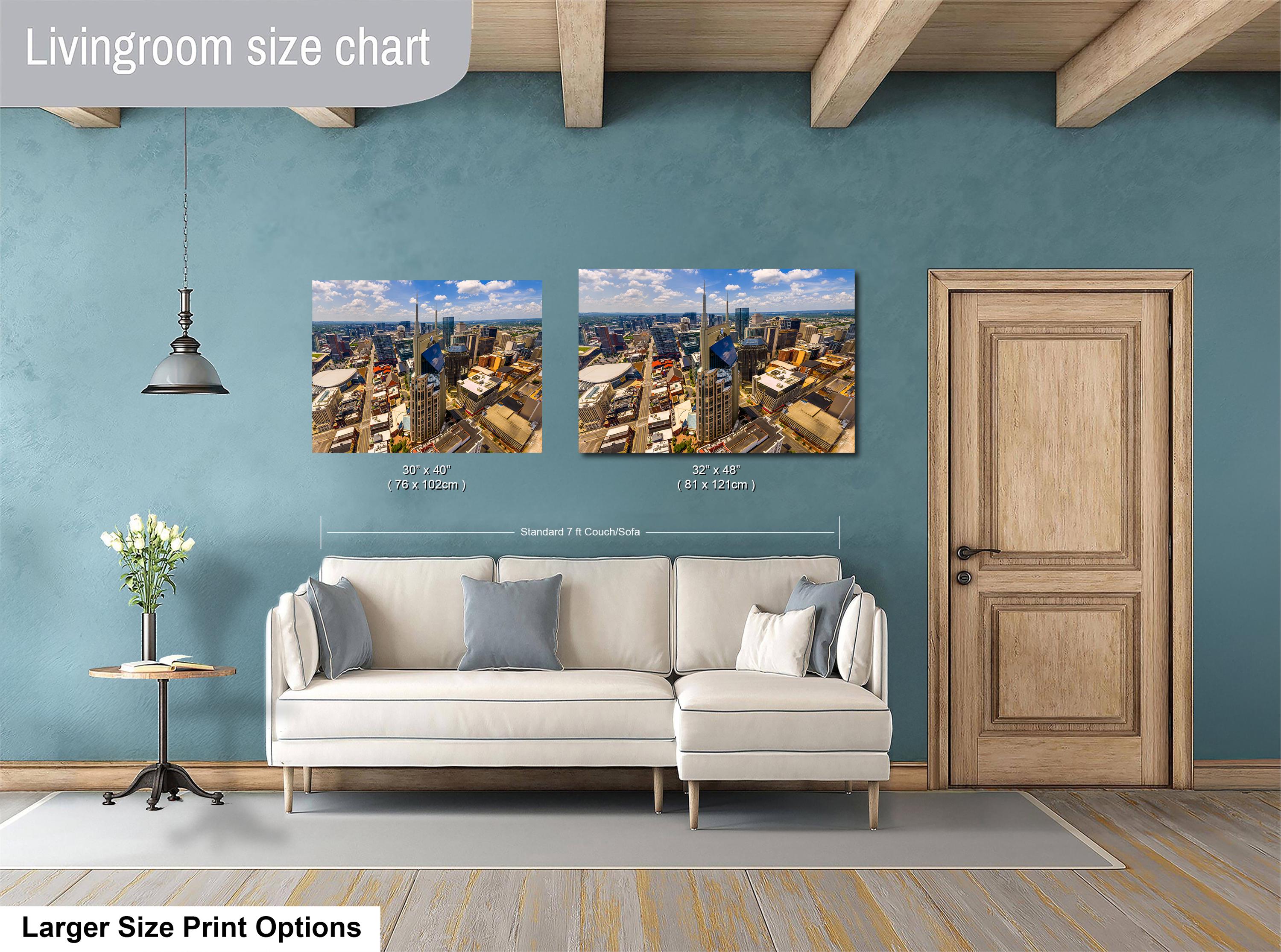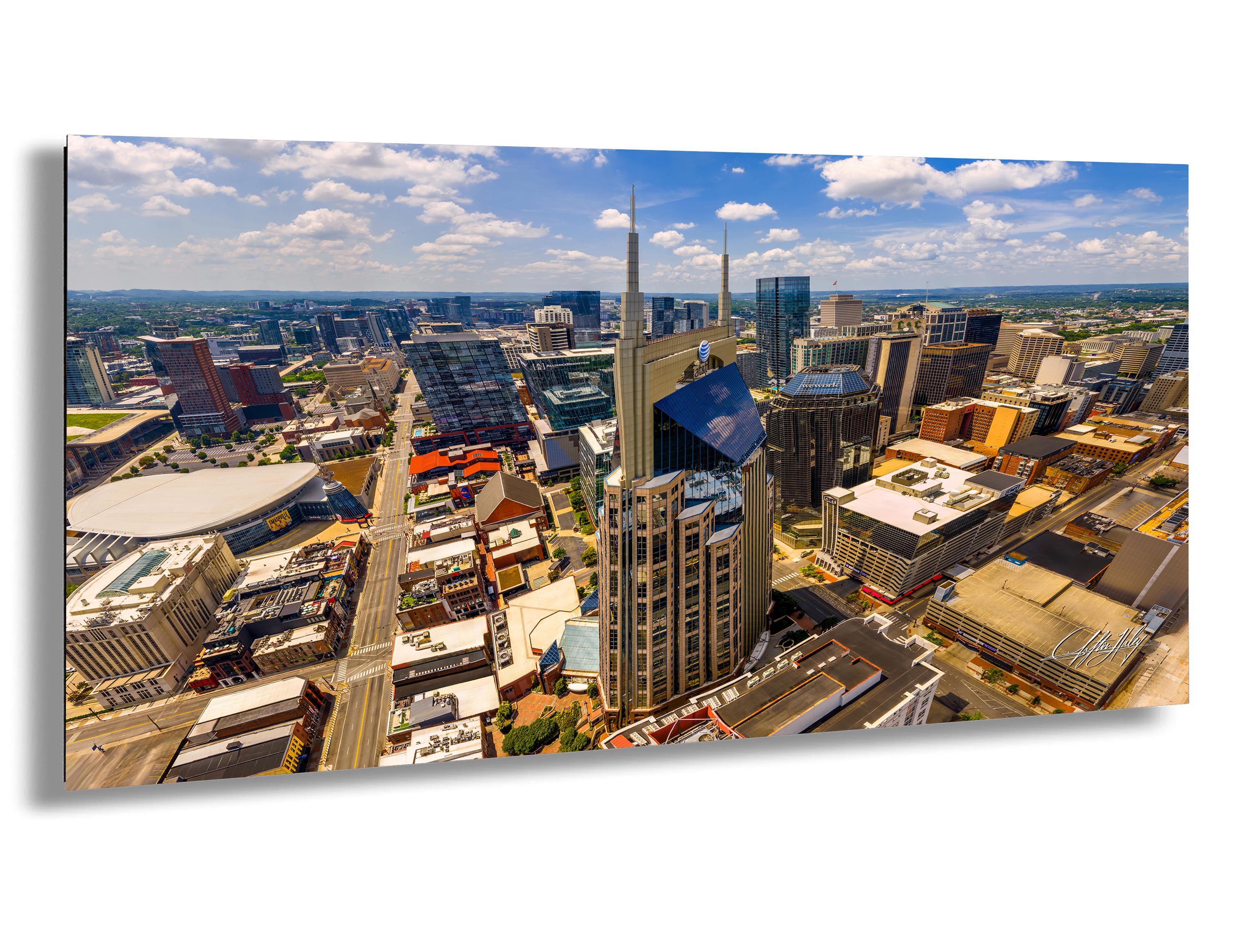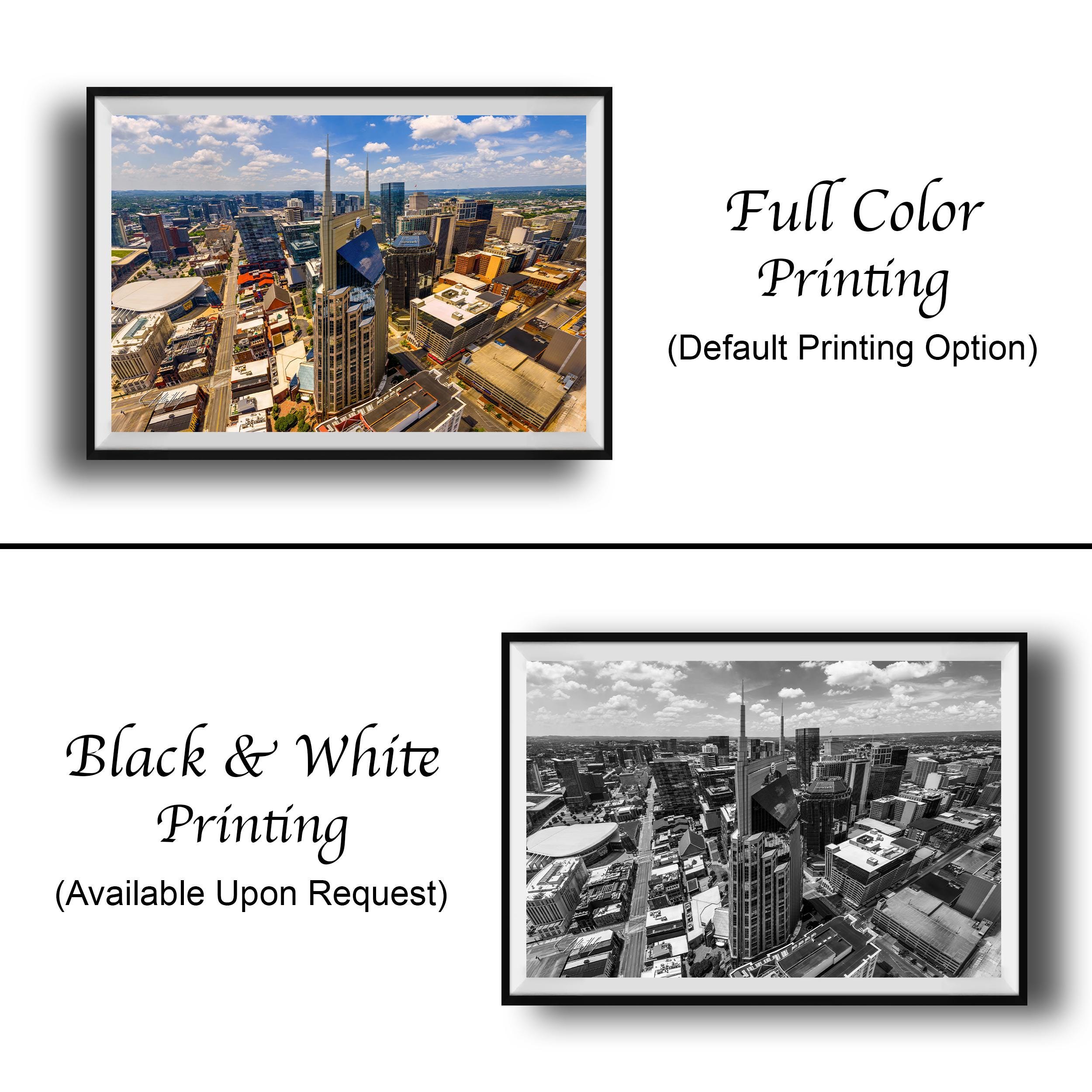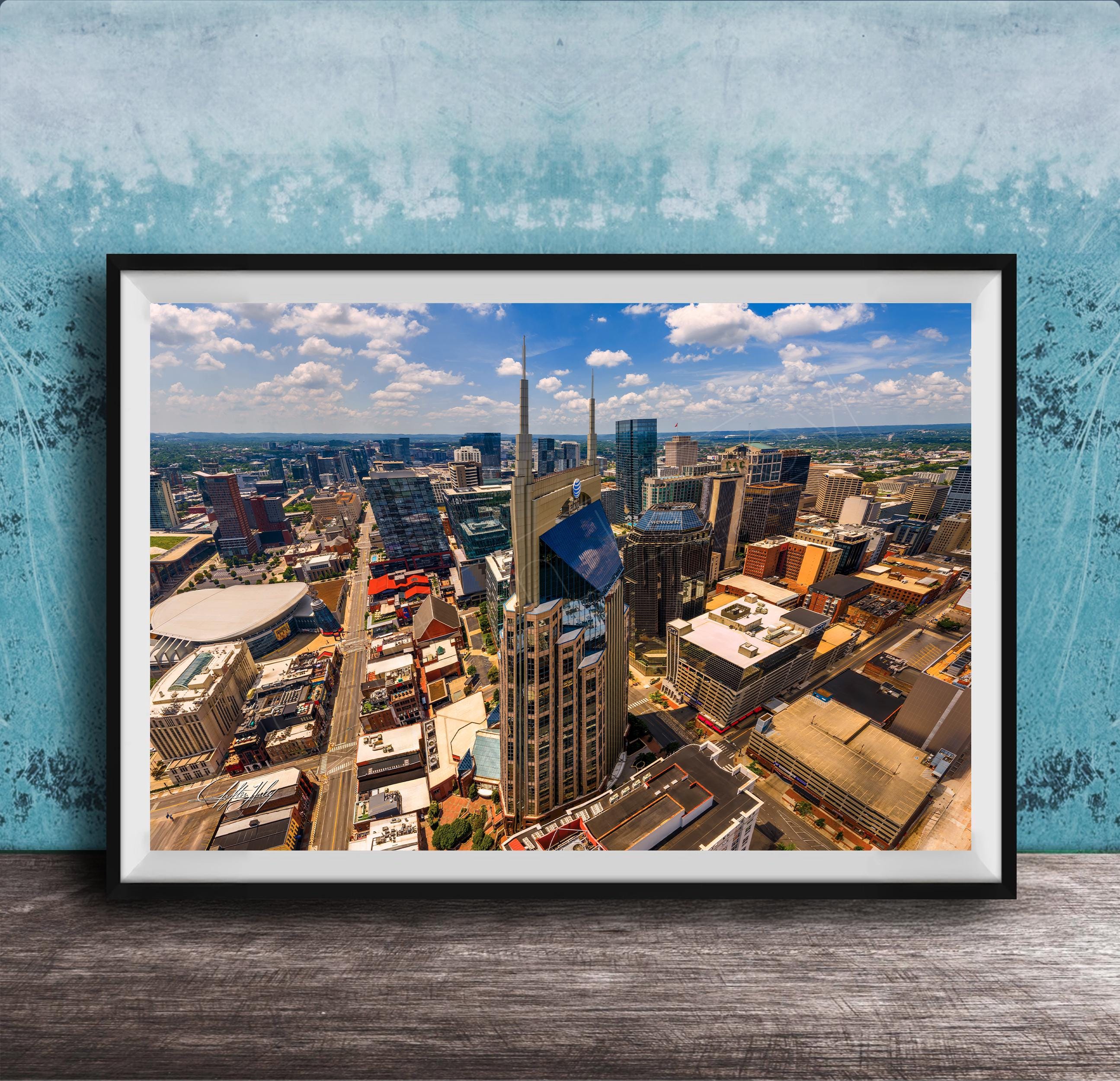 Discover the serene beauty of Nashville cityscape print, capturing a mid-day sun over the AT&T building and the iconic skyline with Downtown Nashville. This skyline wall art brings a peaceful moment to your space, perfect for fans of Music City decor.